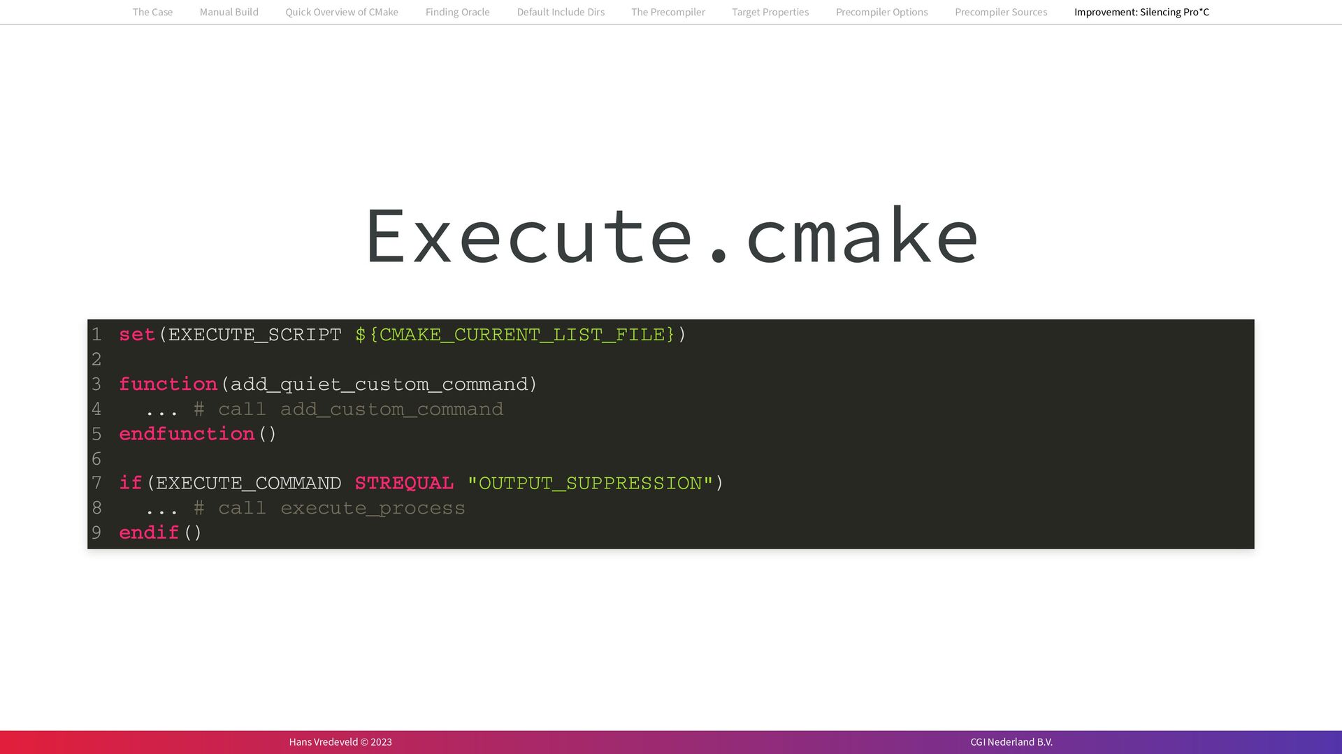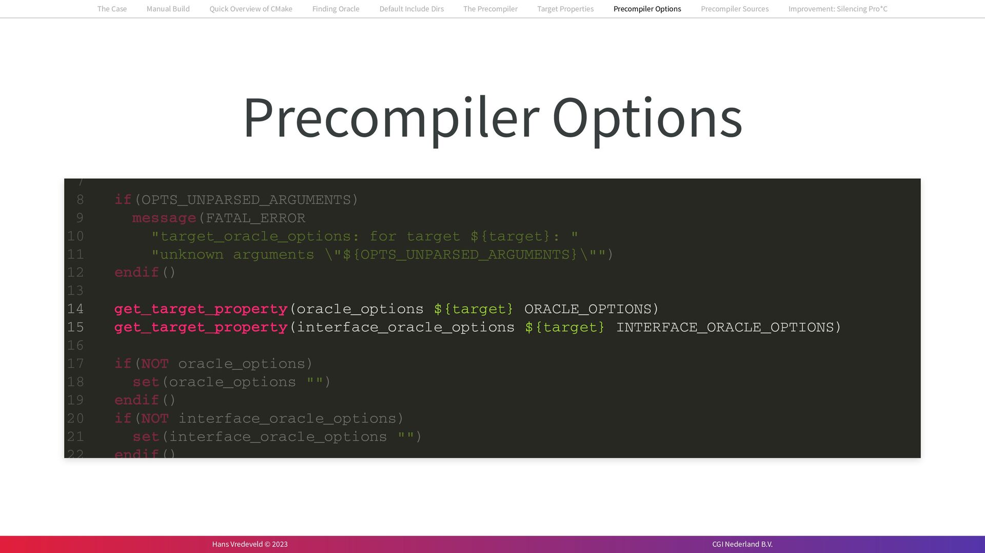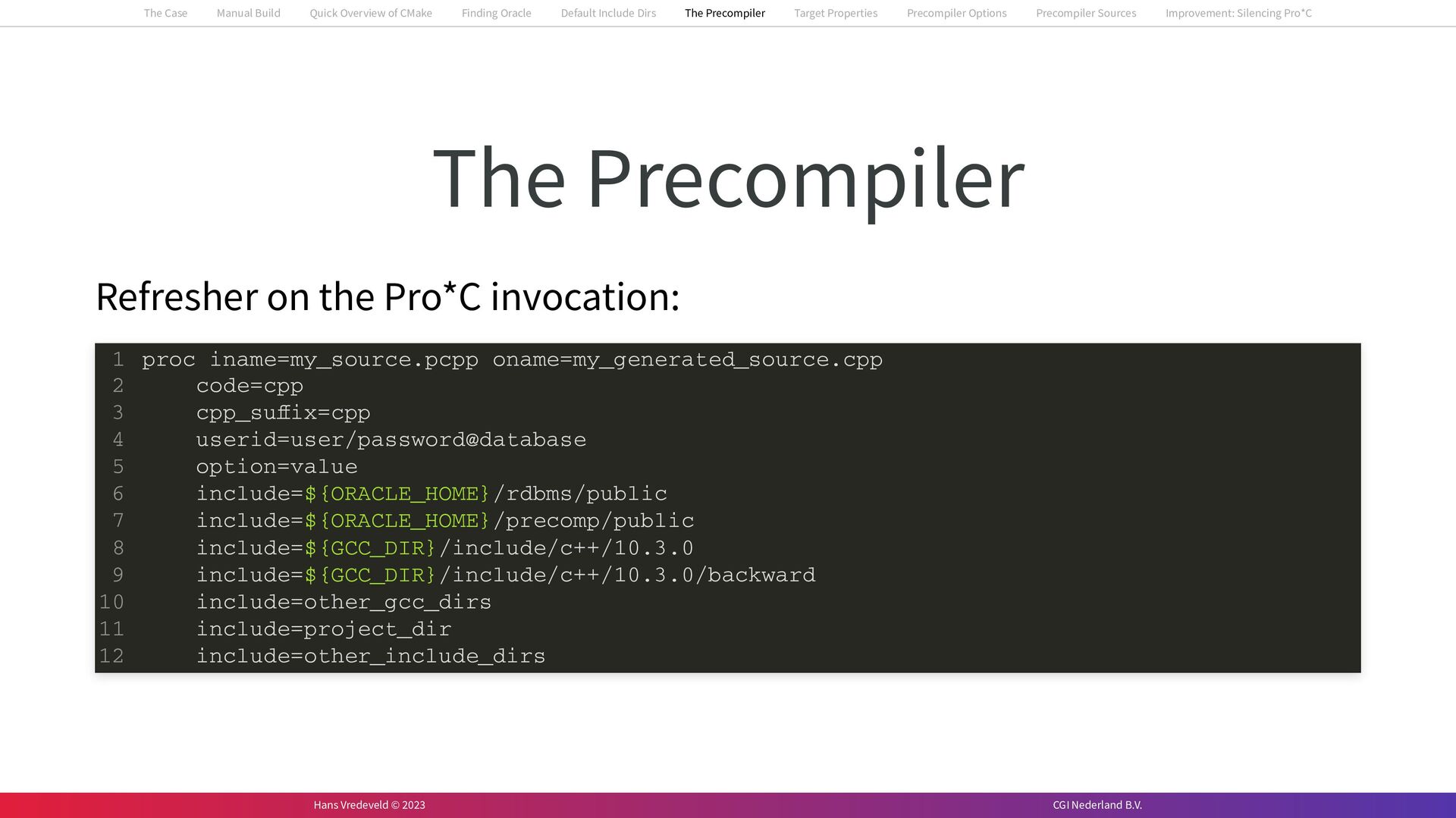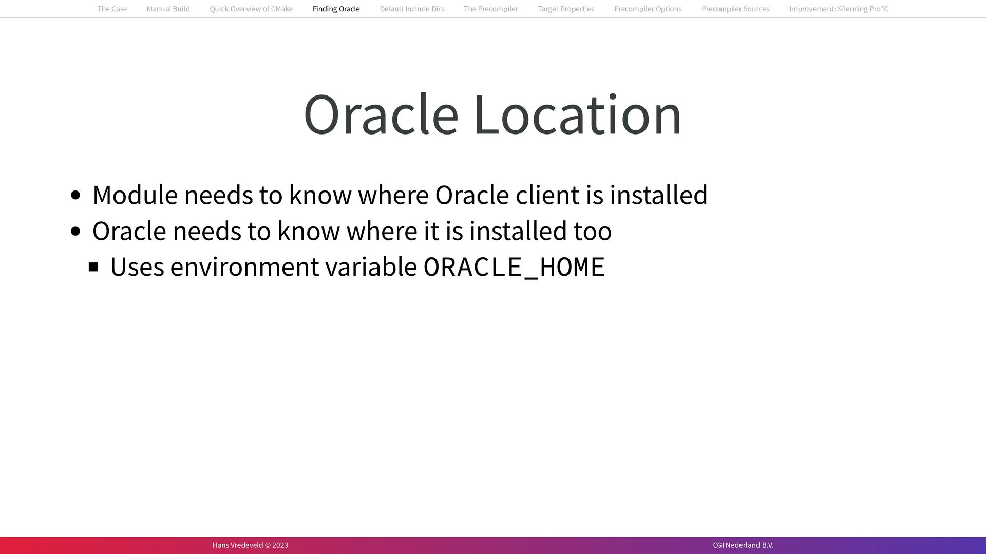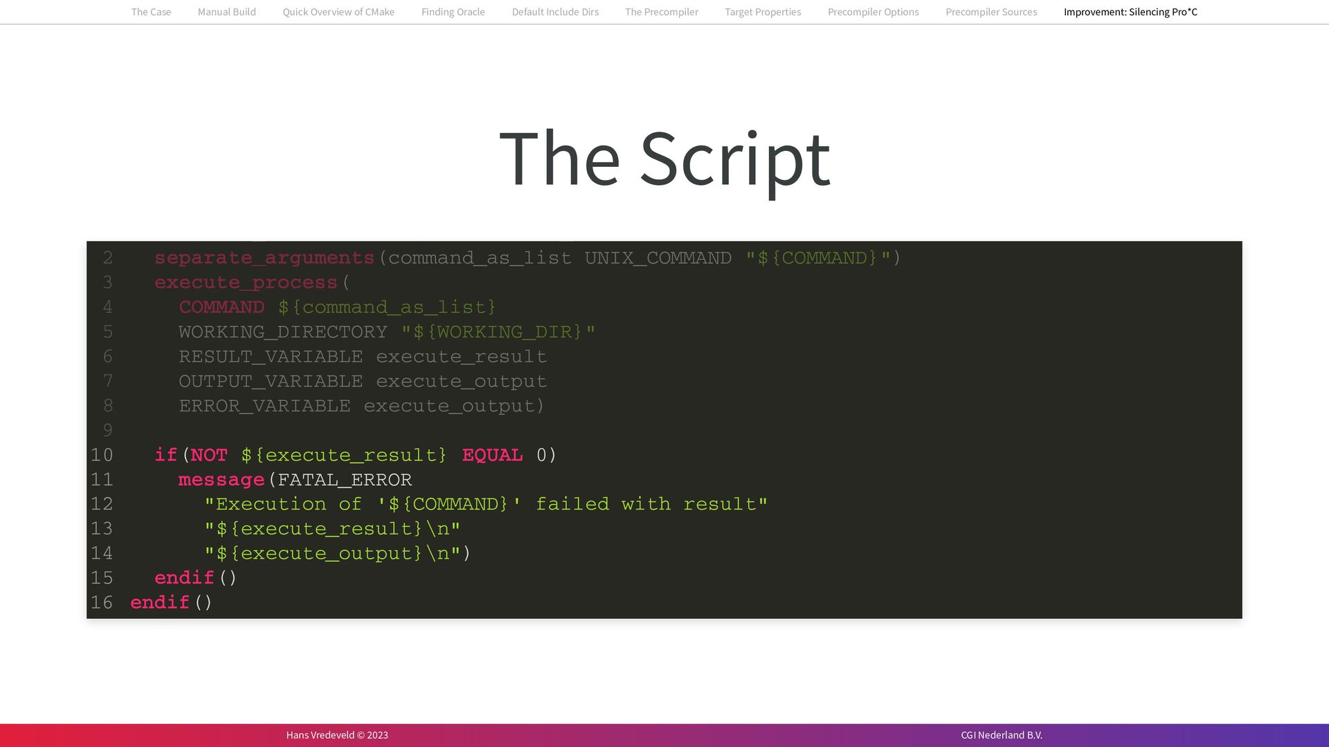 In the case study, we will look at a C++-application that uses embedded SQL to talk to an Oracle SQL-database. To build the application, it needs to link against Oracle’s client library, and the files with embedded SQL need to be converted to pure C++ before they can be compiled. How can we find that library when there is no CMake module for it yet? (We write our own!) How can we execute Oracle’s preprocessor to convert files with embedded SQL in a structured way when there are tens, or hundreds, of those files, possibly spread over different CMake targets? Come to my talk and I will tell you.
