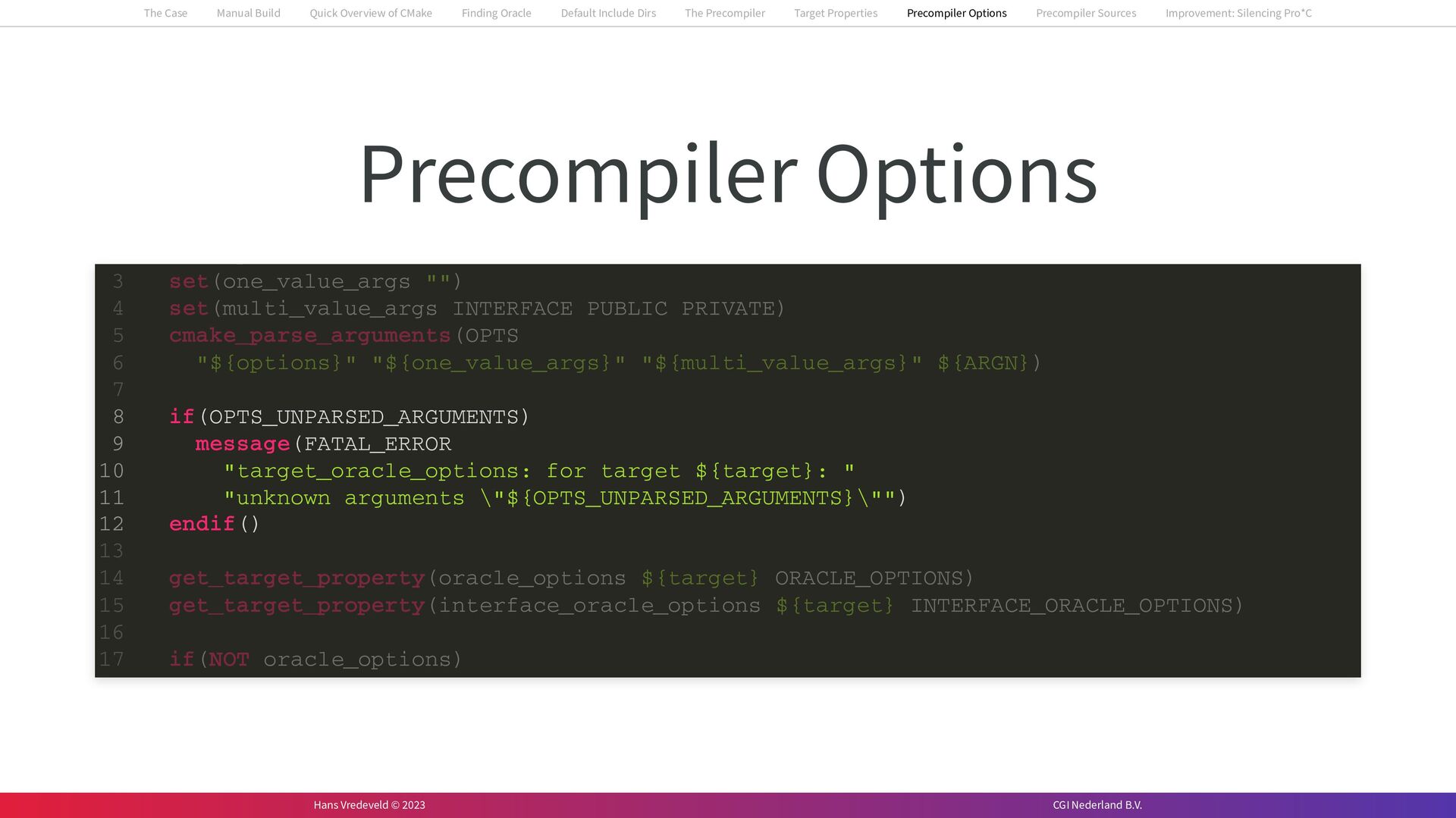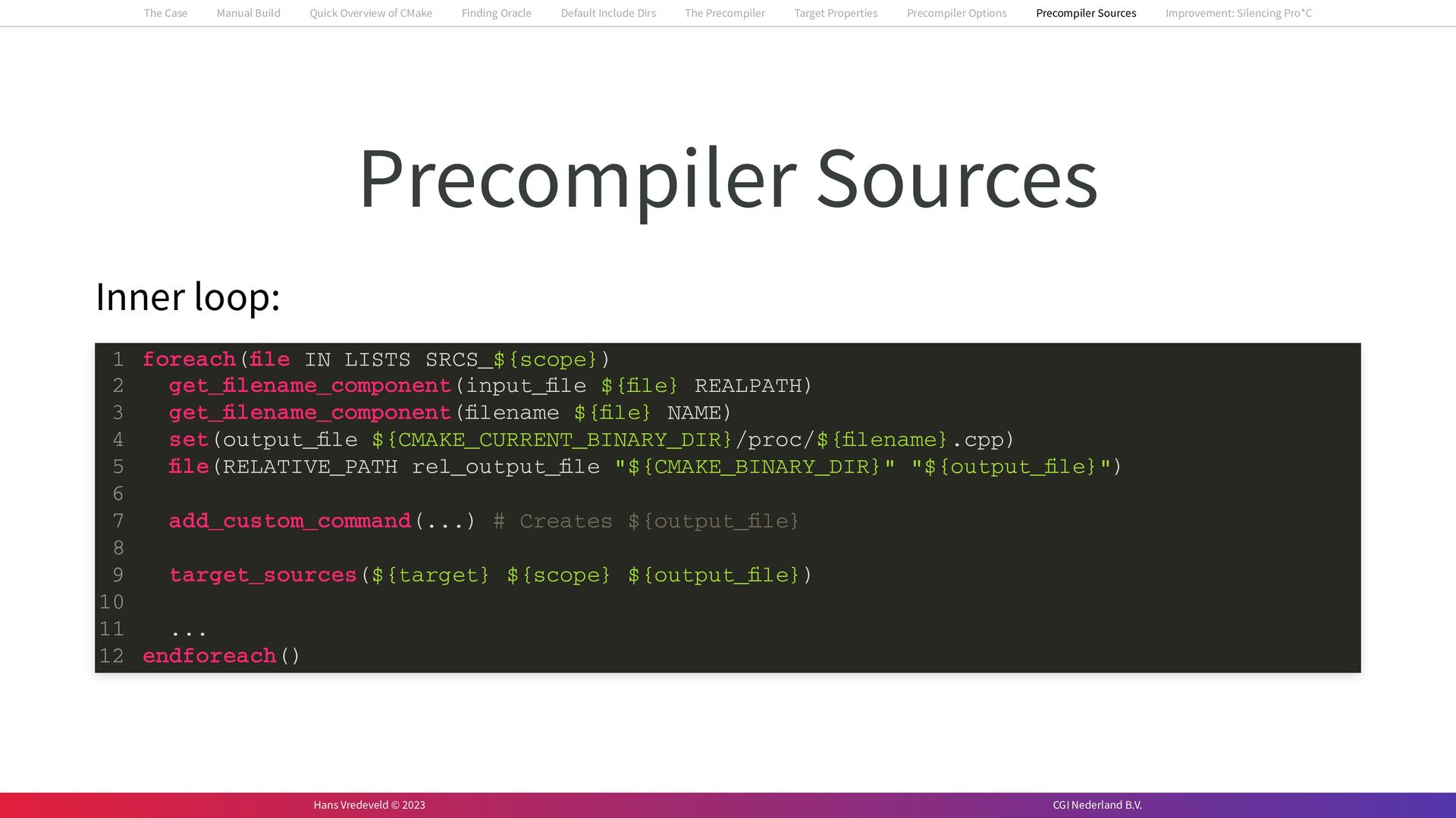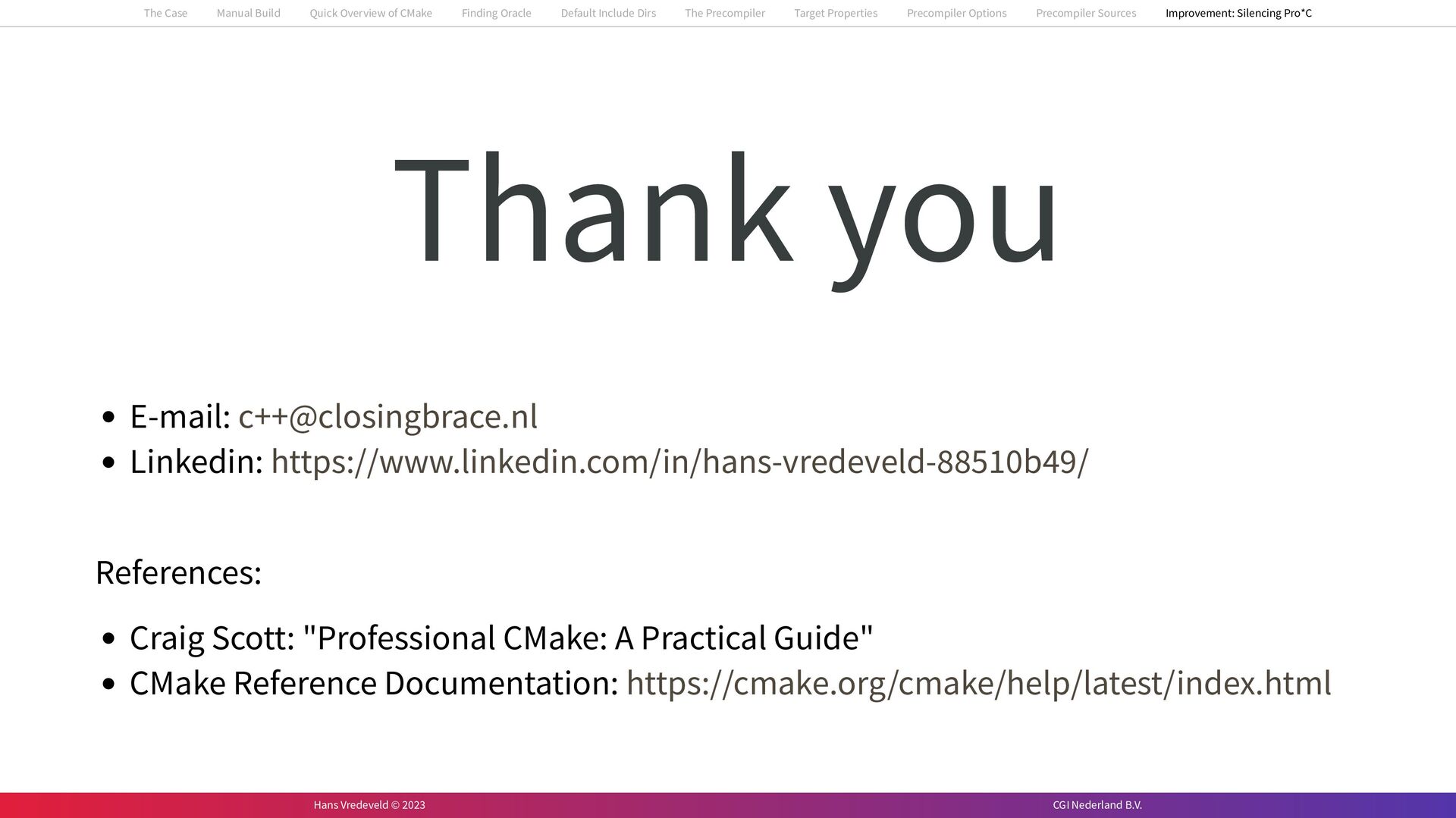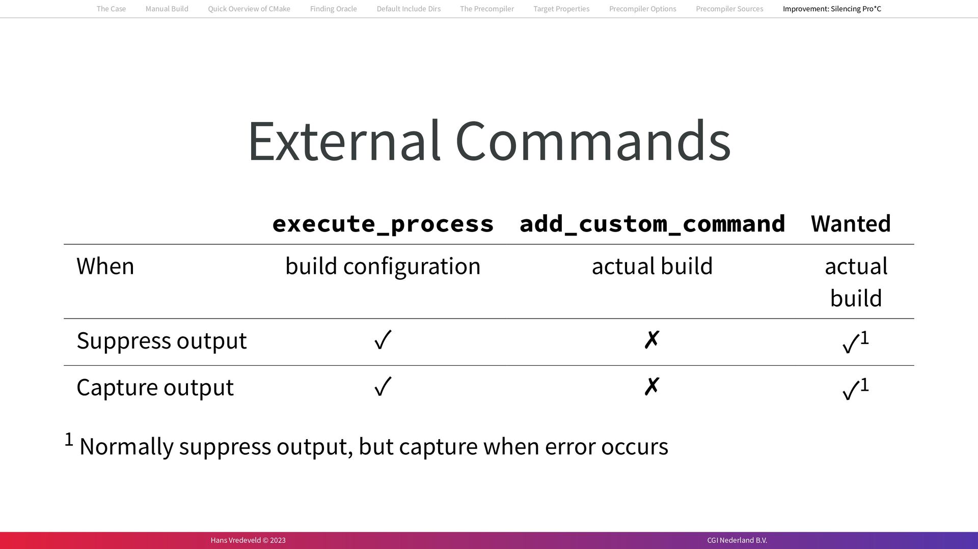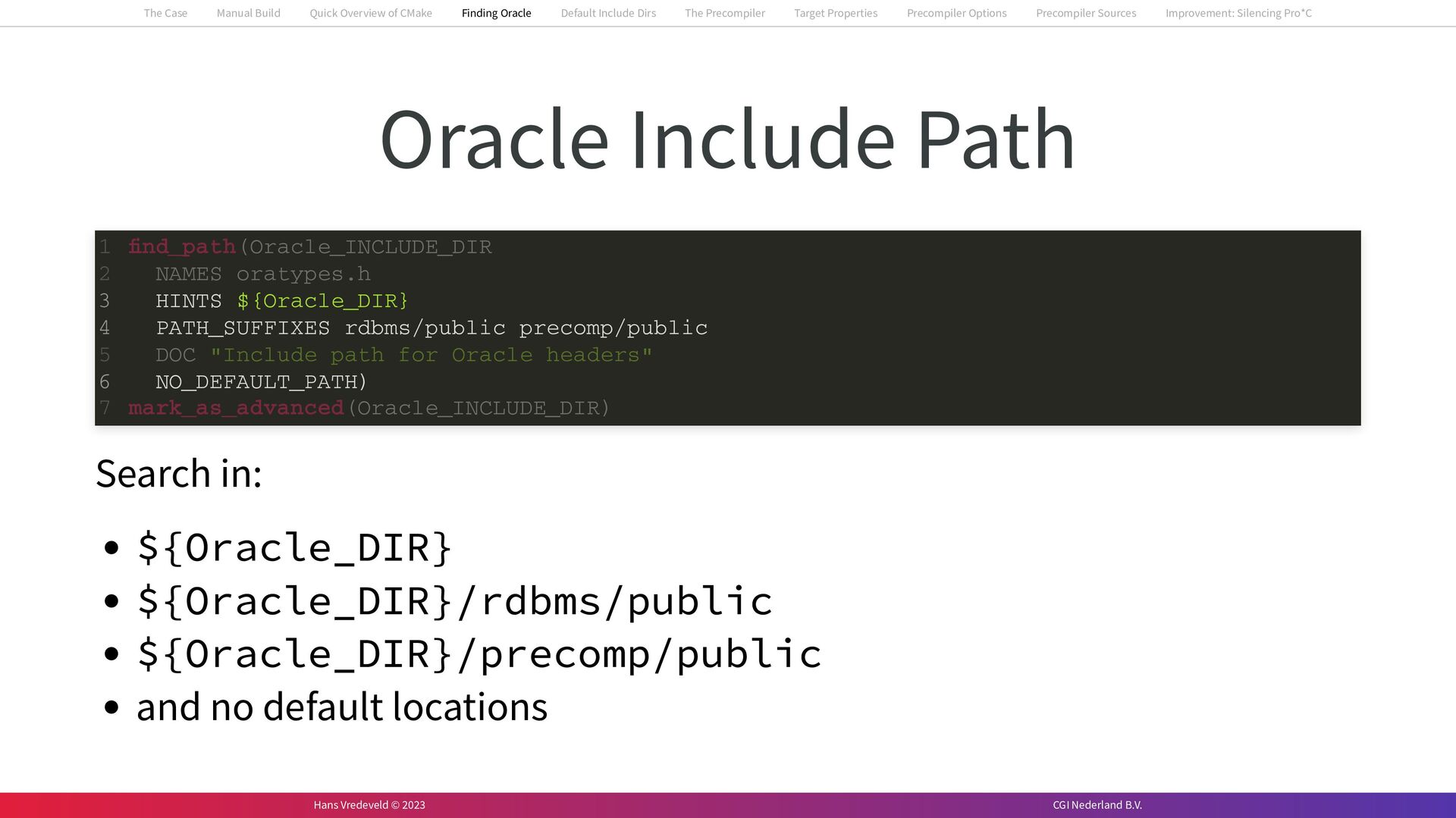 In the case study, we will look at a C++-application that uses embedded SQL to talk to an Oracle SQL-database. To build the application, it needs to link against Oracle’s client library, and the files with embedded SQL need to be converted to pure C++ before they can be compiled. How can we find that library when there is no CMake module for it yet? (We write our own!) How can we execute Oracle’s preprocessor to convert files with embedded SQL in a structured way when there are tens, or hundreds, of those files, possibly spread over different CMake targets? Come to my talk and I will tell you.