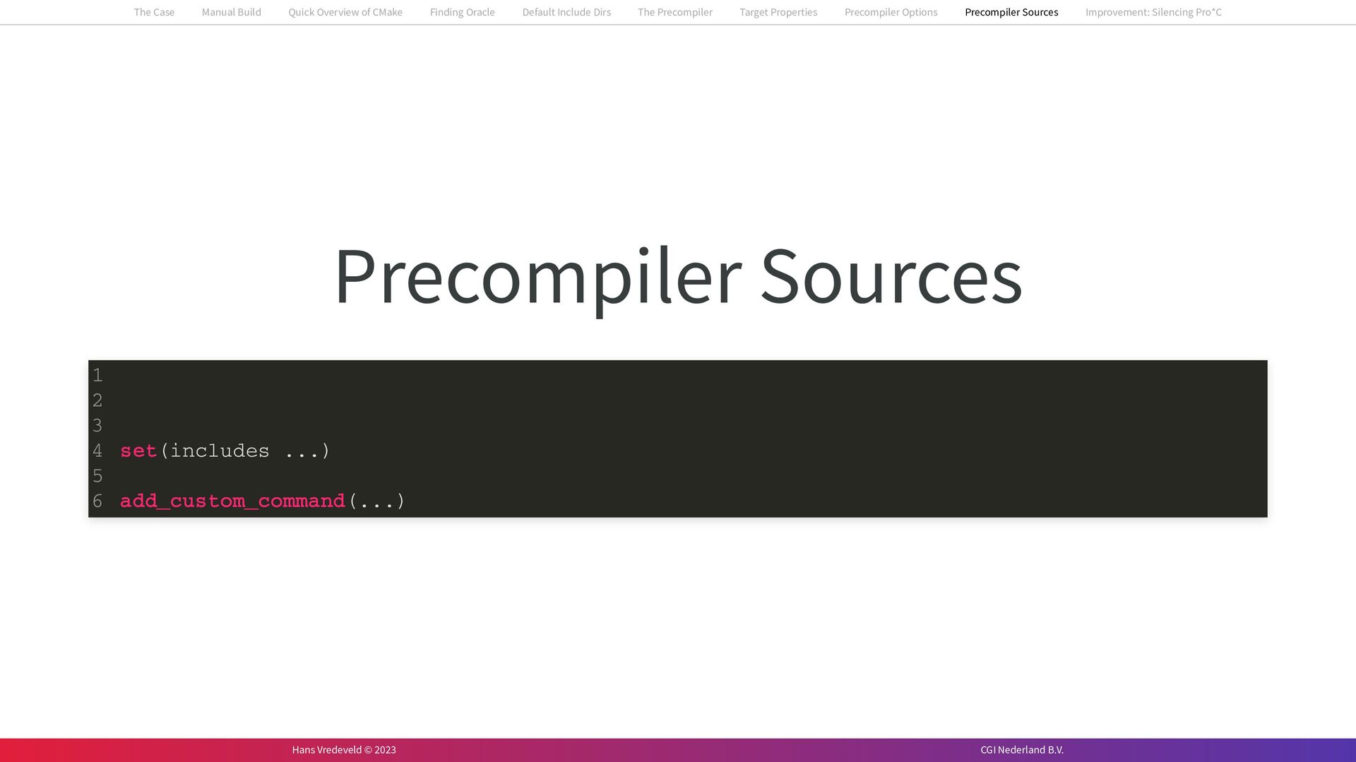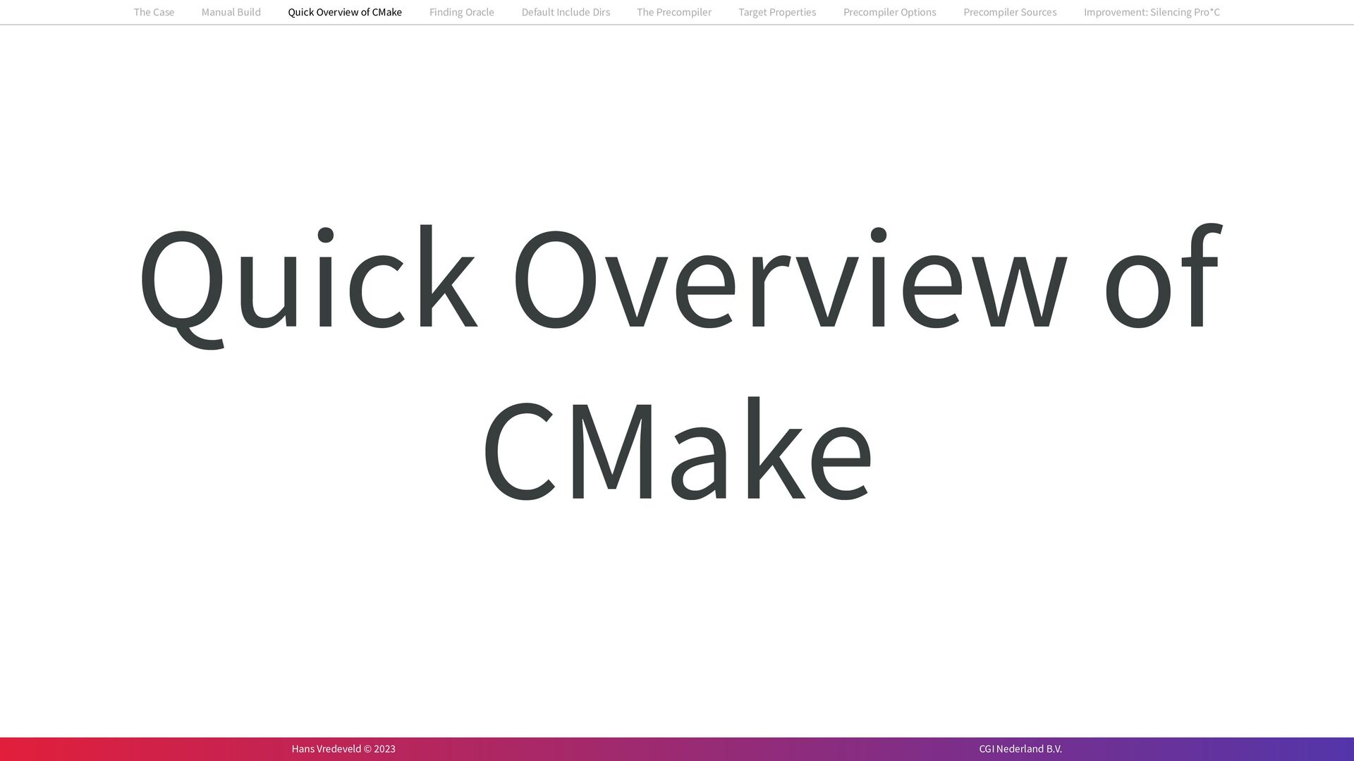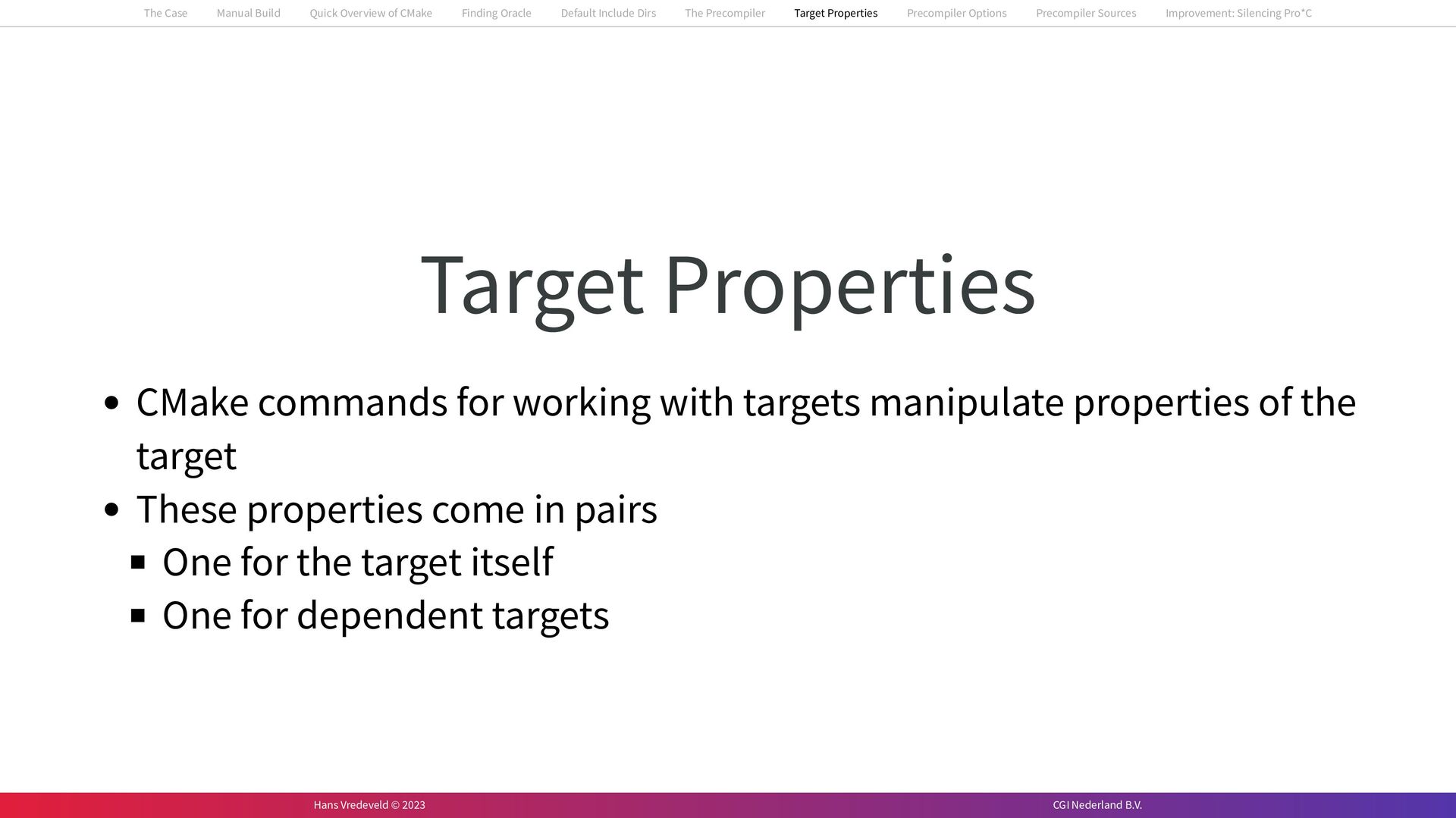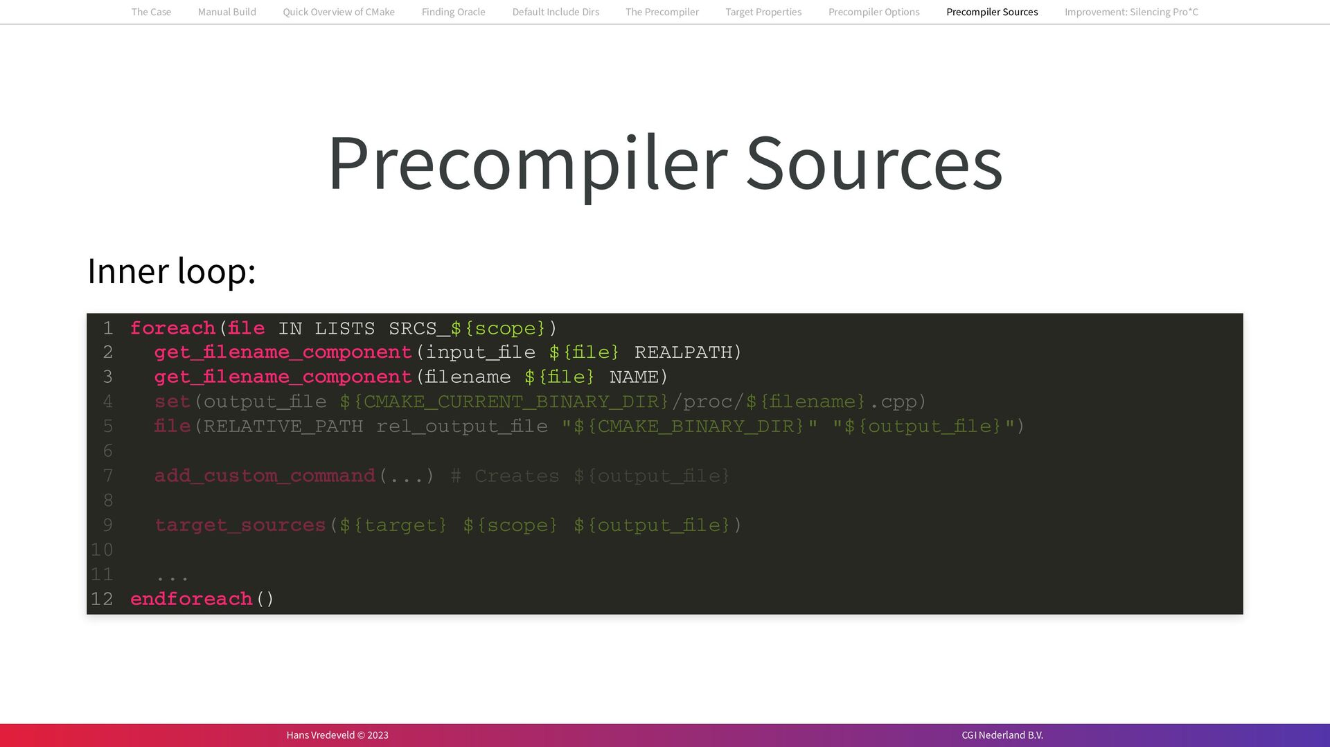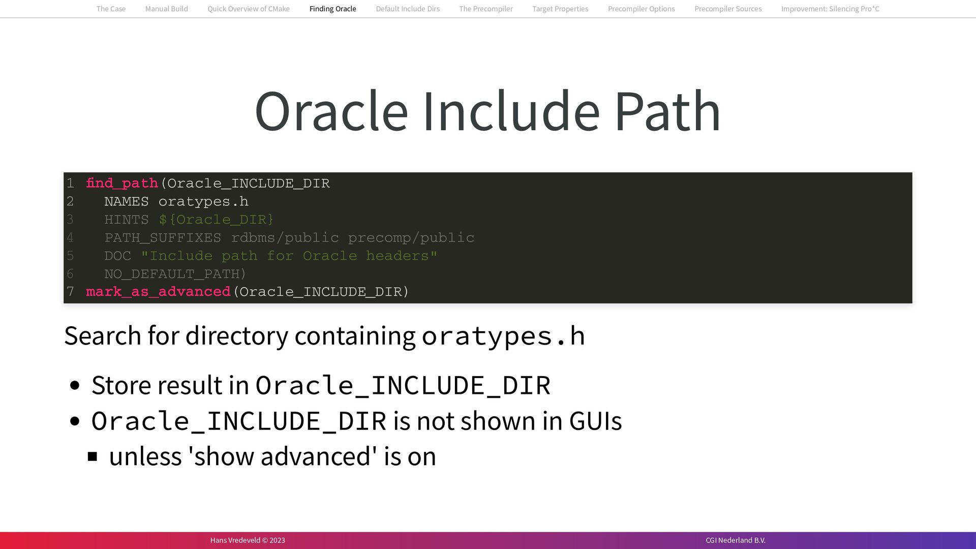 In the case study, we will look at a C++-application that uses embedded SQL to talk to an Oracle SQL-database. To build the application, it needs to link against Oracle’s client library, and the files with embedded SQL need to be converted to pure C++ before they can be compiled. How can we find that library when there is no CMake module for it yet? (We write our own!) How can we execute Oracle’s preprocessor to convert files with embedded SQL in a structured way when there are tens, or hundreds, of those files, possibly spread over different CMake targets? Come to my talk and I will tell you.