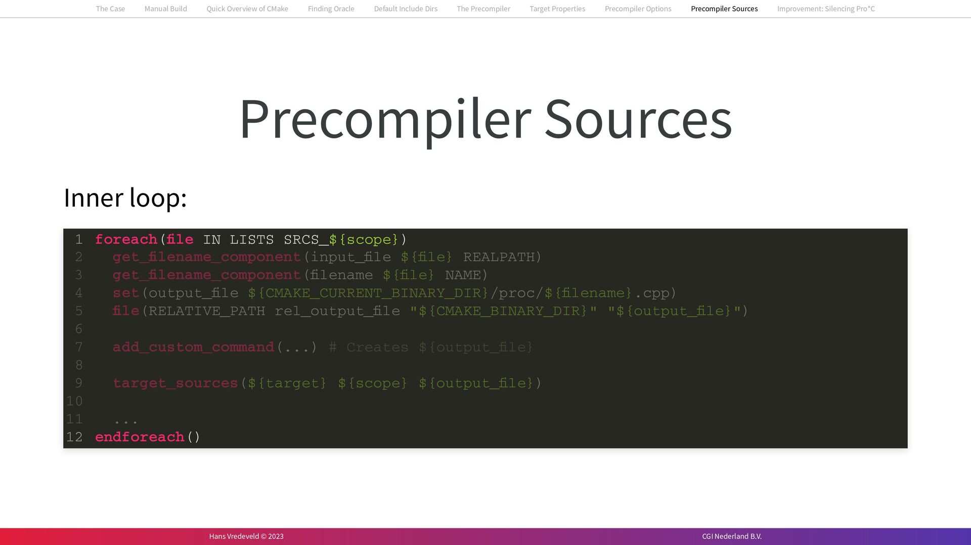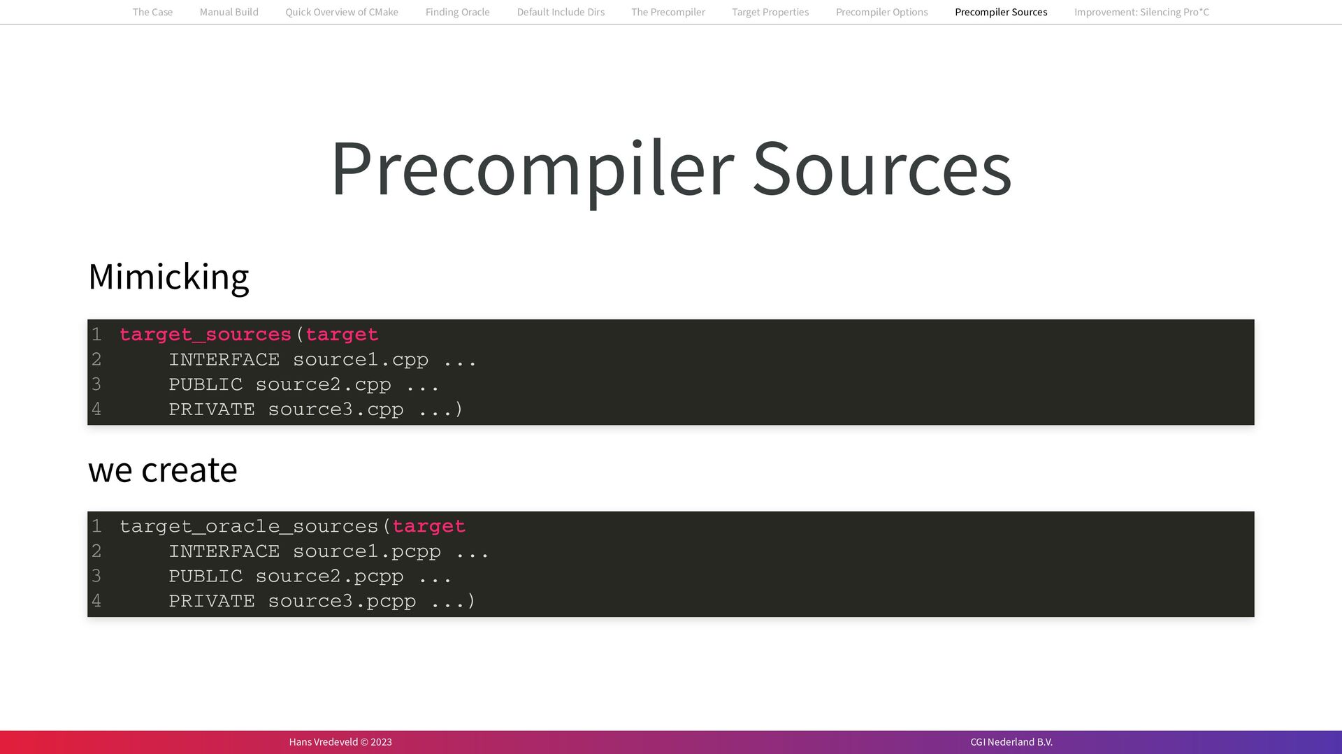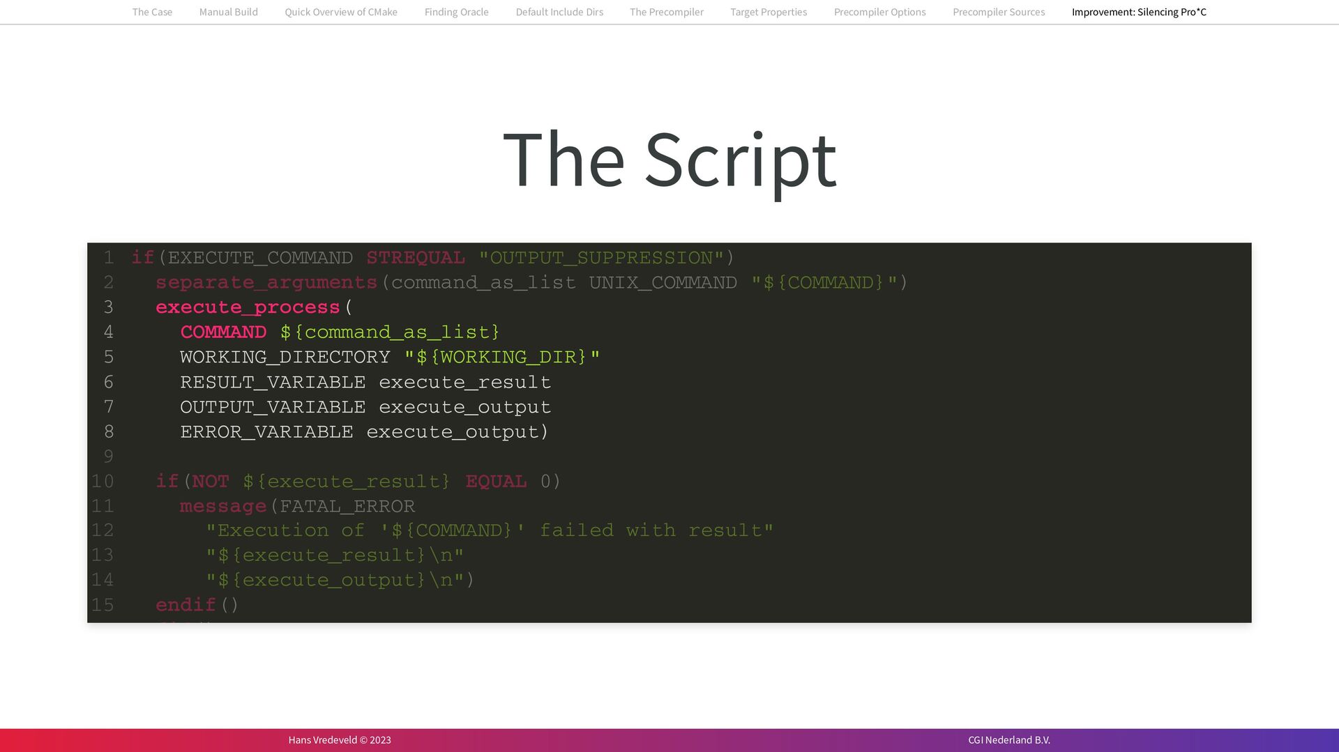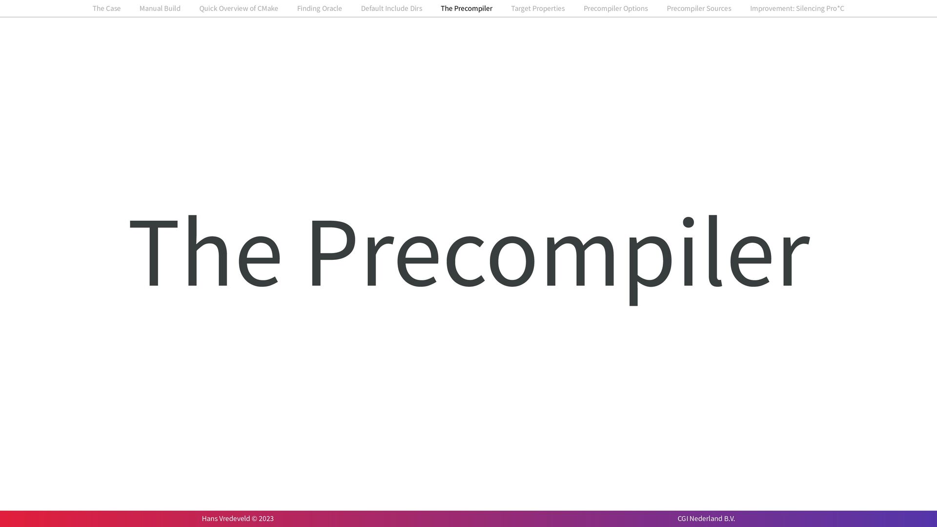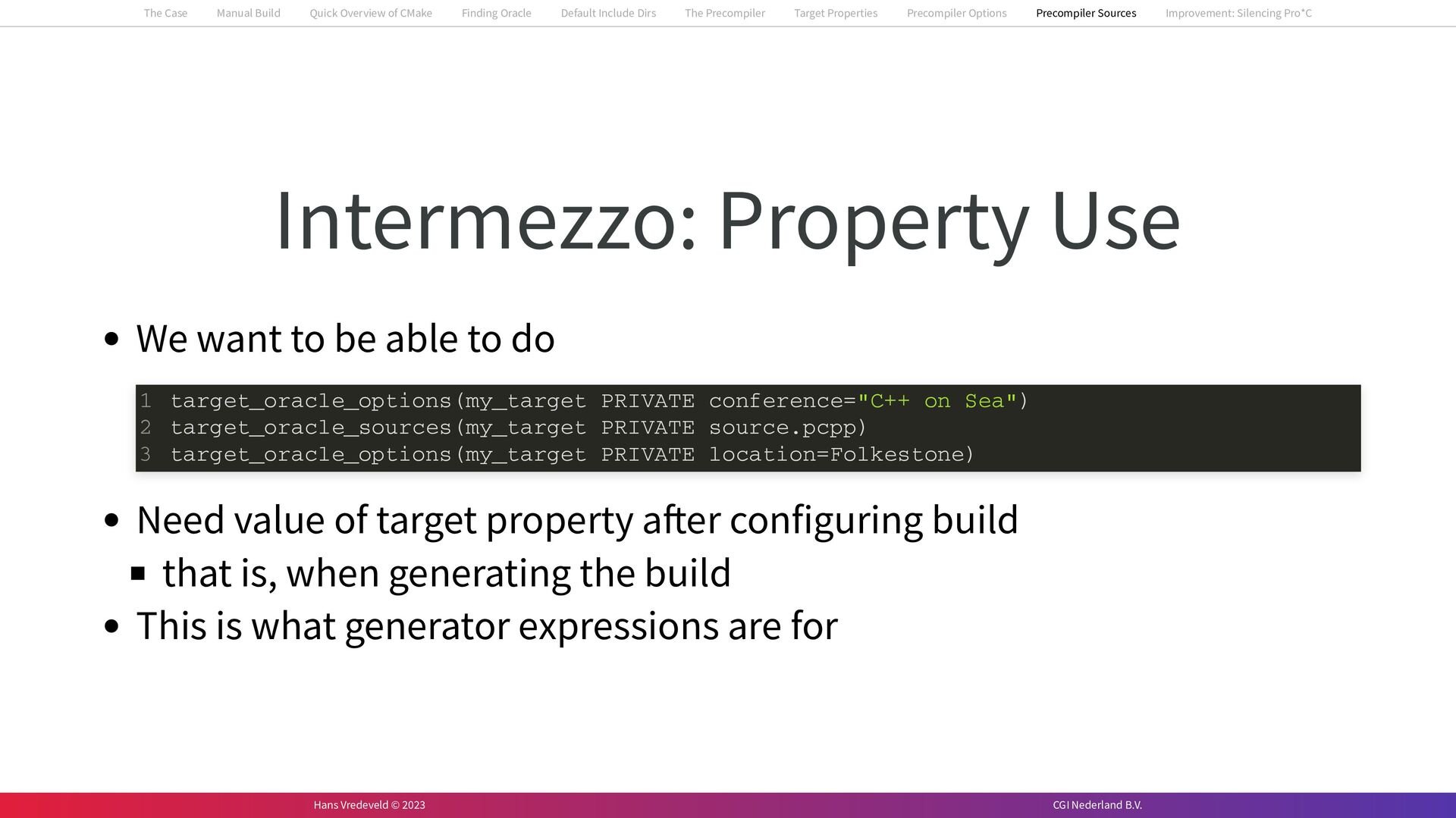 In the case study, we will look at a C++-application that uses embedded SQL to talk to an Oracle SQL-database. To build the application, it needs to link against Oracle’s client library, and the files with embedded SQL need to be converted to pure C++ before they can be compiled. How can we find that library when there is no CMake module for it yet? (We write our own!) How can we execute Oracle’s preprocessor to convert files with embedded SQL in a structured way when there are tens, or hundreds, of those files, possibly spread over different CMake targets? Come to my talk and I will tell you.