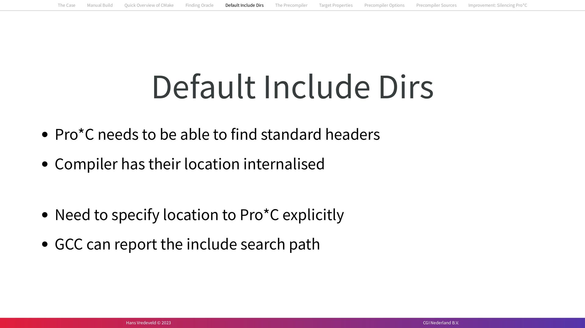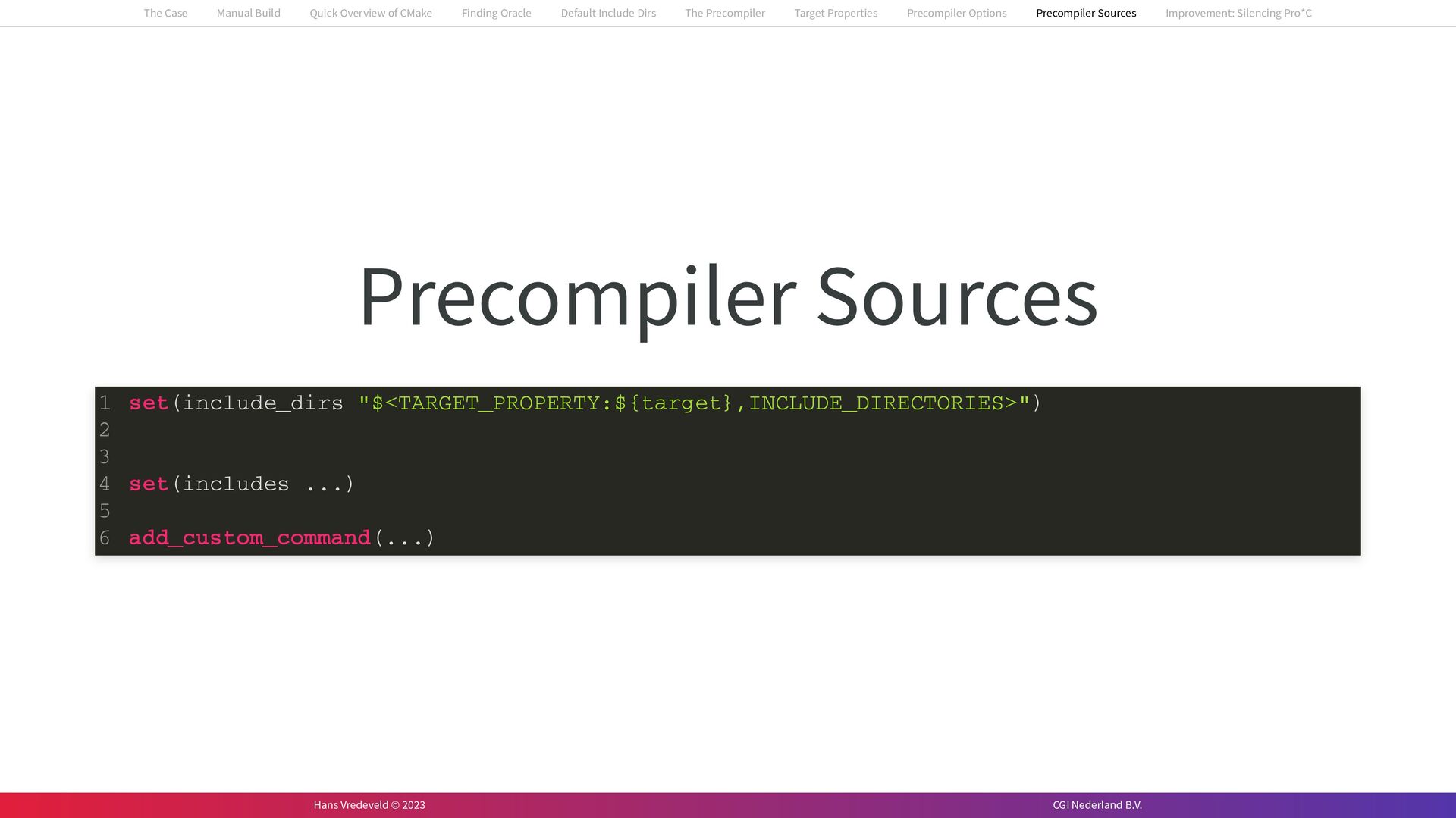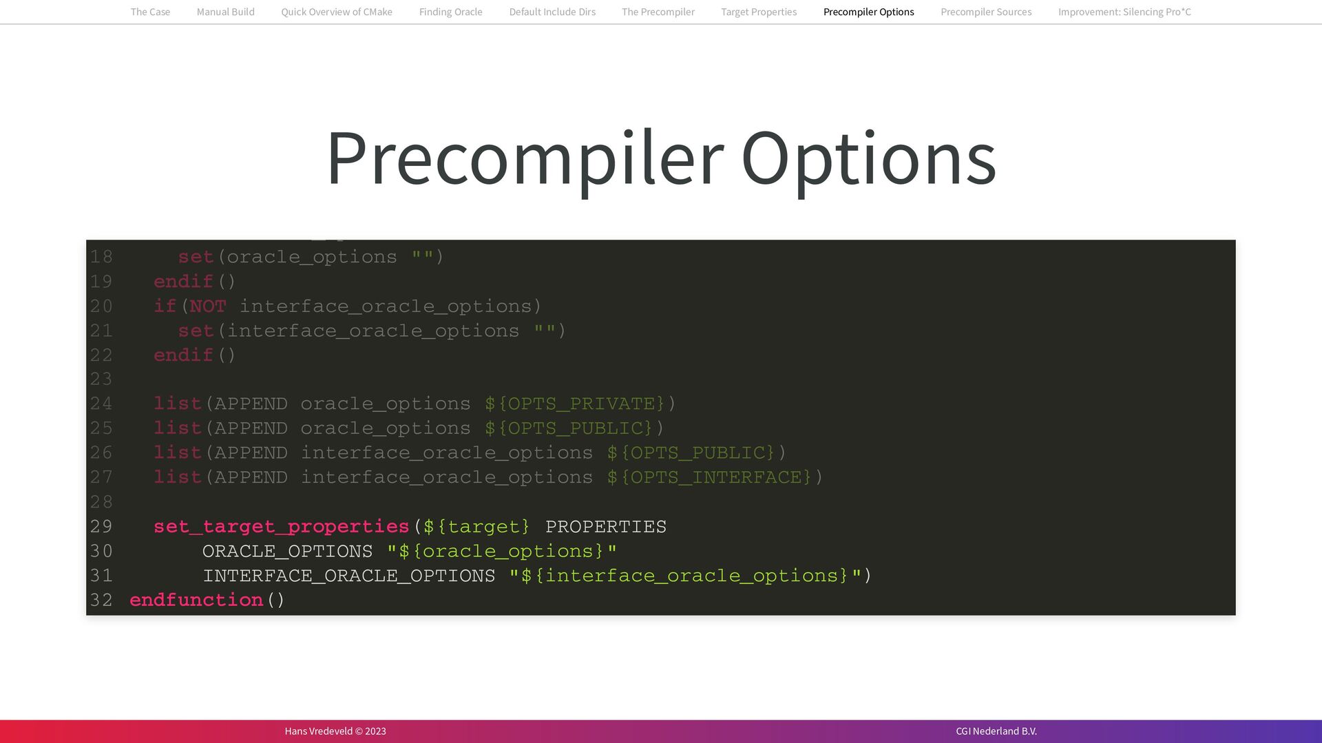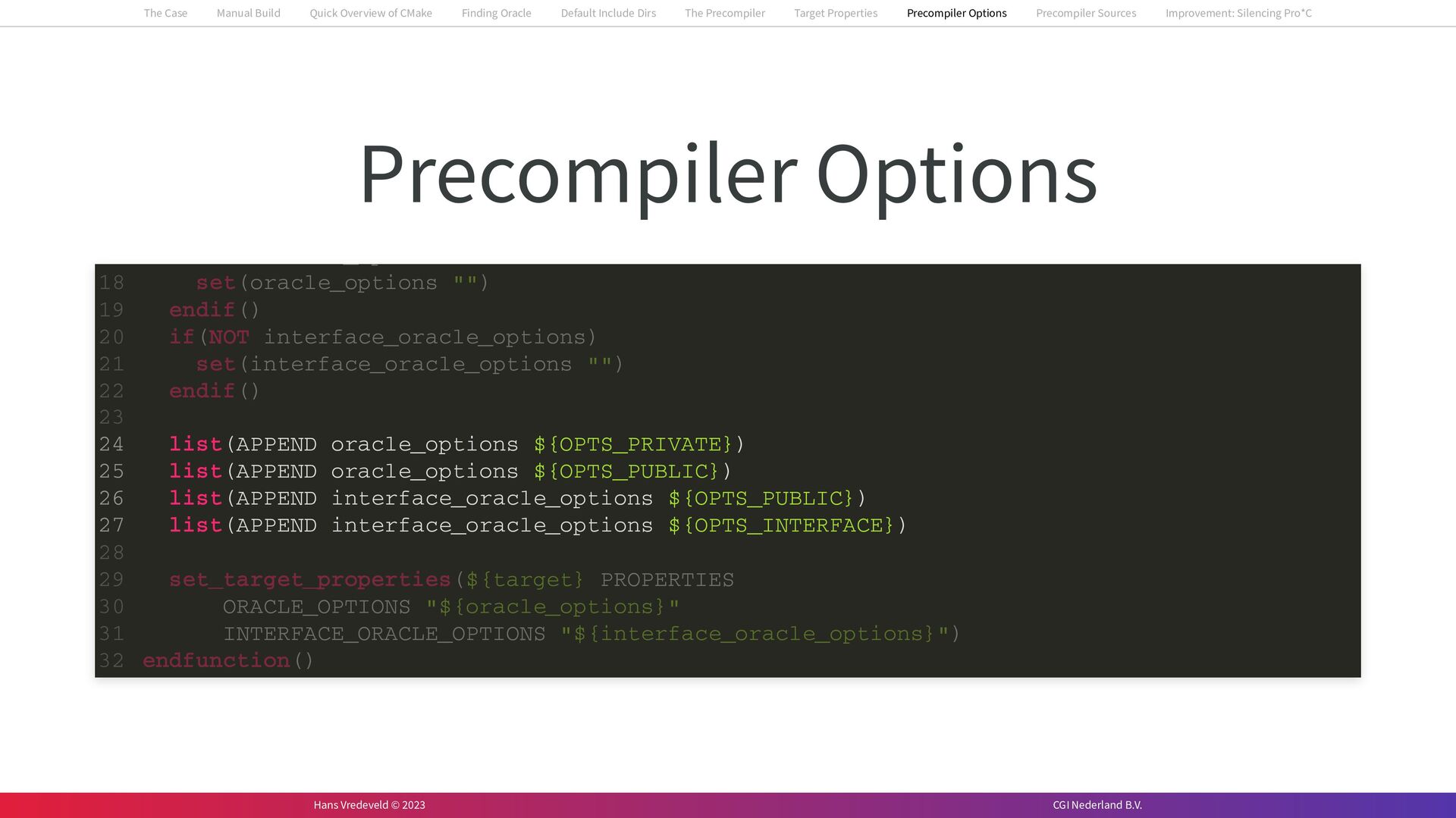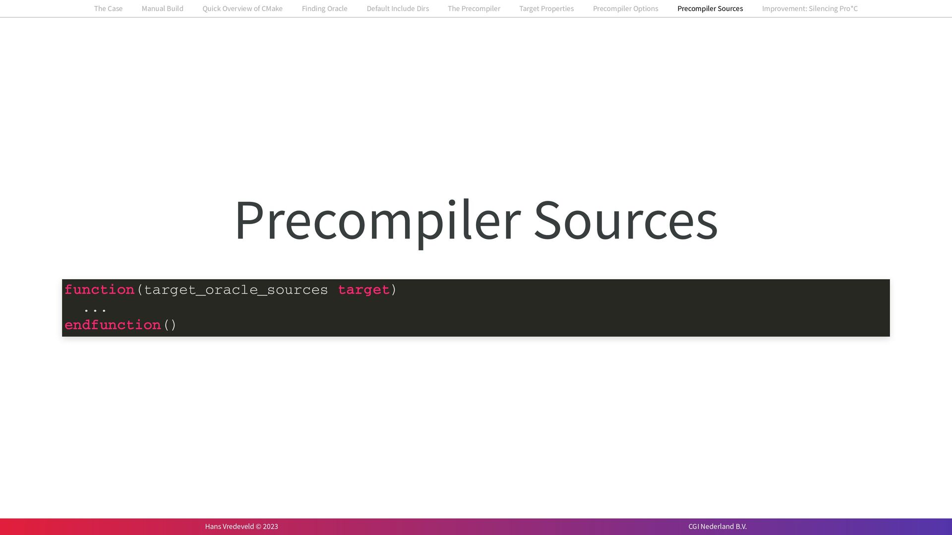 In the case study, we will look at a C++-application that uses embedded SQL to talk to an Oracle SQL-database. To build the application, it needs to link against Oracle’s client library, and the files with embedded SQL need to be converted to pure C++ before they can be compiled. How can we find that library when there is no CMake module for it yet? (We write our own!) How can we execute Oracle’s preprocessor to convert files with embedded SQL in a structured way when there are tens, or hundreds, of those files, possibly spread over different CMake targets? Come to my talk and I will tell you.