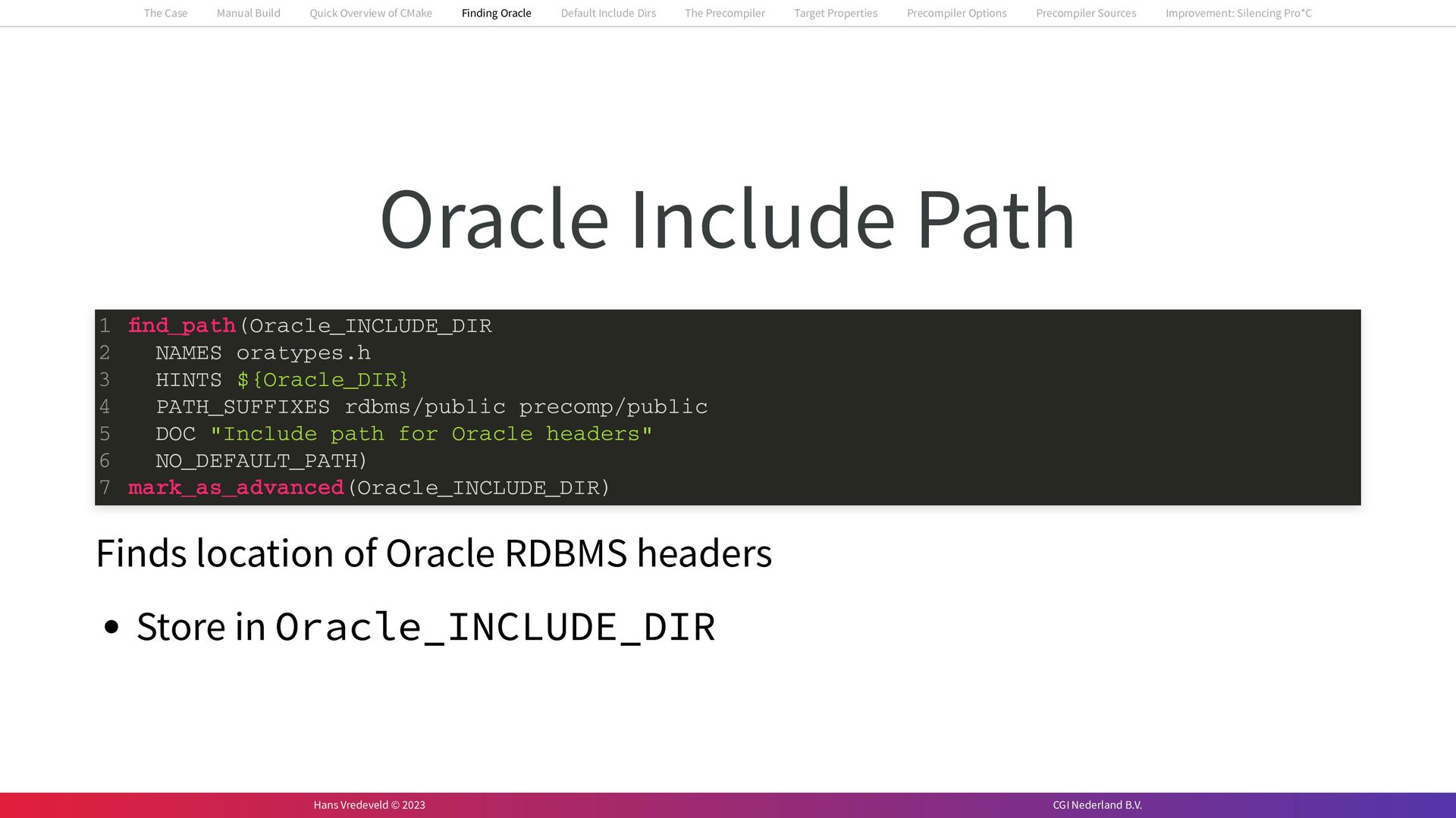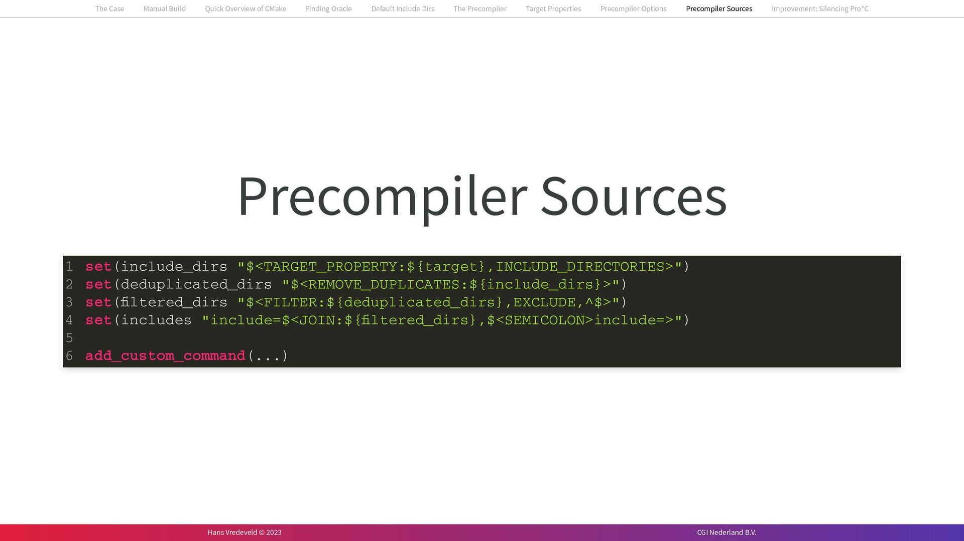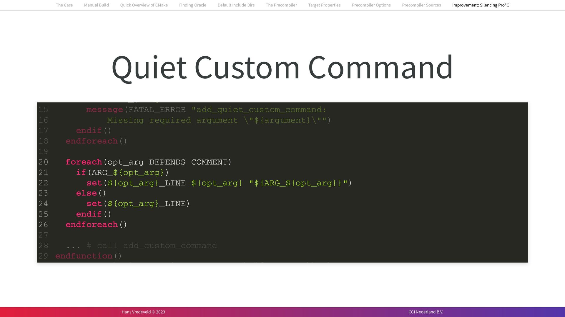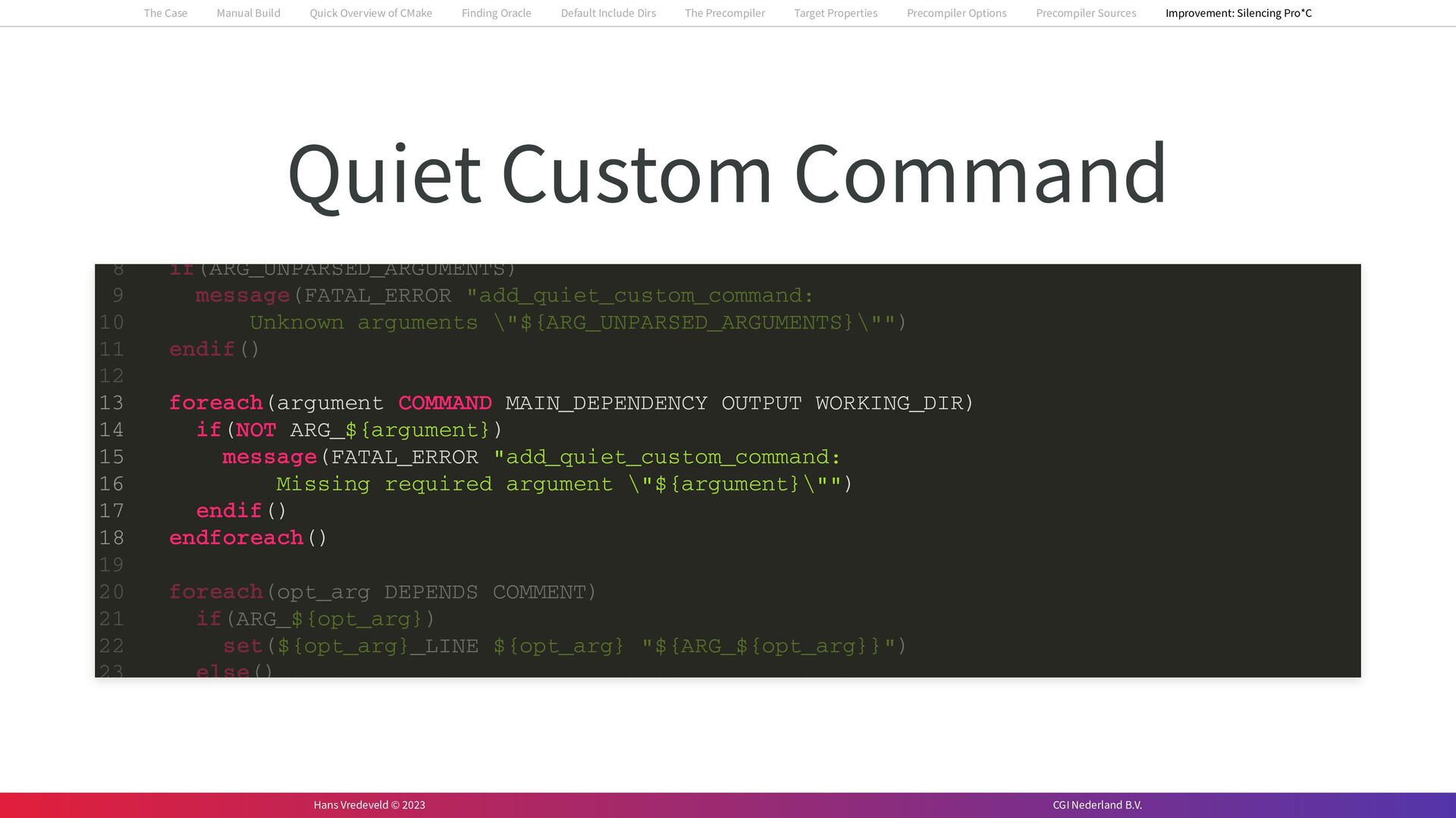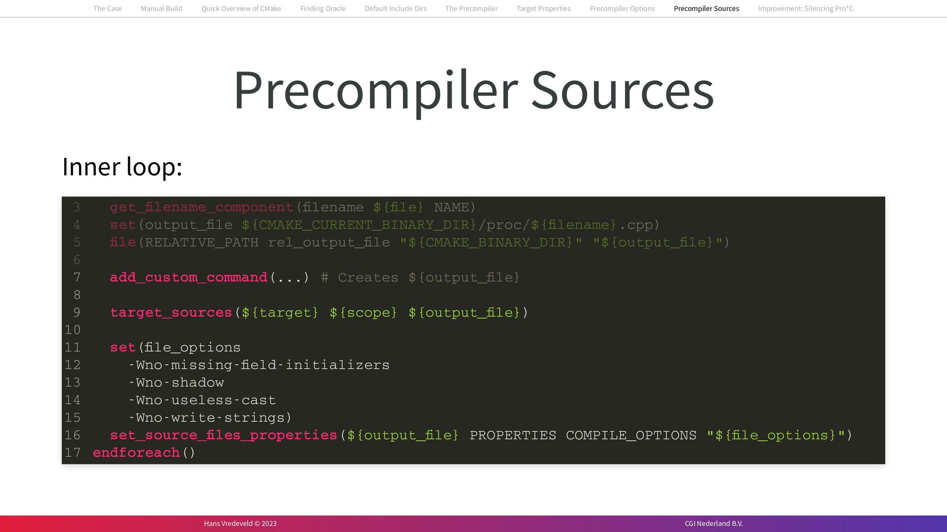 In the case study, we will look at a C++-application that uses embedded SQL to talk to an Oracle SQL-database. To build the application, it needs to link against Oracle’s client library, and the files with embedded SQL need to be converted to pure C++ before they can be compiled. How can we find that library when there is no CMake module for it yet? (We write our own!) How can we execute Oracle’s preprocessor to convert files with embedded SQL in a structured way when there are tens, or hundreds, of those files, possibly spread over different CMake targets? Come to my talk and I will tell you.
