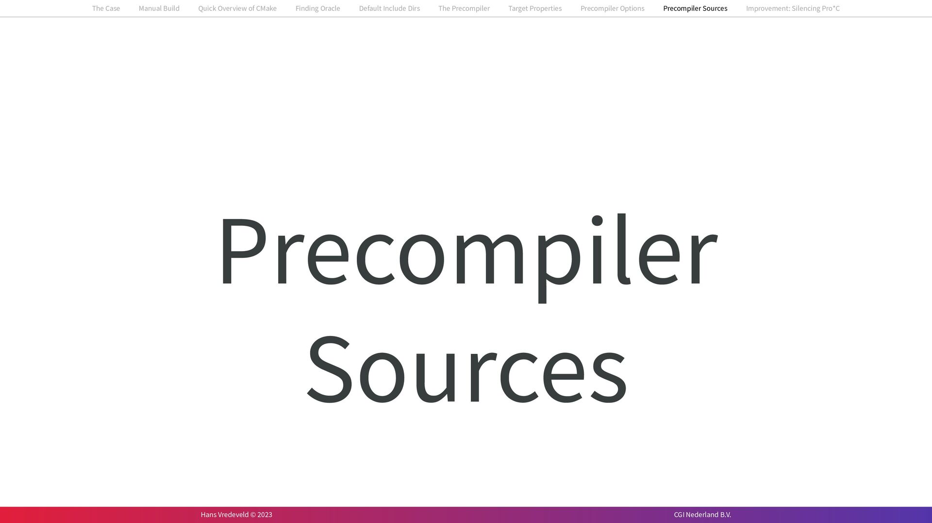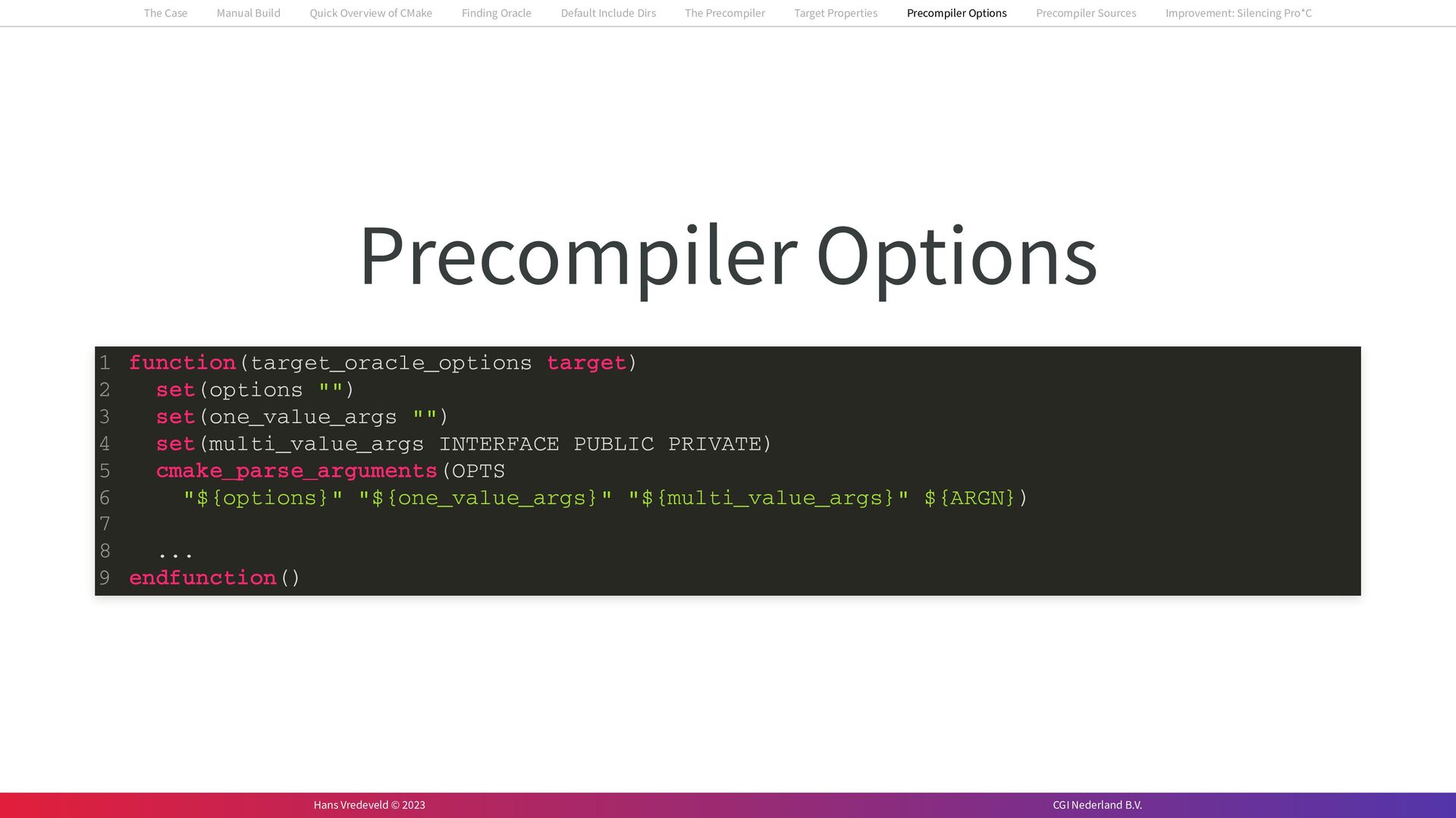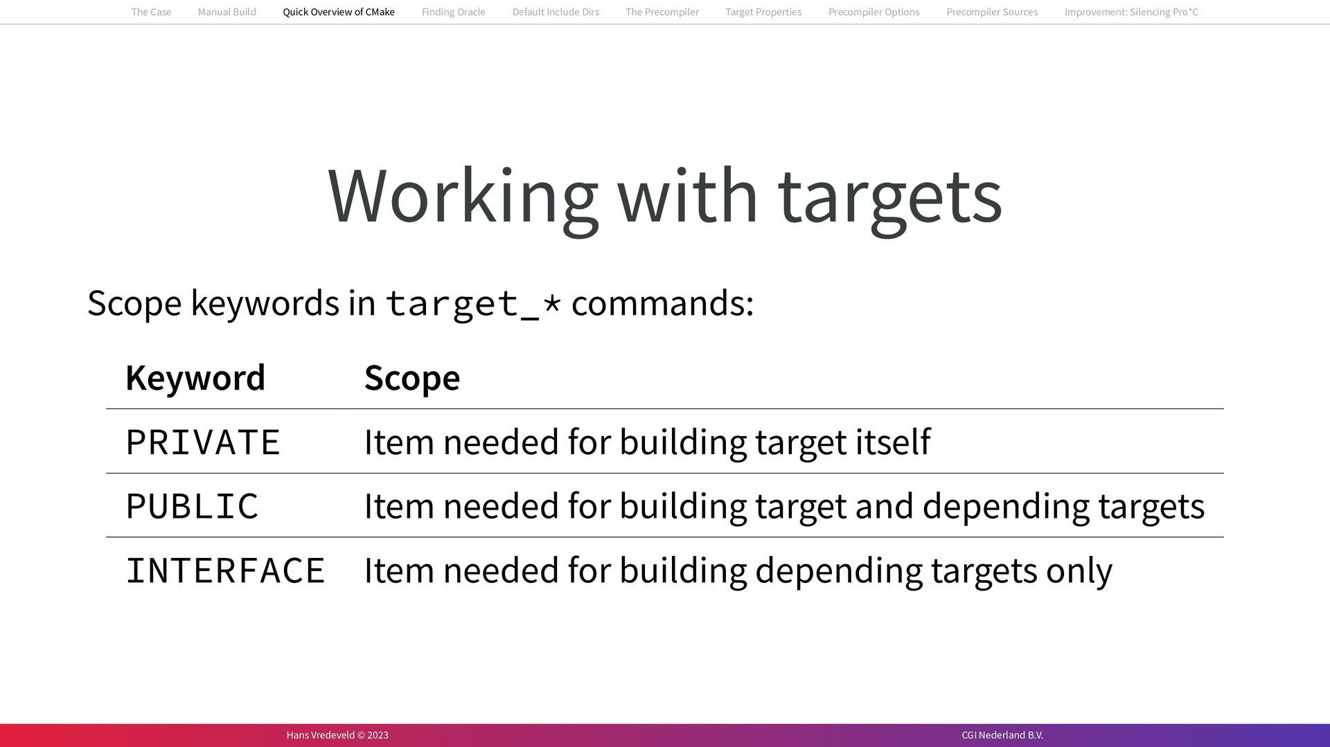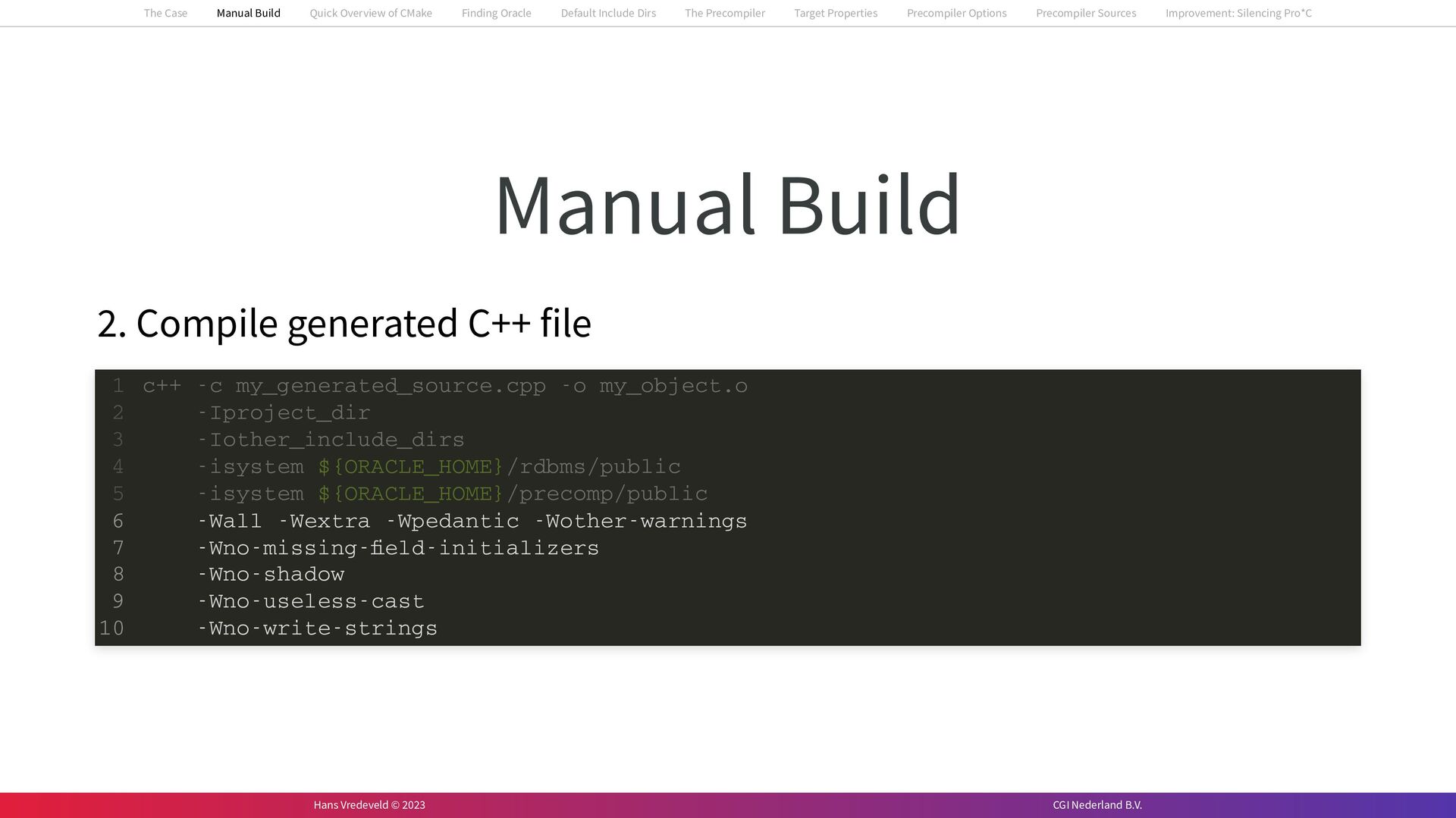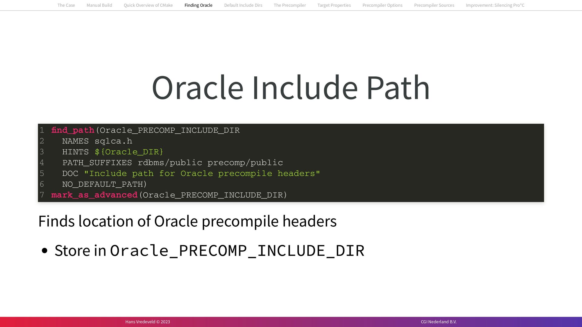 In the case study, we will look at a C++-application that uses embedded SQL to talk to an Oracle SQL-database. To build the application, it needs to link against Oracle’s client library, and the files with embedded SQL need to be converted to pure C++ before they can be compiled. How can we find that library when there is no CMake module for it yet? (We write our own!) How can we execute Oracle’s preprocessor to convert files with embedded SQL in a structured way when there are tens, or hundreds, of those files, possibly spread over different CMake targets? Come to my talk and I will tell you.