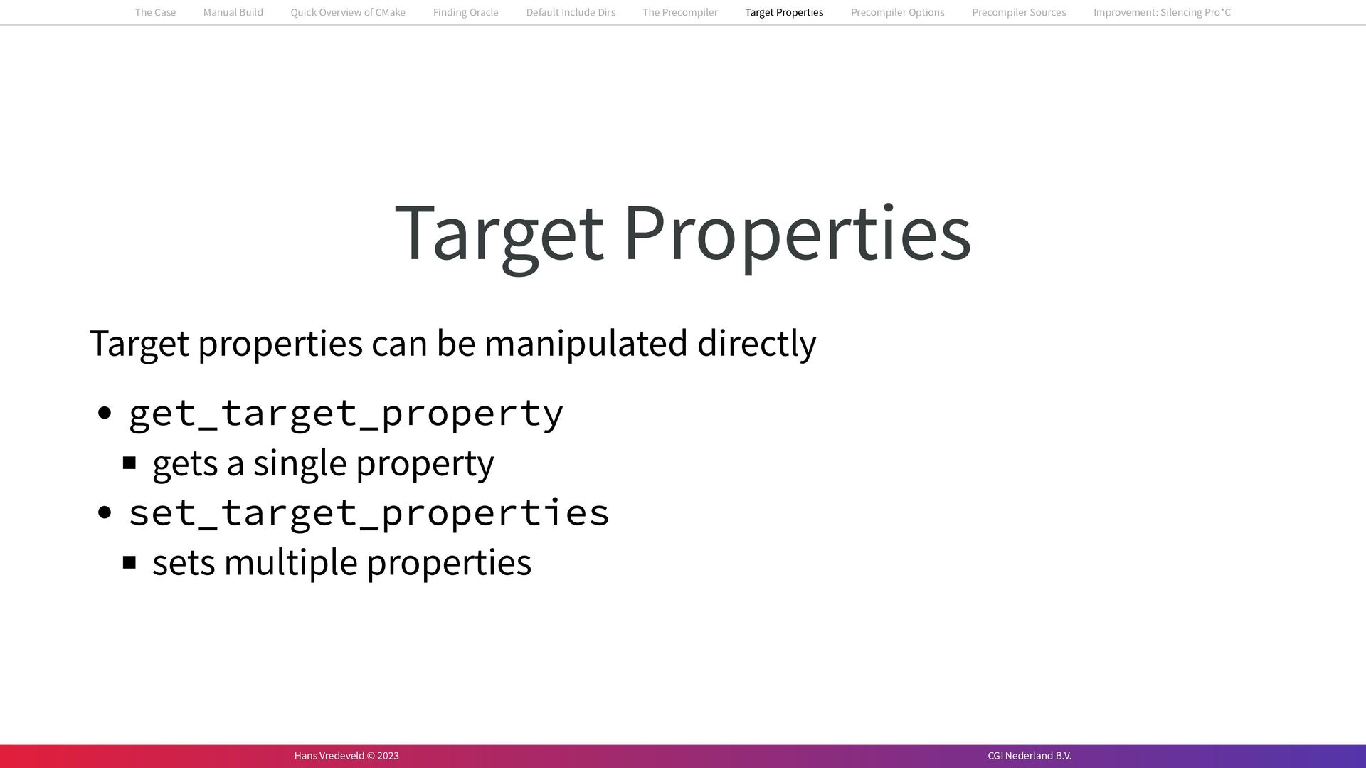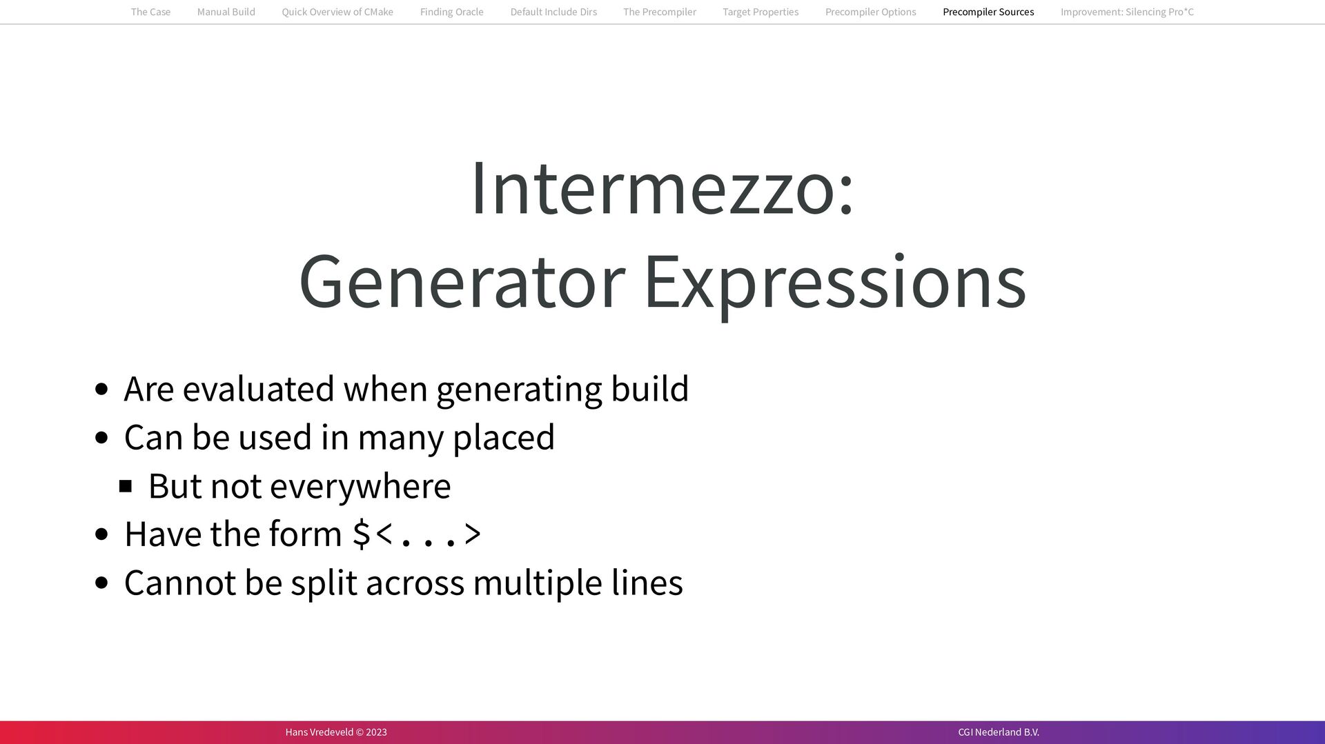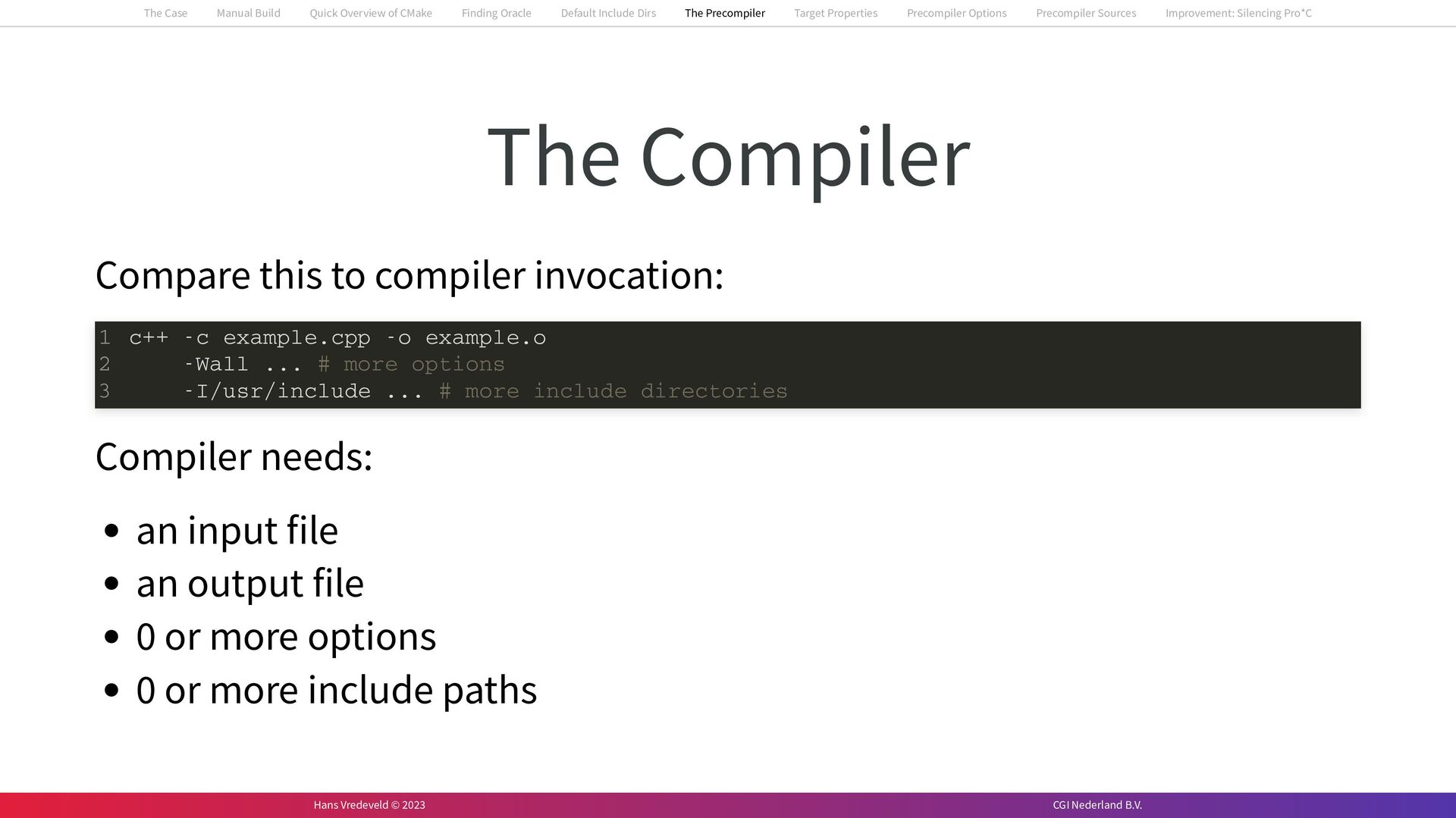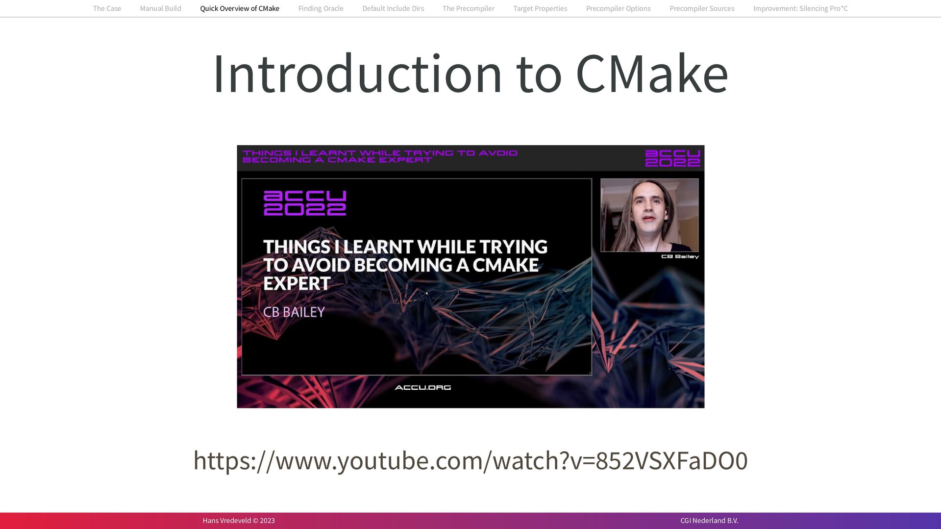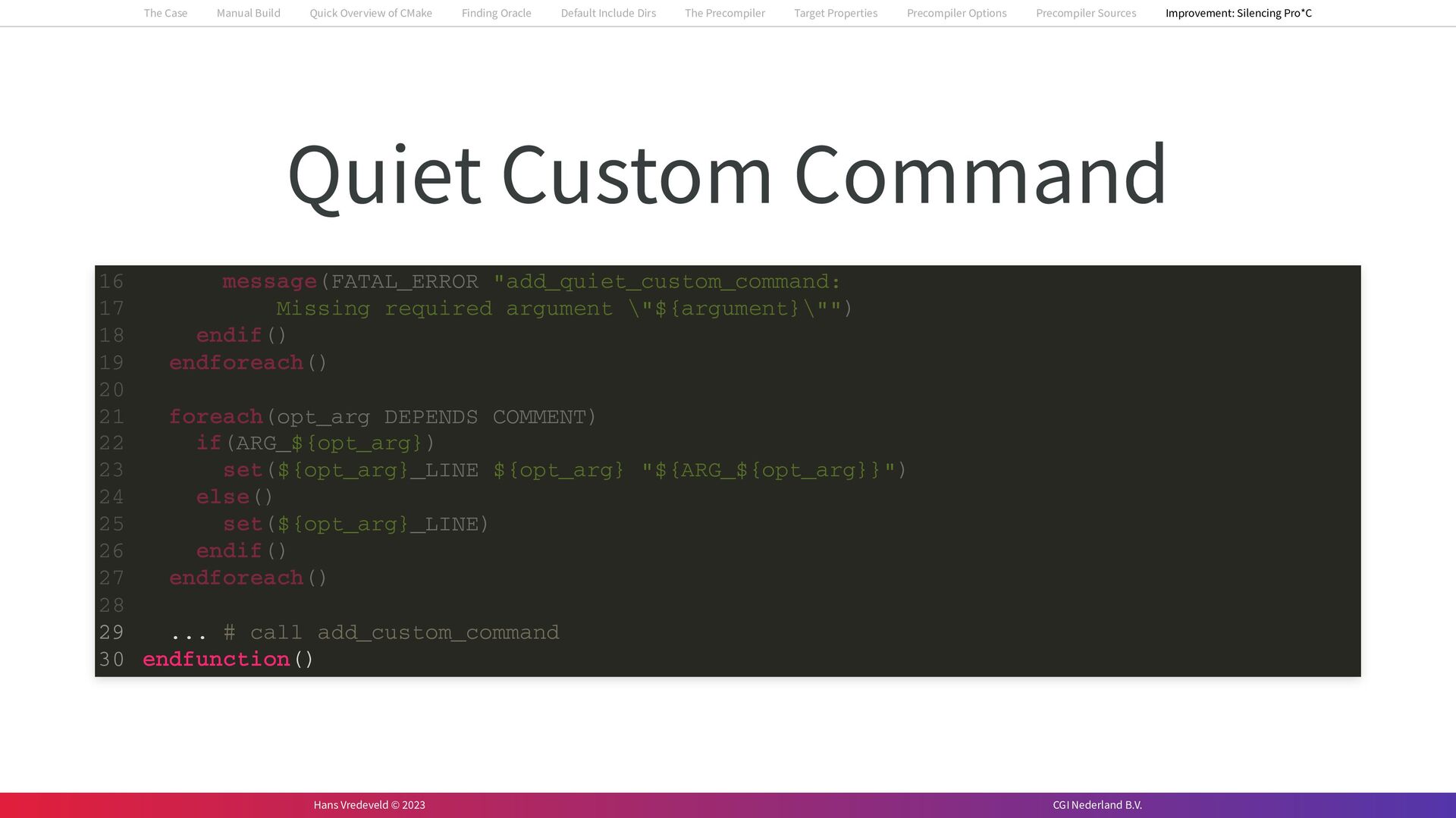 In the case study, we will look at a C++-application that uses embedded SQL to talk to an Oracle SQL-database. To build the application, it needs to link against Oracle’s client library, and the files with embedded SQL need to be converted to pure C++ before they can be compiled. How can we find that library when there is no CMake module for it yet? (We write our own!) How can we execute Oracle’s preprocessor to convert files with embedded SQL in a structured way when there are tens, or hundreds, of those files, possibly spread over different CMake targets? Come to my talk and I will tell you.