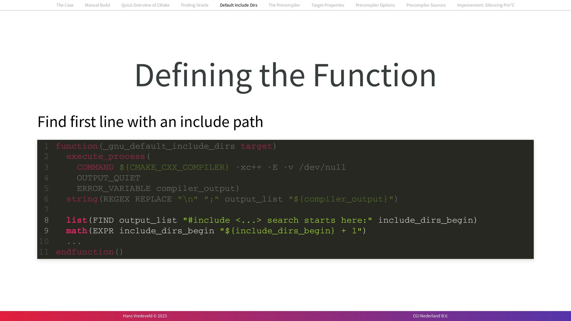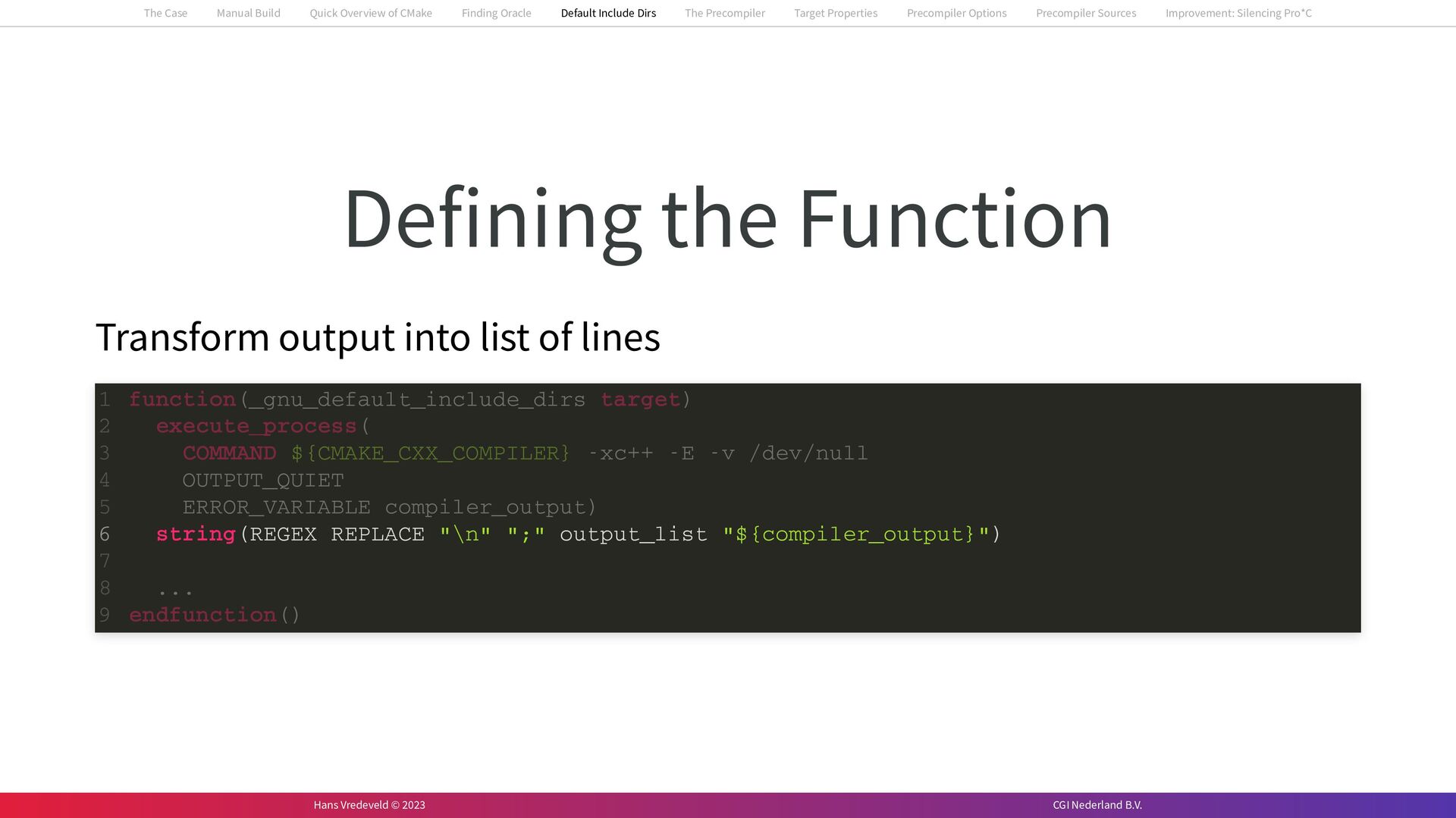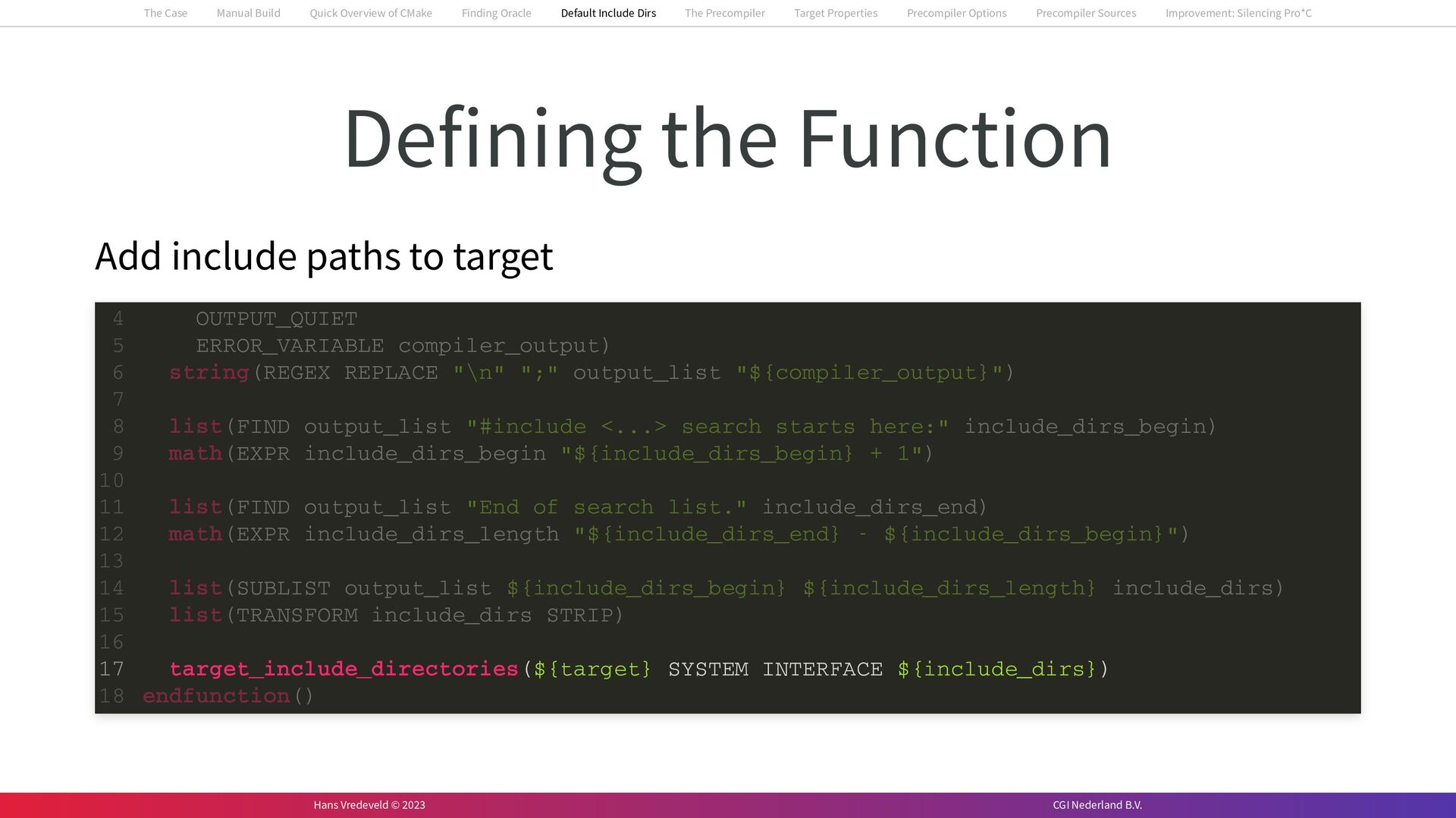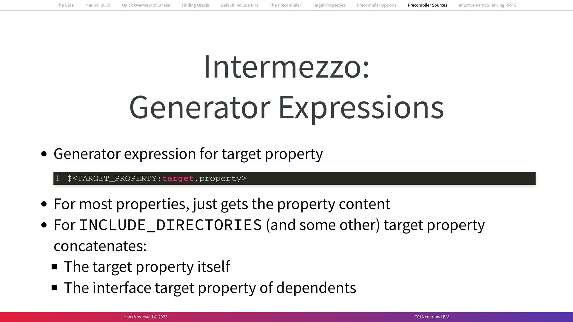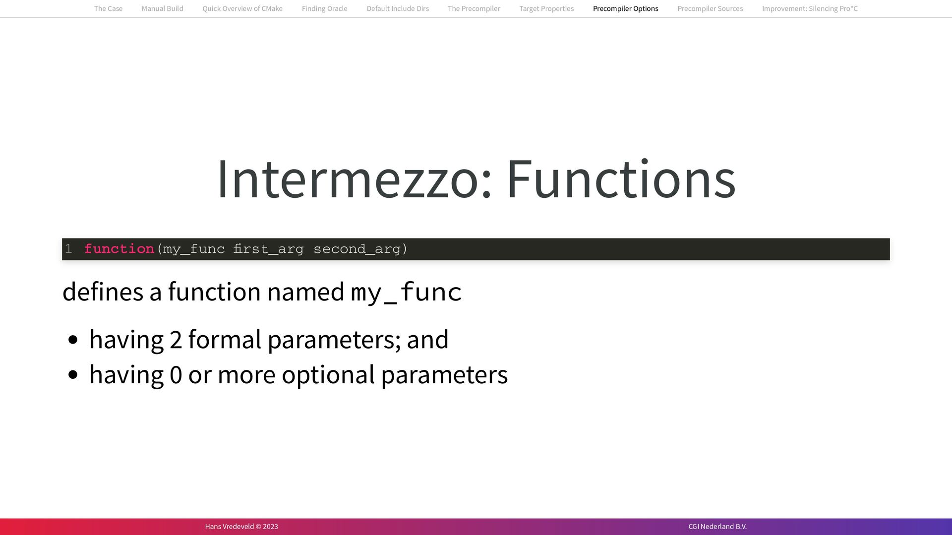 In the case study, we will look at a C++-application that uses embedded SQL to talk to an Oracle SQL-database. To build the application, it needs to link against Oracle’s client library, and the files with embedded SQL need to be converted to pure C++ before they can be compiled. How can we find that library when there is no CMake module for it yet? (We write our own!) How can we execute Oracle’s preprocessor to convert files with embedded SQL in a structured way when there are tens, or hundreds, of those files, possibly spread over different CMake targets? Come to my talk and I will tell you.