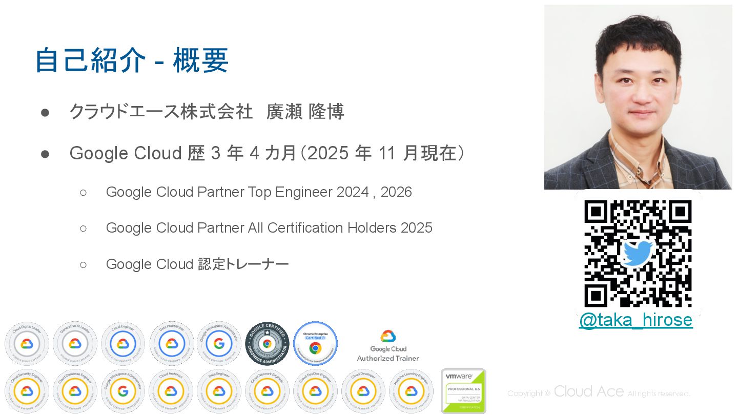 3 年 4 カ月(2025 年 11 月現在) ◦ Google Cloud Partner Top Engineer 2024 , 2026 ◦ Google Cloud Partner All Certification Holders 2025 ◦ Google Cloud 認定トレーナー @taka_hirose