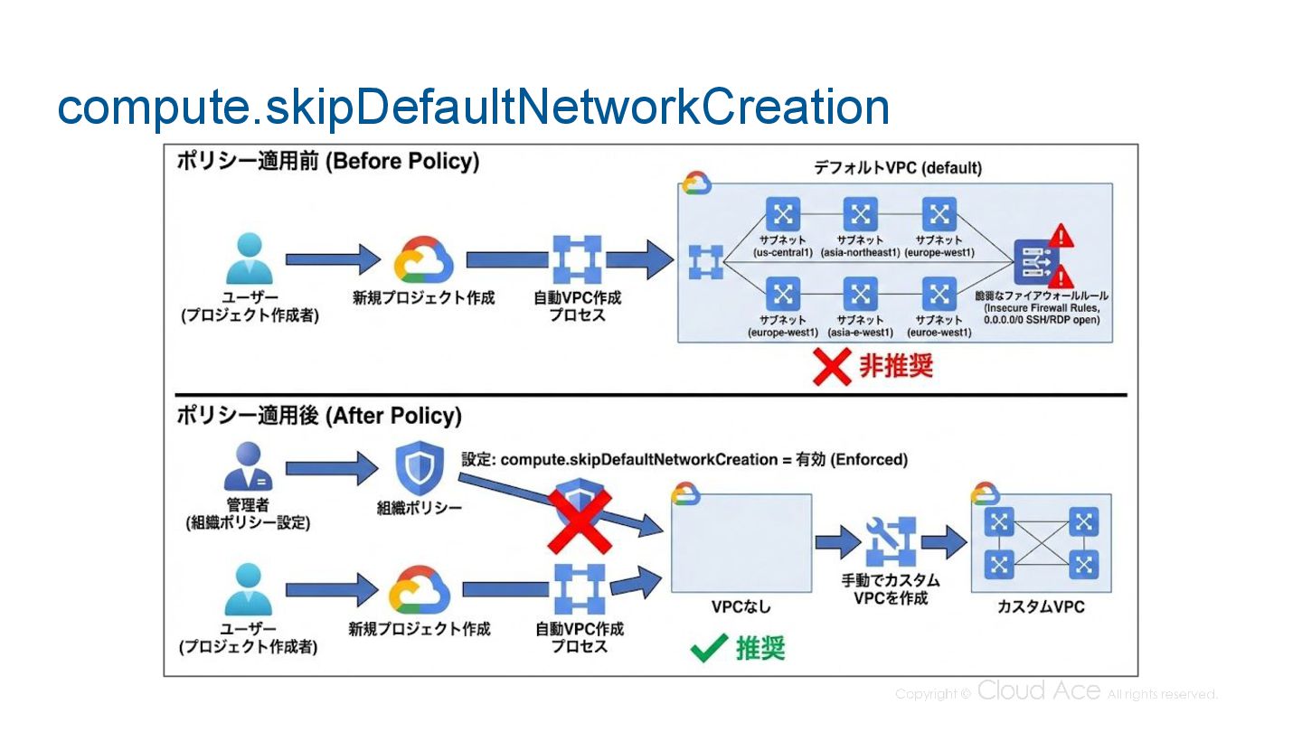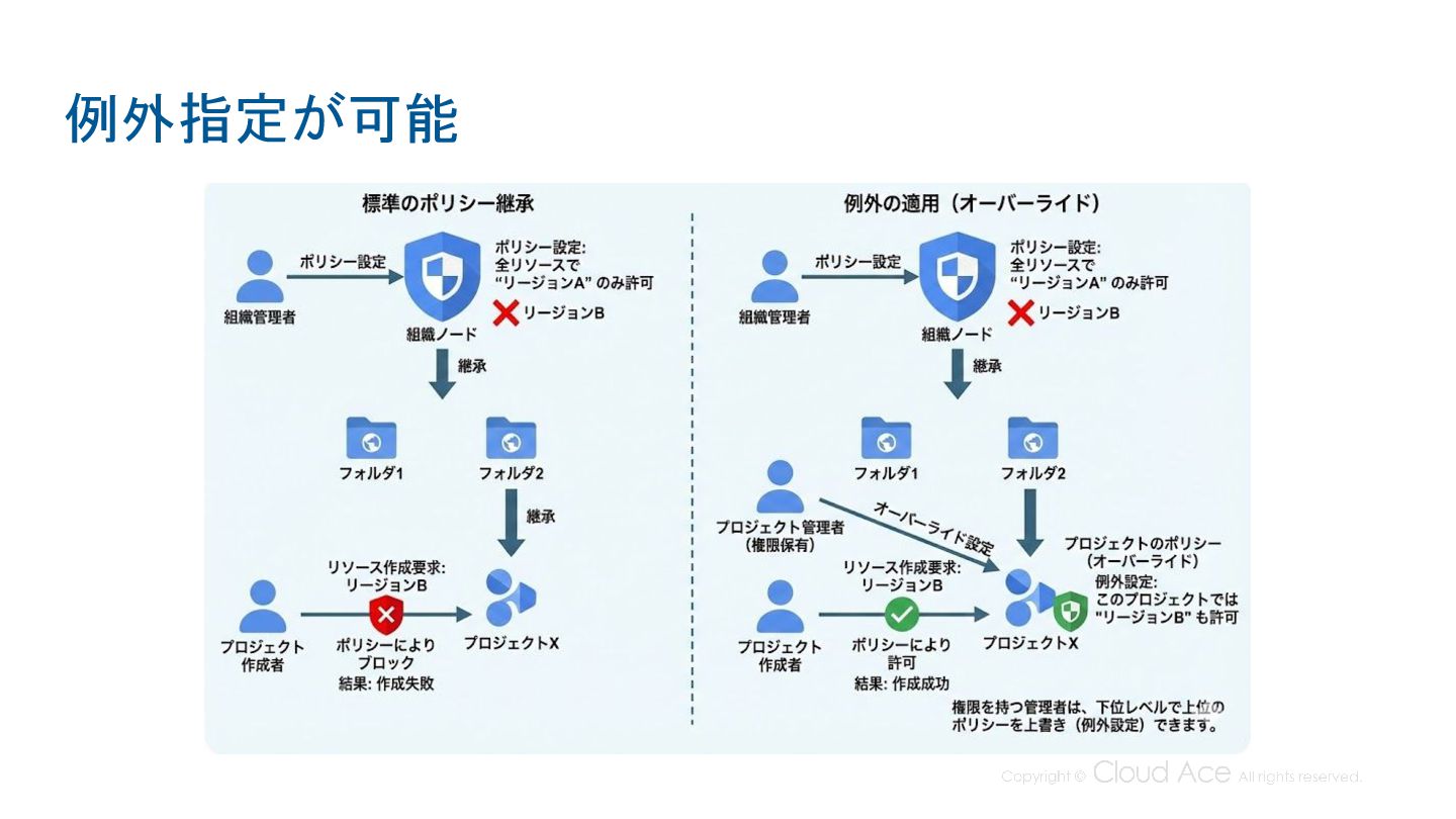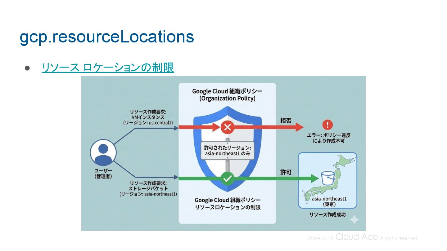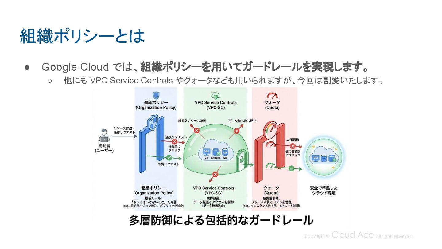組織ポリシーとは • Google Cloud では、組織ポリシーを用いてガードレールを実現します。 ◦ 他にも VPC Service Controls