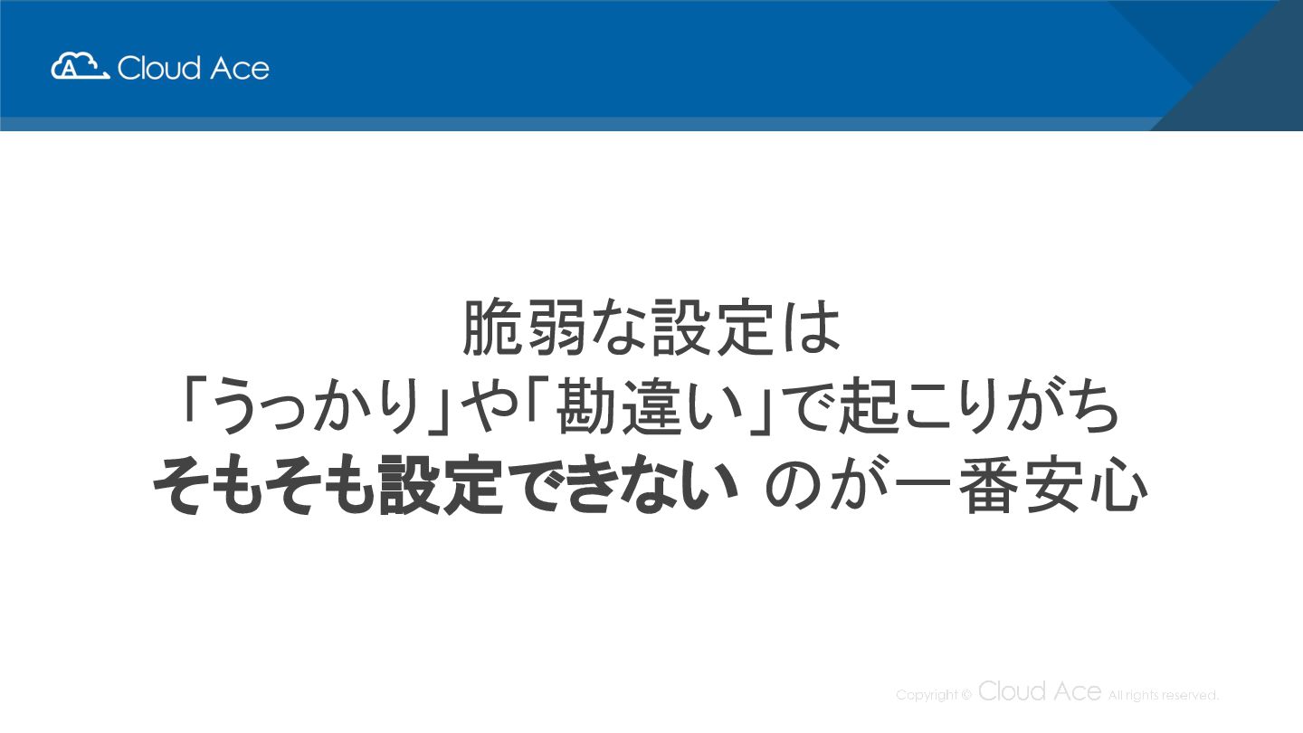 脆弱な設定は 「うっかり」や「勘違い」で起こりがち そもそも設定できない のが一番安心
