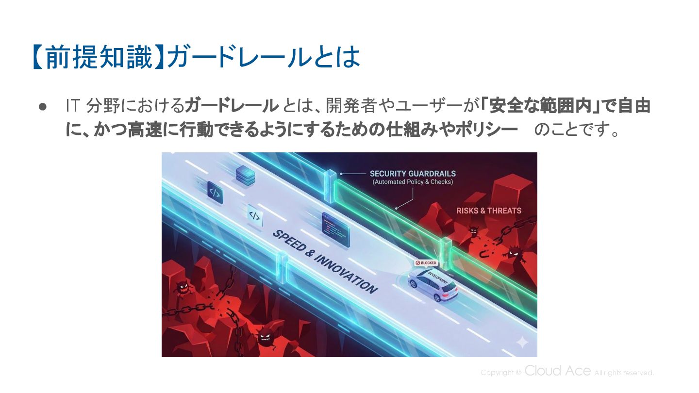 【前提知識】ガードレールとは • IT 分野におけるガードレール とは、開発者やユーザーが「安全な範囲内」で自由 に、かつ高速に行動できるようにするための仕組みやポリシー のことです。