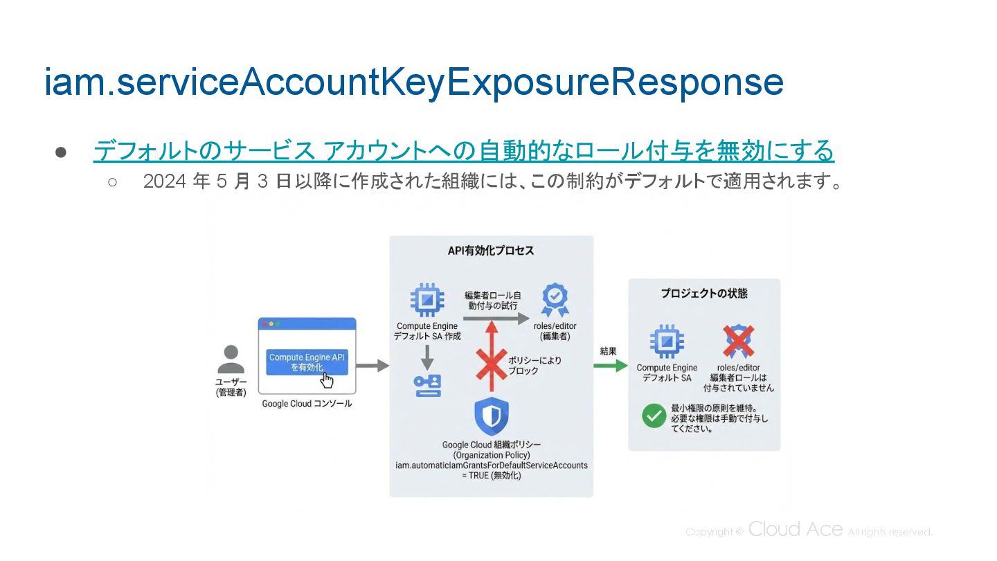iam.serviceAccountKeyExposureResponse • デフォルトのサービス アカウントへの自動的なロール付与を無効にする ◦ 2024 年 5 月 3