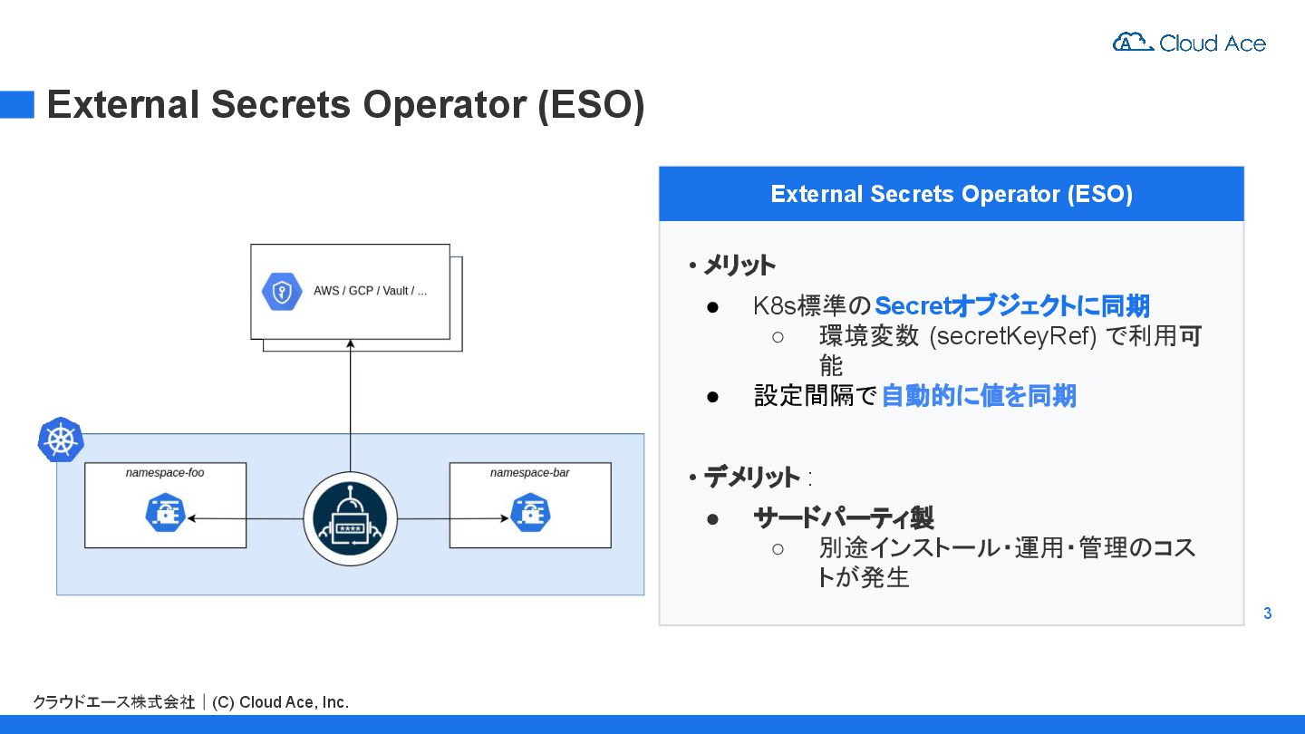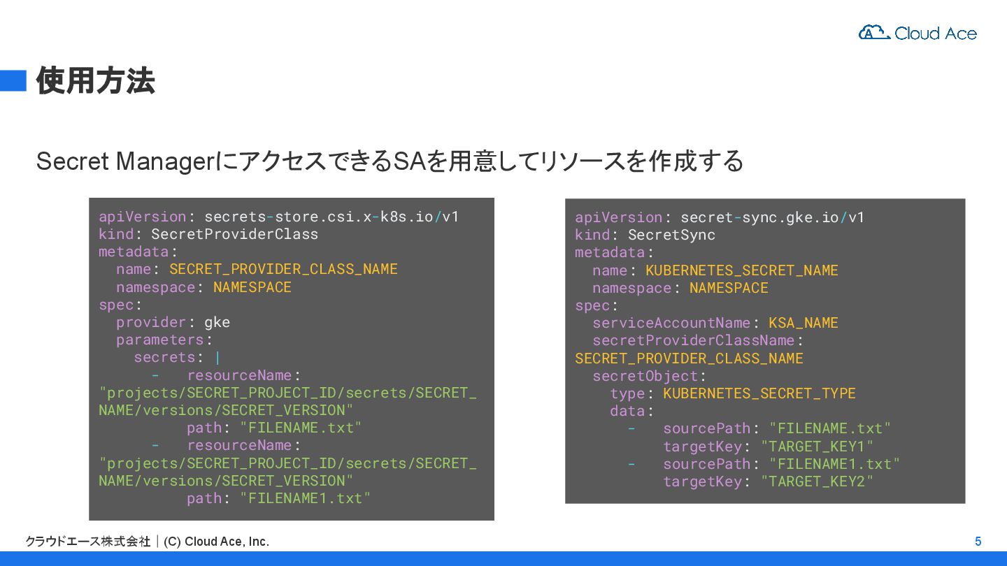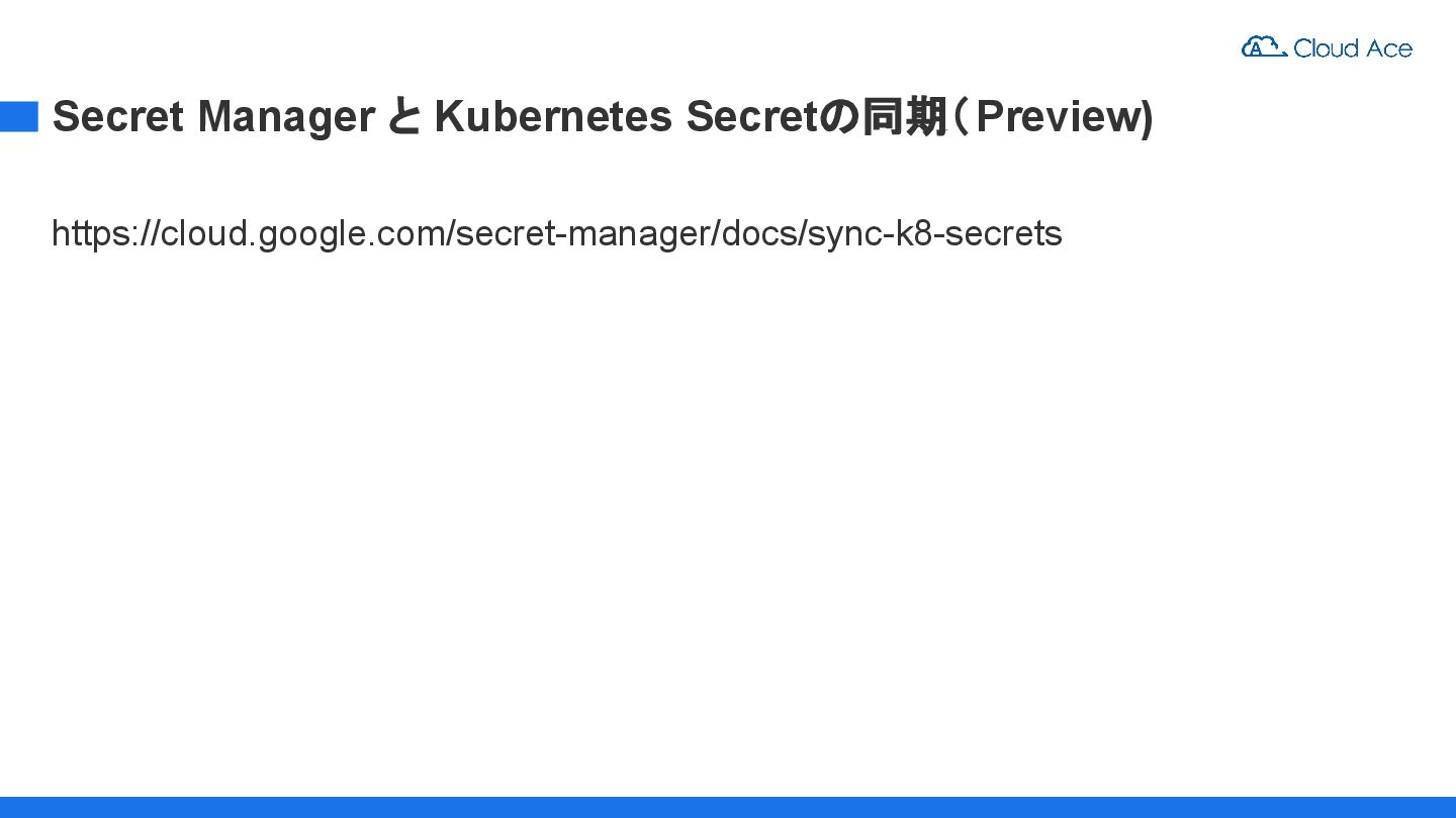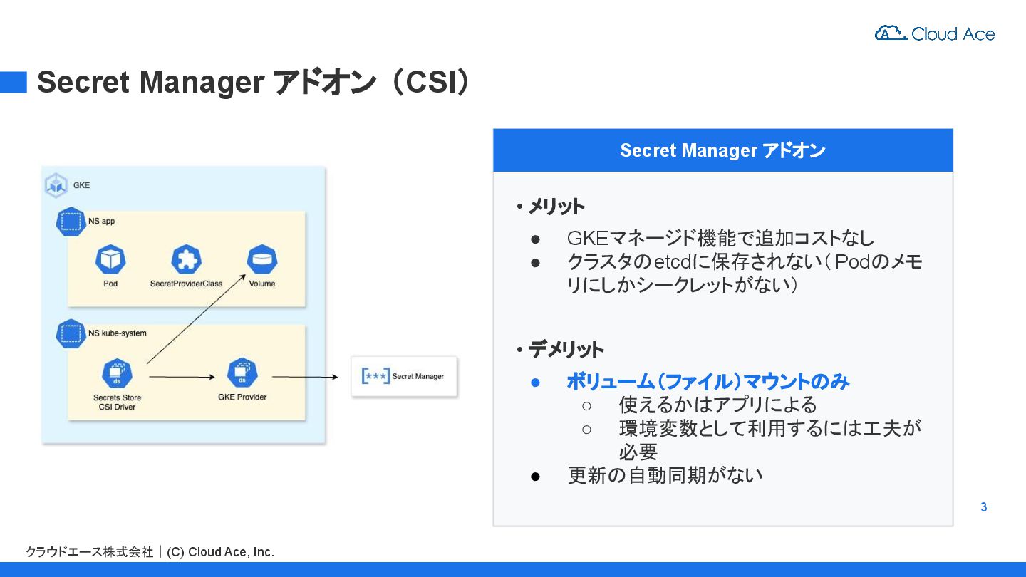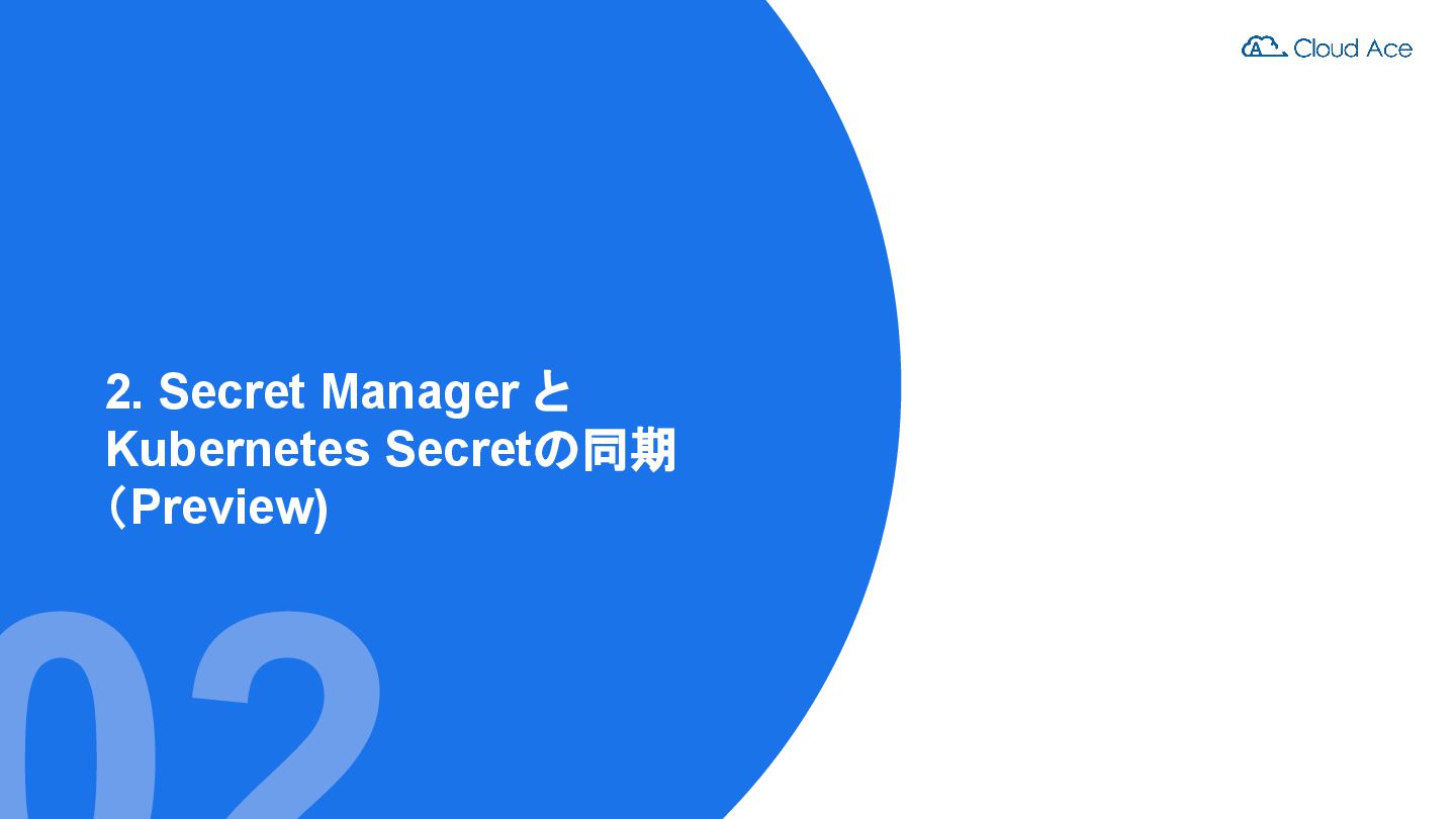 Secret Managerのシークレットを、Kubernetesの標準的な Secretオブジェクト に同期 • Secret Manager側の変更を自動でGKEクラスタ内の Secretに同期(ローテーション) Secret への同期が可能に これまでESOでしか実現できなかった 「K8s Secretへの同期」と「自動更新」 がGKEマネージド機能 として提供され ます アプリに依存せず利用可能 ファイルマウントだけでなく標準 Secret として作成可能に。アプリに依存なく 環 境変数として利用 できます 運用負荷の軽減 サードパーティ製オペレーターの イン ストールや管理が不要 になり、運用負 荷が大幅に軽減されます クラウドエース株式会社|(C) Cloud Ace, Inc. 5