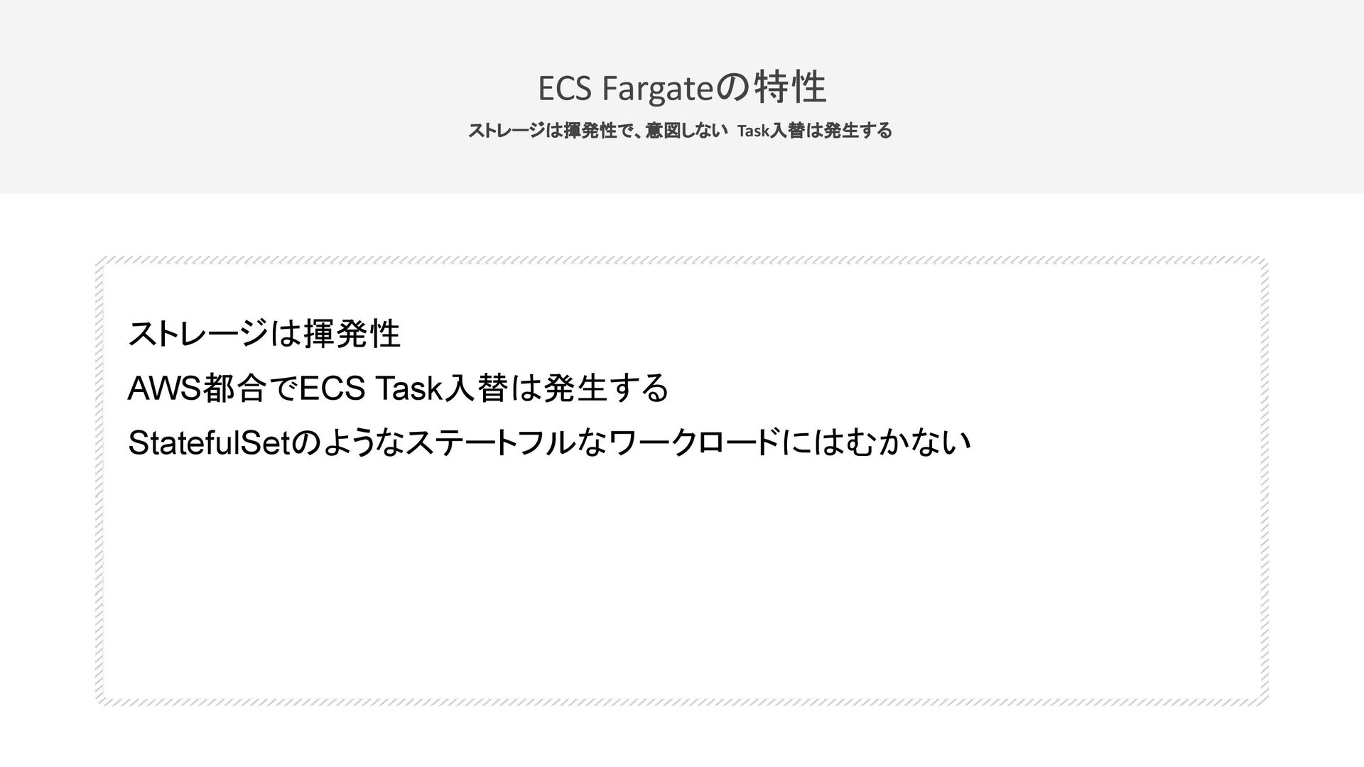 ECS Fargateの特性 ストレージは揮発性で、意図しない Task入替は発生する ストレージは揮発性 AWS都合でECS Task入替は発生する StatefulSetのようなステートフルなワークロードにはむかない
