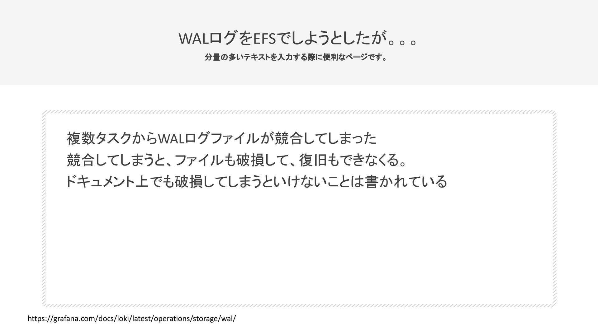複数タスクからWALログファイルが競合してしまった 競合してしまうと、ファイルも破損して、復旧もできなくる。 ドキュメント上でも破損してしまうといけないことは書かれている WALログをEFSでしようとしたが。。。 分量の多いテキストを入力する際に便利なページです。 https://grafana.com/docs/loki/latest/operations/storage/wal/