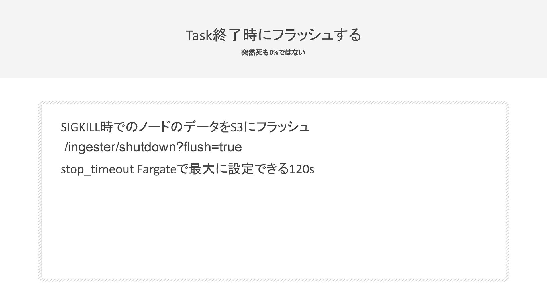 SIGKILL時でのノードのデータをS3にフラッシュ /ingester/shutdown?flush=true stop_timeout Fargateで最大に設定できる120s Task終了時にフラッシュする 突然死も0%ではない