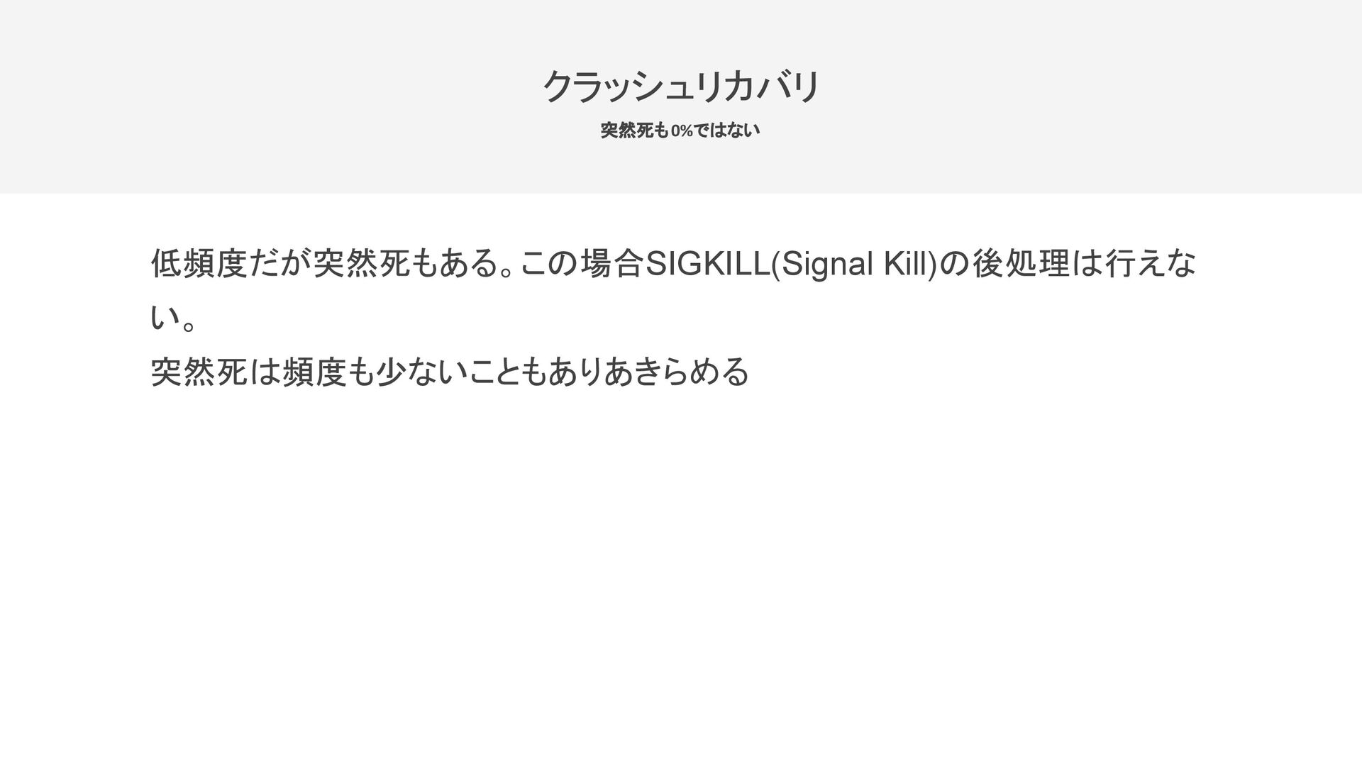 低頻度だが突然死もある。この場合SIGKILL(Signal Kill)の後処理は行えな い。 突然死は頻度も少ないこともありあきらめる クラッシュリカバリ 突然死も0%ではない