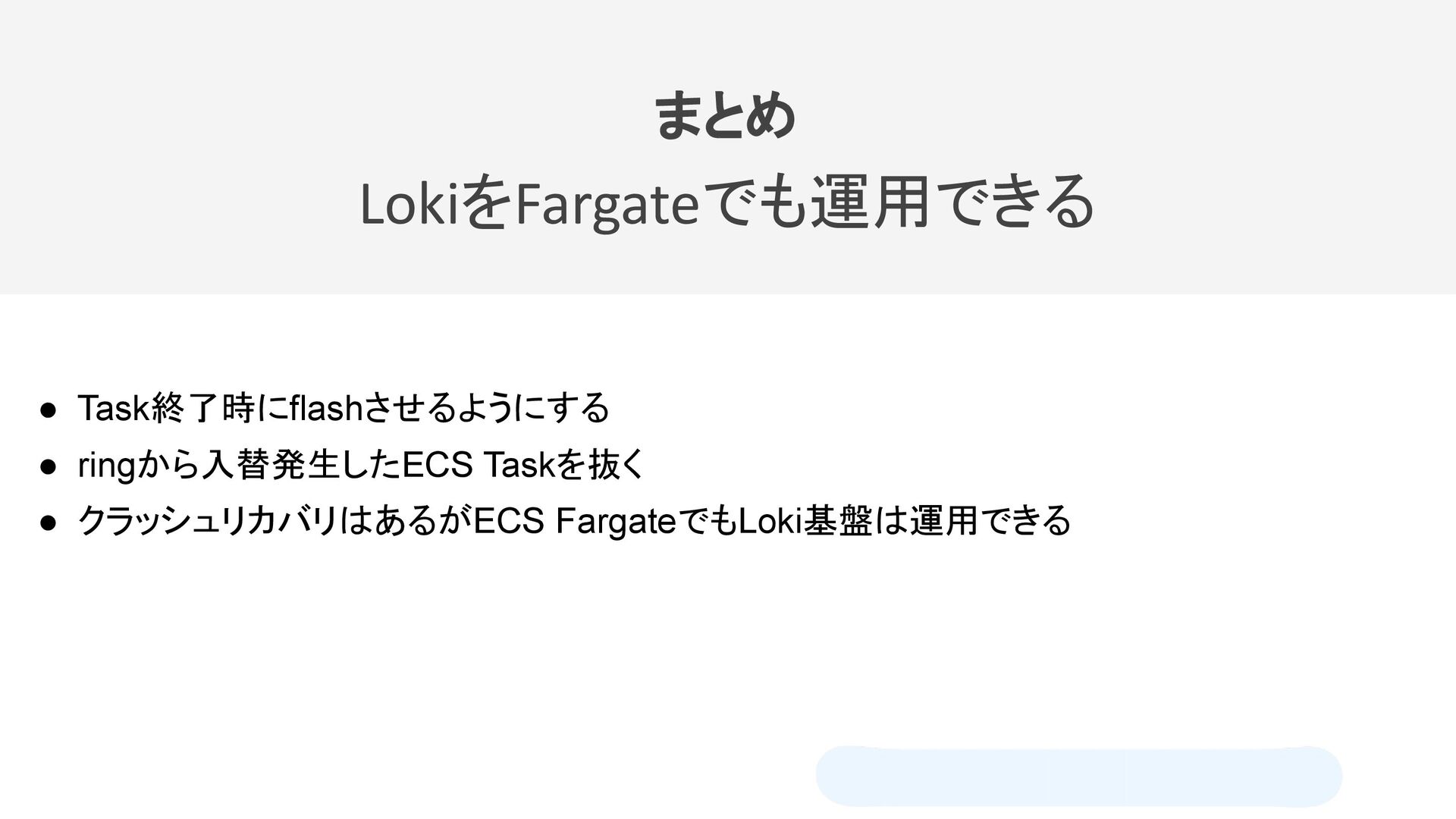 • Task終了時にflashさせるようにする • ringから入替発生したECS Taskを抜く • クラッシュリカバリはあるがECS FargateでもLoki基盤は運用できる LokiをFargateでも運用できる まとめ