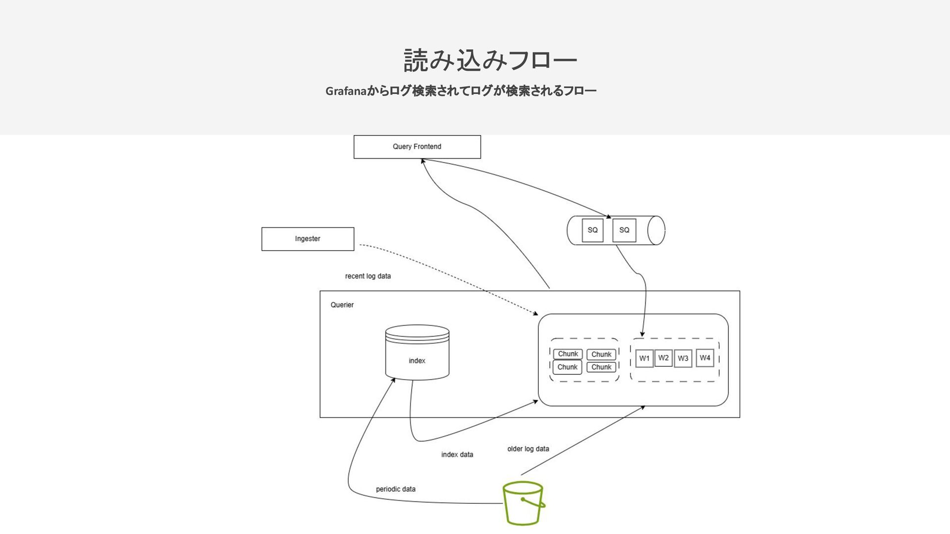 読み込みフロー Grafanaからログ検索されてログが検索されるフロー