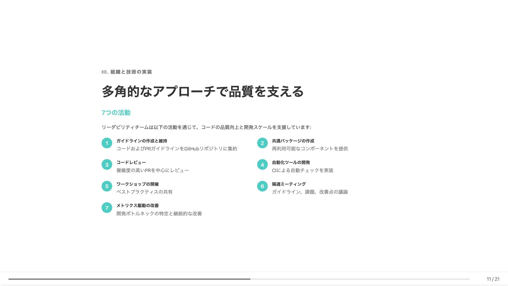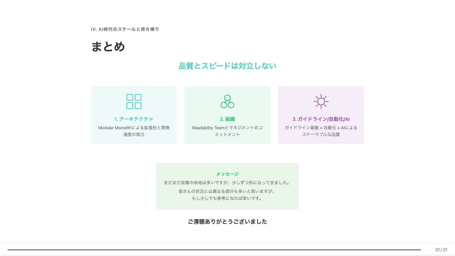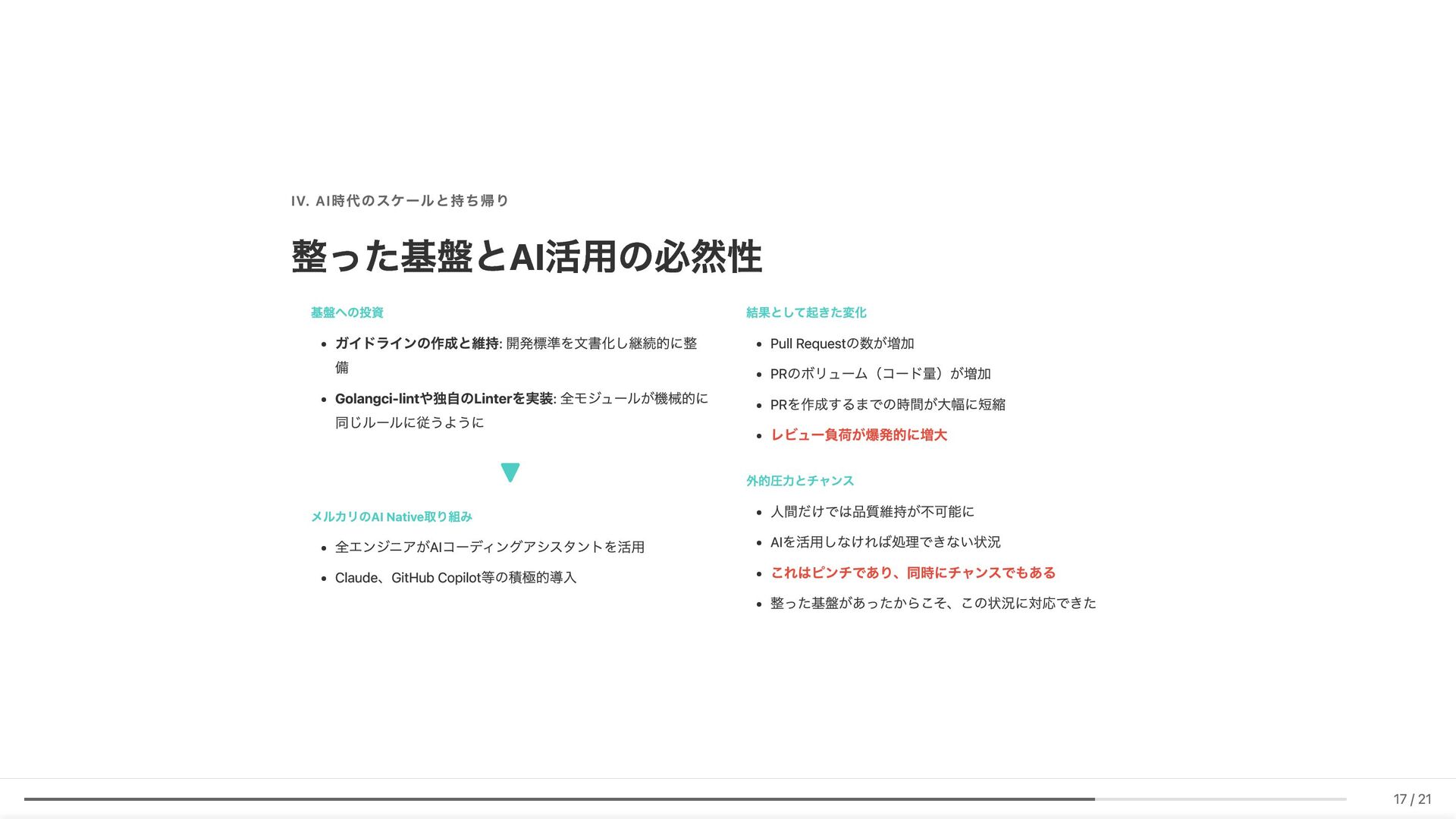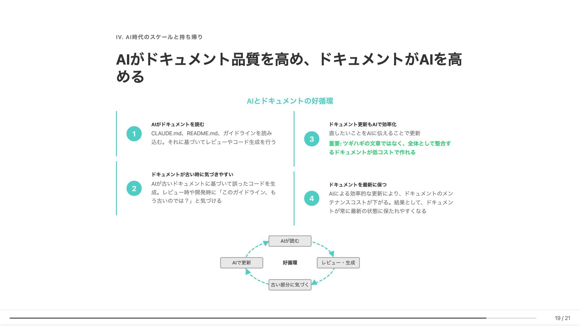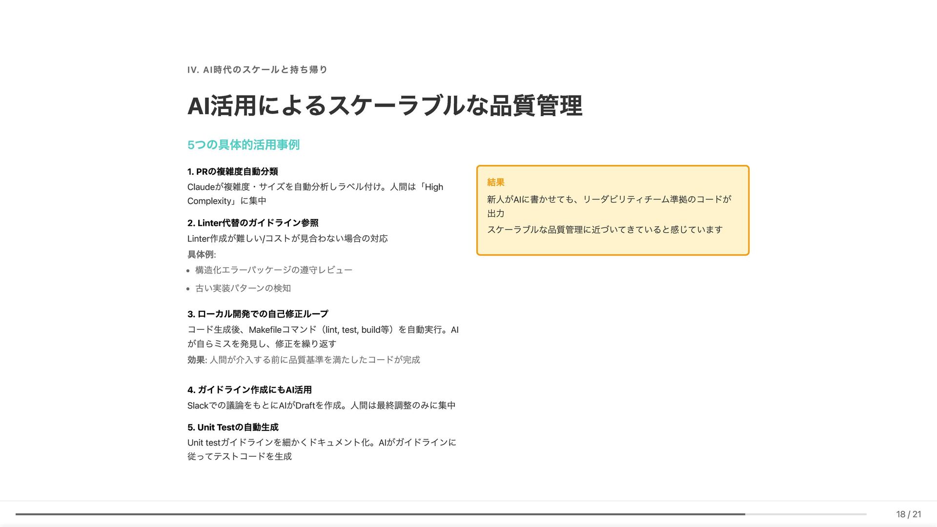 Linter作成が難しい/コストが見合わない場合の対応 具体例: 構造化エラーパッケージの遵守レビュー 古い実装パターンの検知 3. ローカル開発での自己修正ループ コード生成後、Makefileコマンド(lint, test, build等)を自動実行。AI が自らミスを発見し、修正を繰り返す 効果: 人間が介入する前に品質基準を満たしたコードが完成 4. ガイドライン作成にもAI活用 Slackでの議論をもとにAIがDraftを作成。人間は最終調整のみに集中 5. Unit Testの自動生成 Unit testガイドラインを細かくドキュメント化。AIがガイドラインに 従ってテストコードを生成 結果 新人がAIに書かせても、リーダビリティチーム準拠のコードが 出力 スケーラブルな品質管理に近づいてきていると感じています 18 / 21