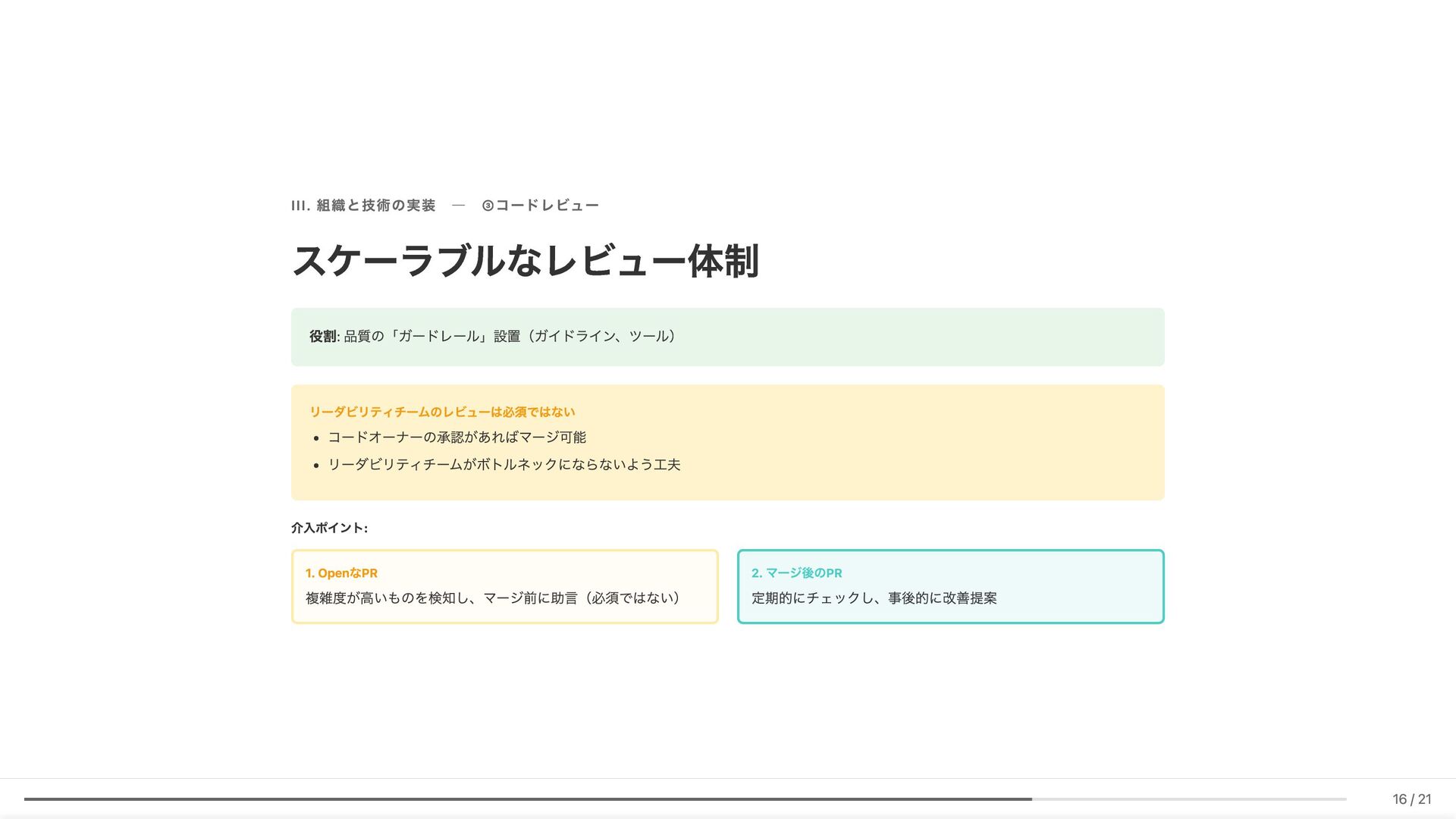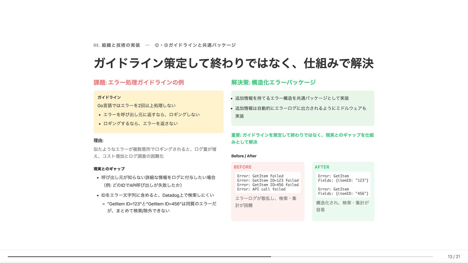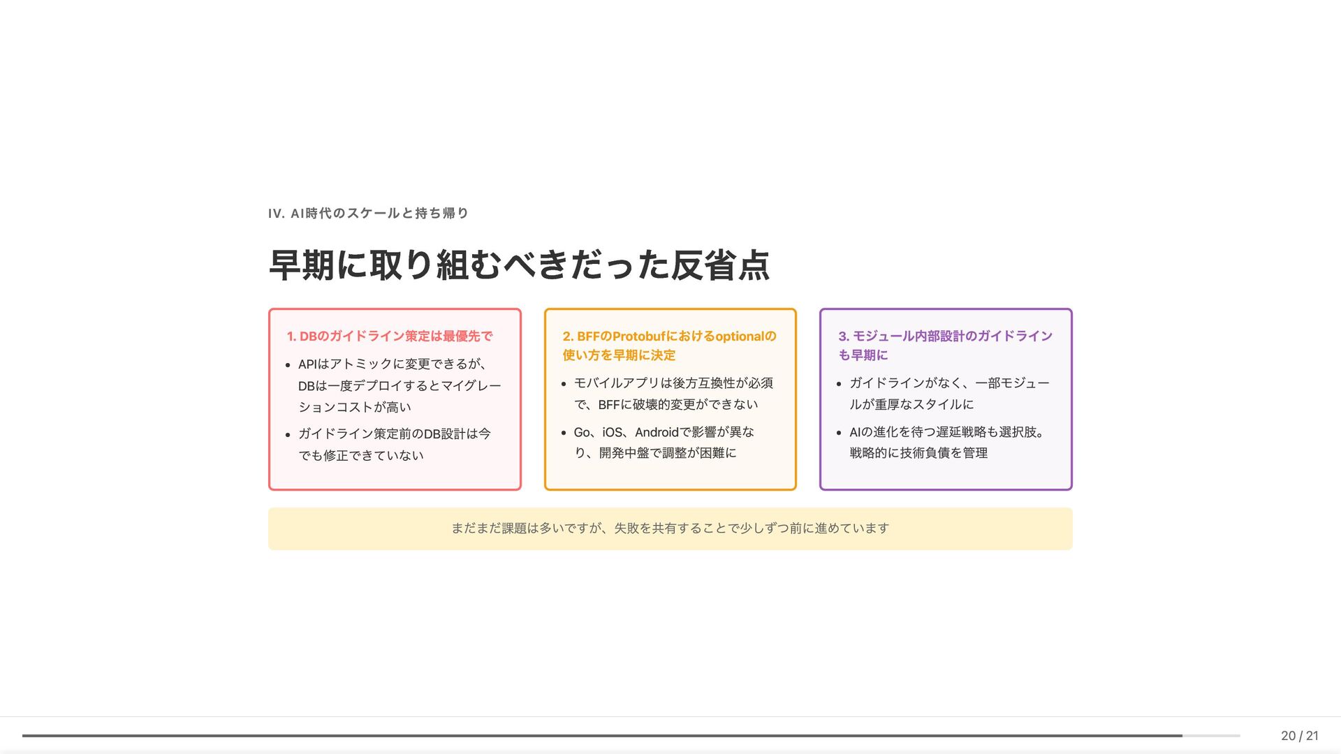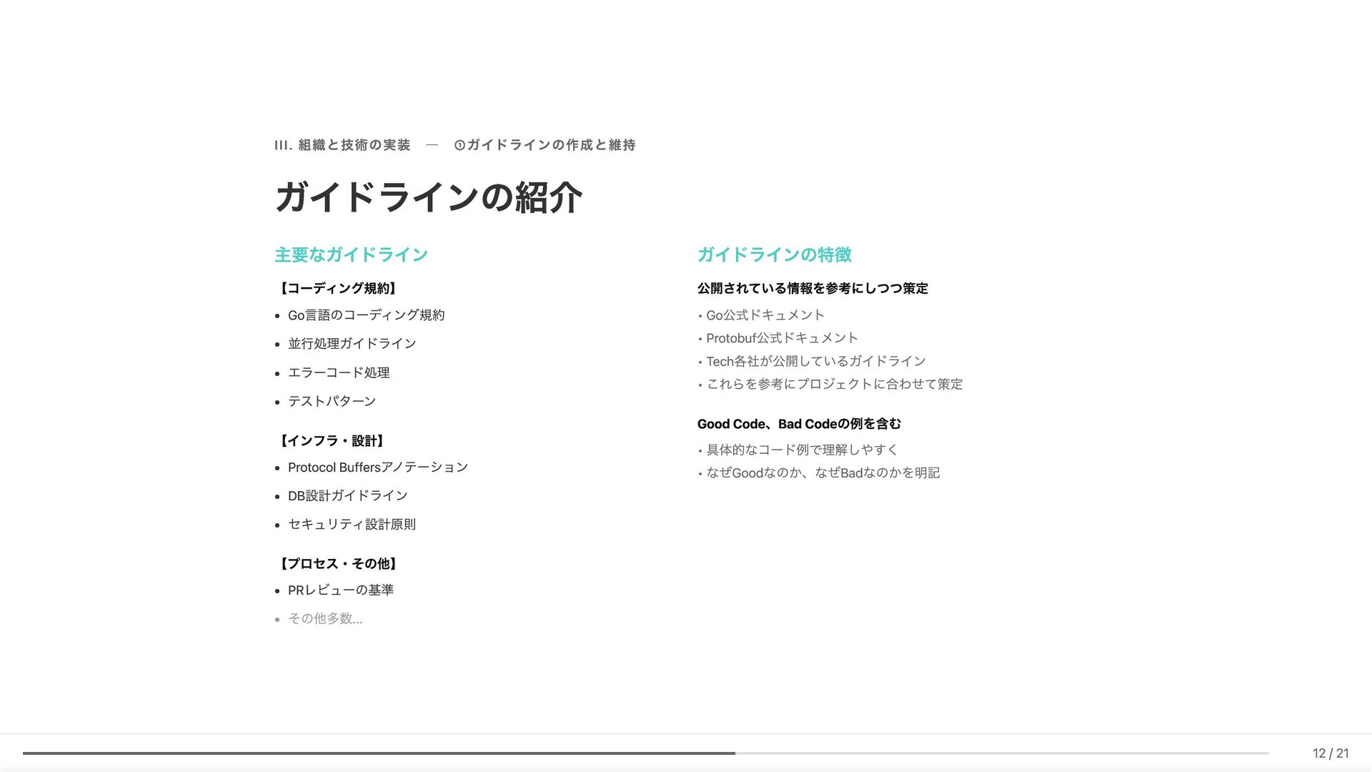 Linter作成が難しい/コストが見合わない場合の対応 具体例: 構造化エラーパッケージの遵守レビュー 古い実装パターンの検知 3. ローカル開発での自己修正ループ コード生成後、Makefileコマンド(lint, test, build等)を自動実行。AI が自らミスを発見し、修正を繰り返す 効果: 人間が介入する前に品質基準を満たしたコードが完成 4. ガイドライン作成にもAI活用 Slackでの議論をもとにAIがDraftを作成。人間は最終調整のみに集中 5. Unit Testの自動生成 Unit testガイドラインを細かくドキュメント化。AIがガイドラインに 従ってテストコードを生成 結果 新人がAIに書かせても、リーダビリティチーム準拠のコードが 出力 スケーラブルな品質管理に近づいてきていると感じています 18 / 21