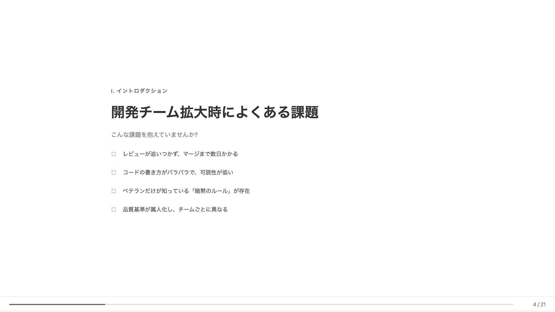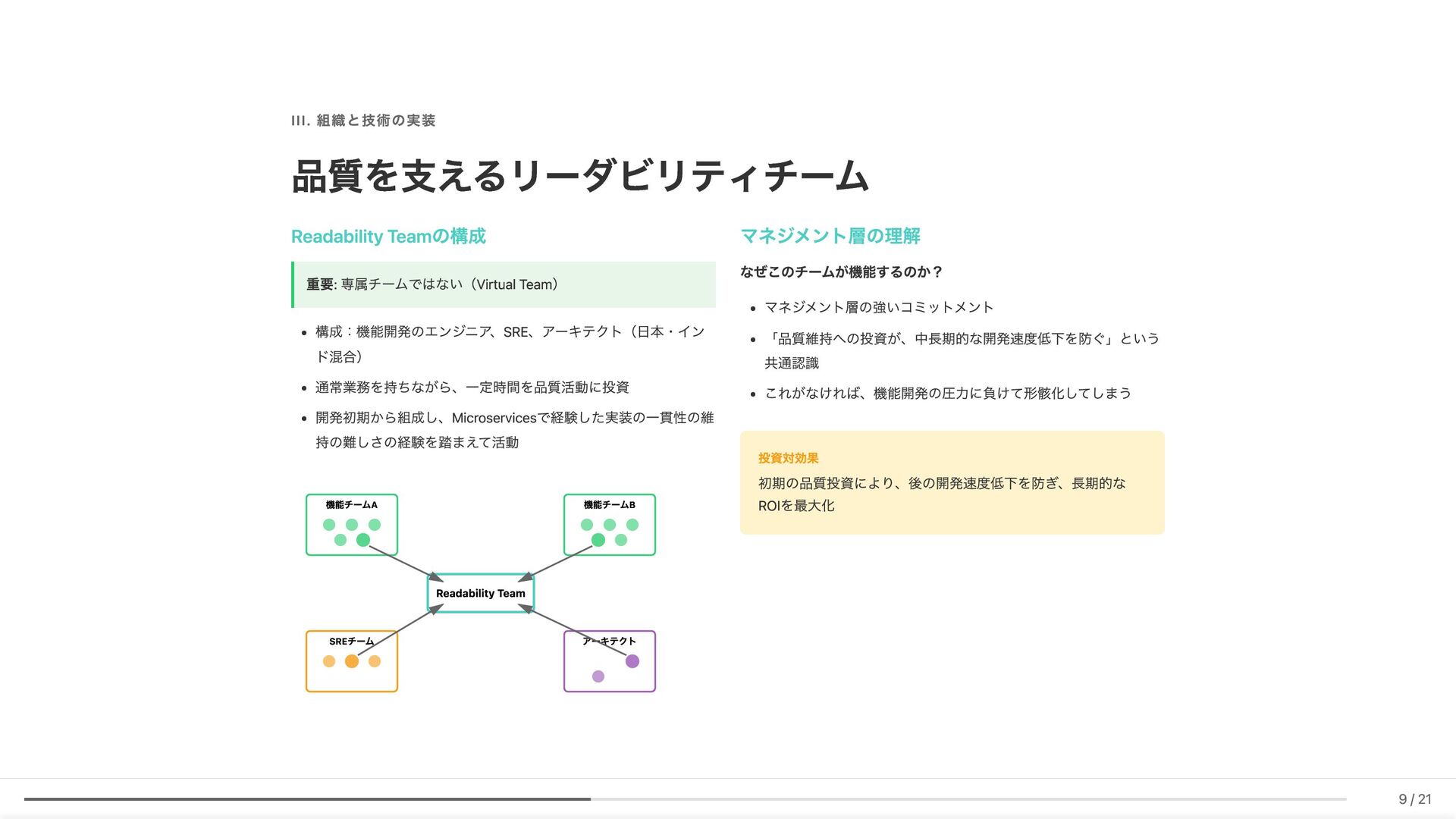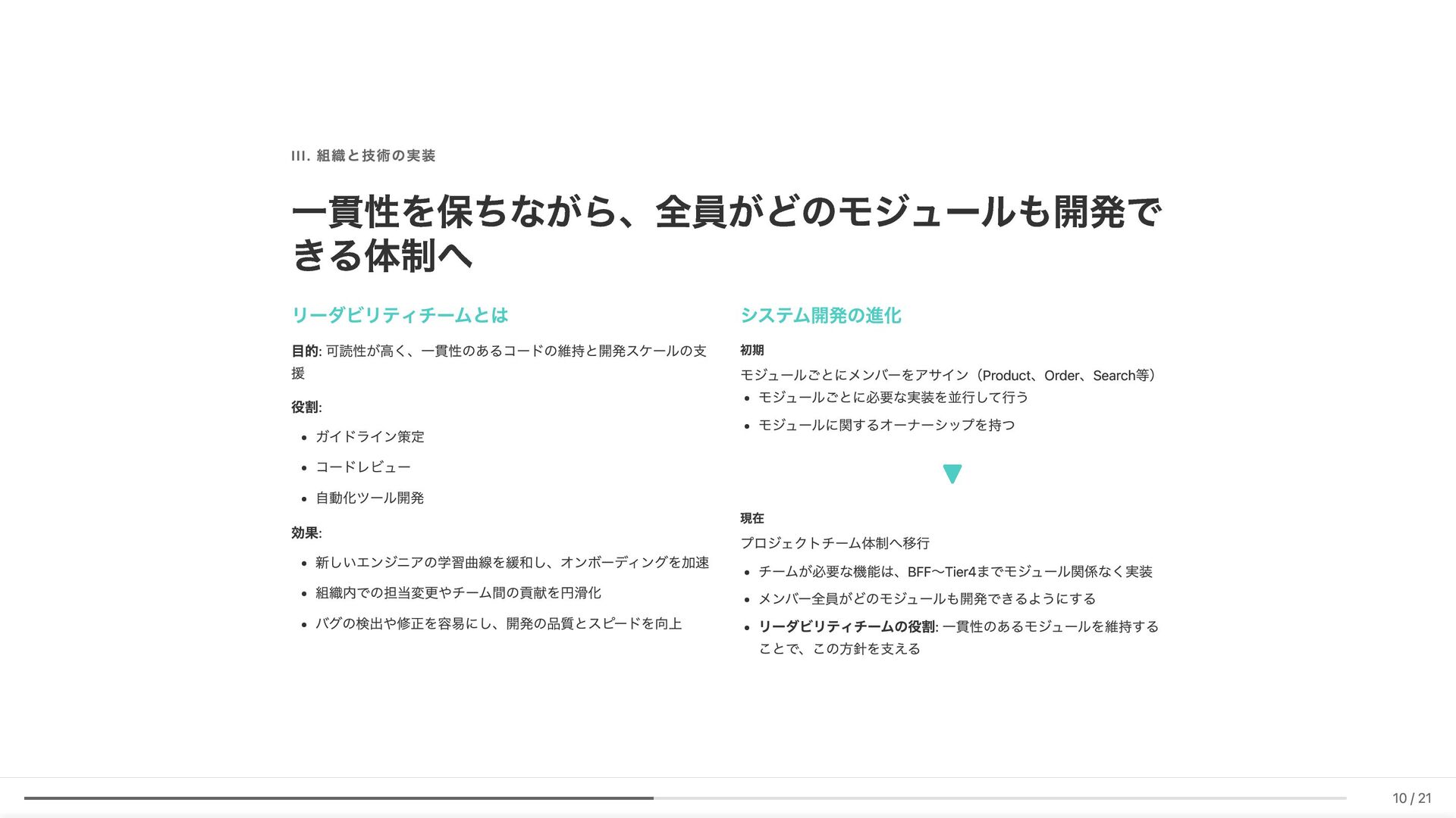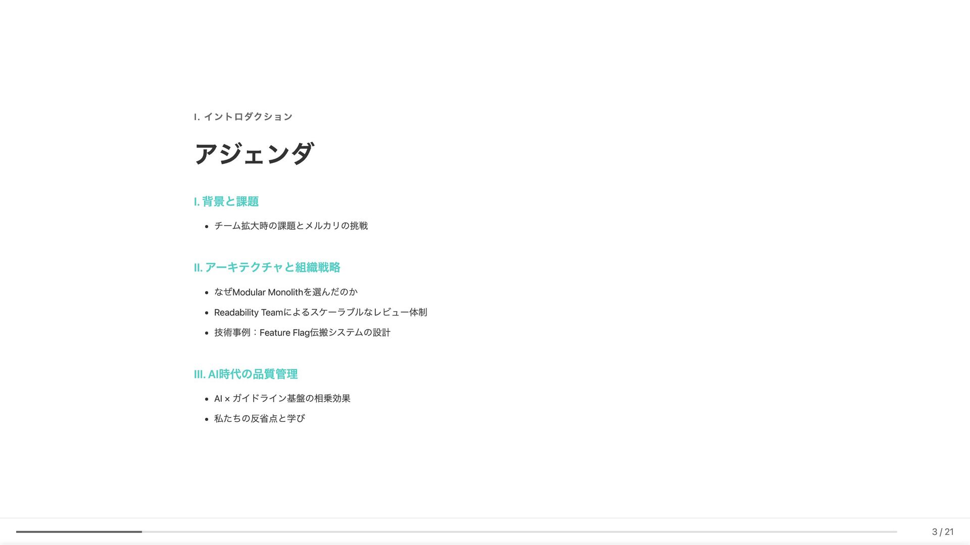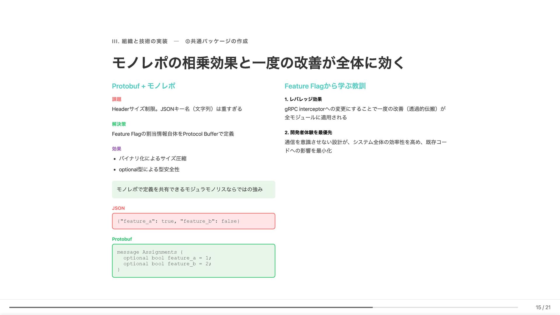 Linter作成が難しい/コストが見合わない場合の対応 具体例: 構造化エラーパッケージの遵守レビュー 古い実装パターンの検知 3. ローカル開発での自己修正ループ コード生成後、Makefileコマンド(lint, test, build等)を自動実行。AI が自らミスを発見し、修正を繰り返す 効果: 人間が介入する前に品質基準を満たしたコードが完成 4. ガイドライン作成にもAI活用 Slackでの議論をもとにAIがDraftを作成。人間は最終調整のみに集中 5. Unit Testの自動生成 Unit testガイドラインを細かくドキュメント化。AIがガイドラインに 従ってテストコードを生成 結果 新人がAIに書かせても、リーダビリティチーム準拠のコードが 出力 スケーラブルな品質管理に近づいてきていると感じています 18 / 21