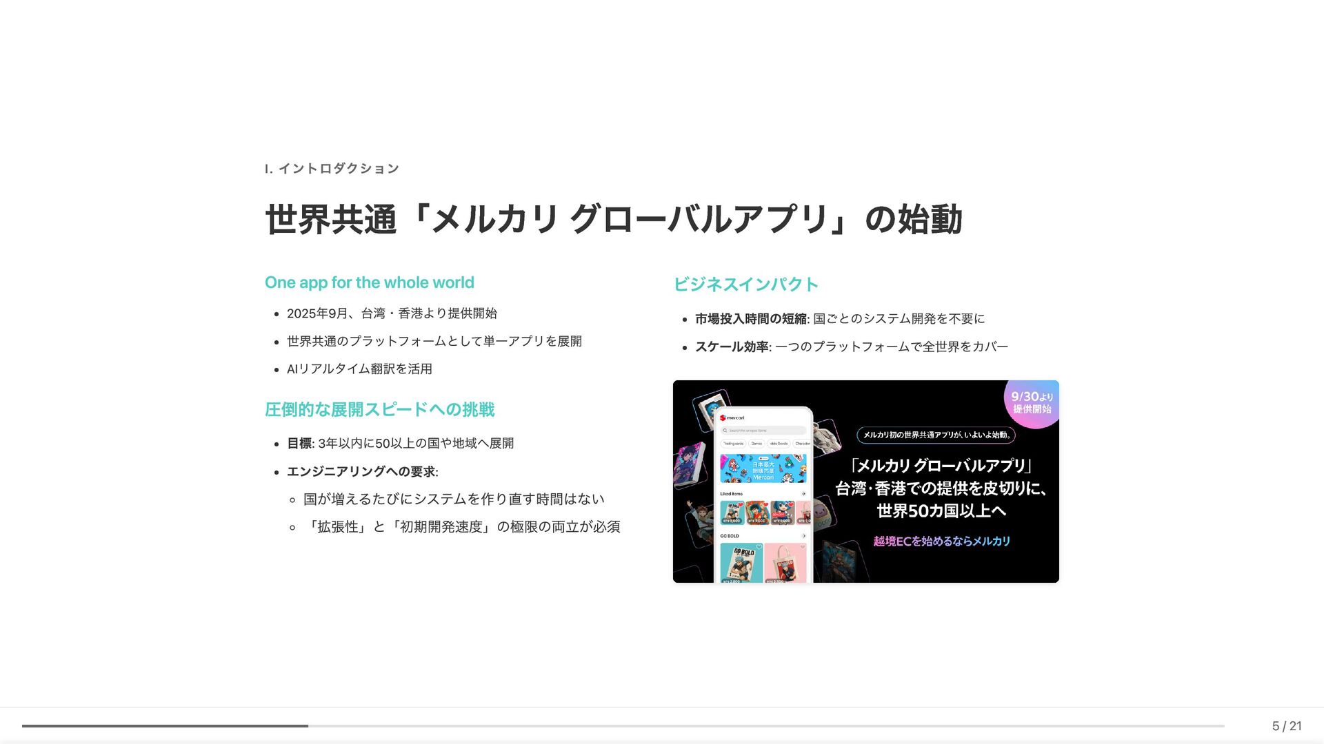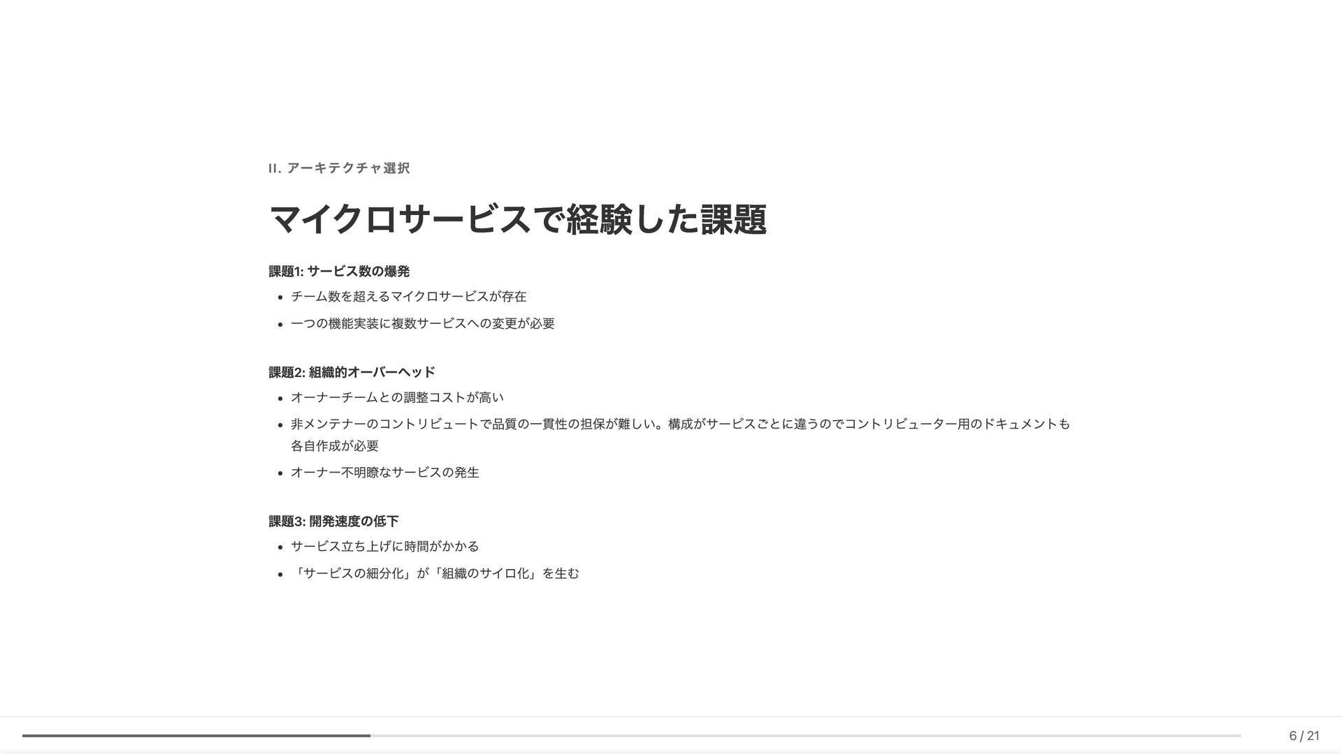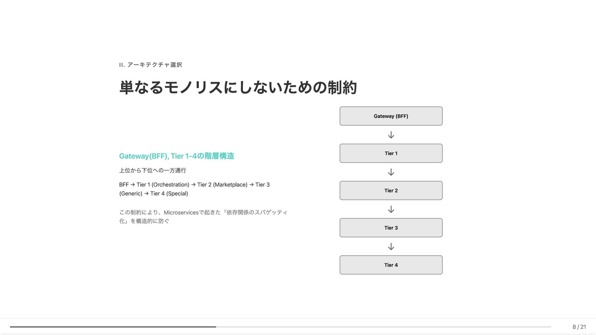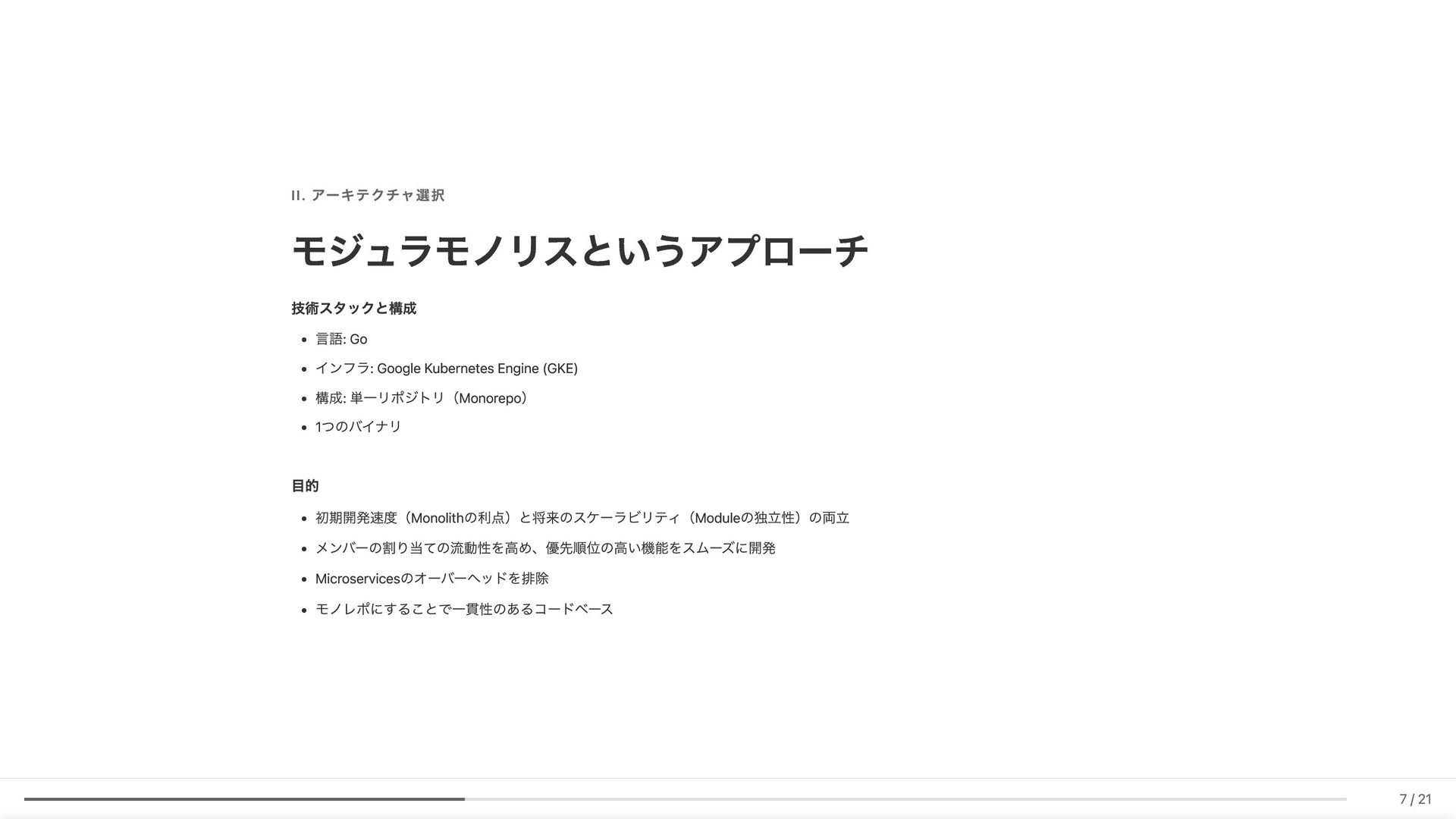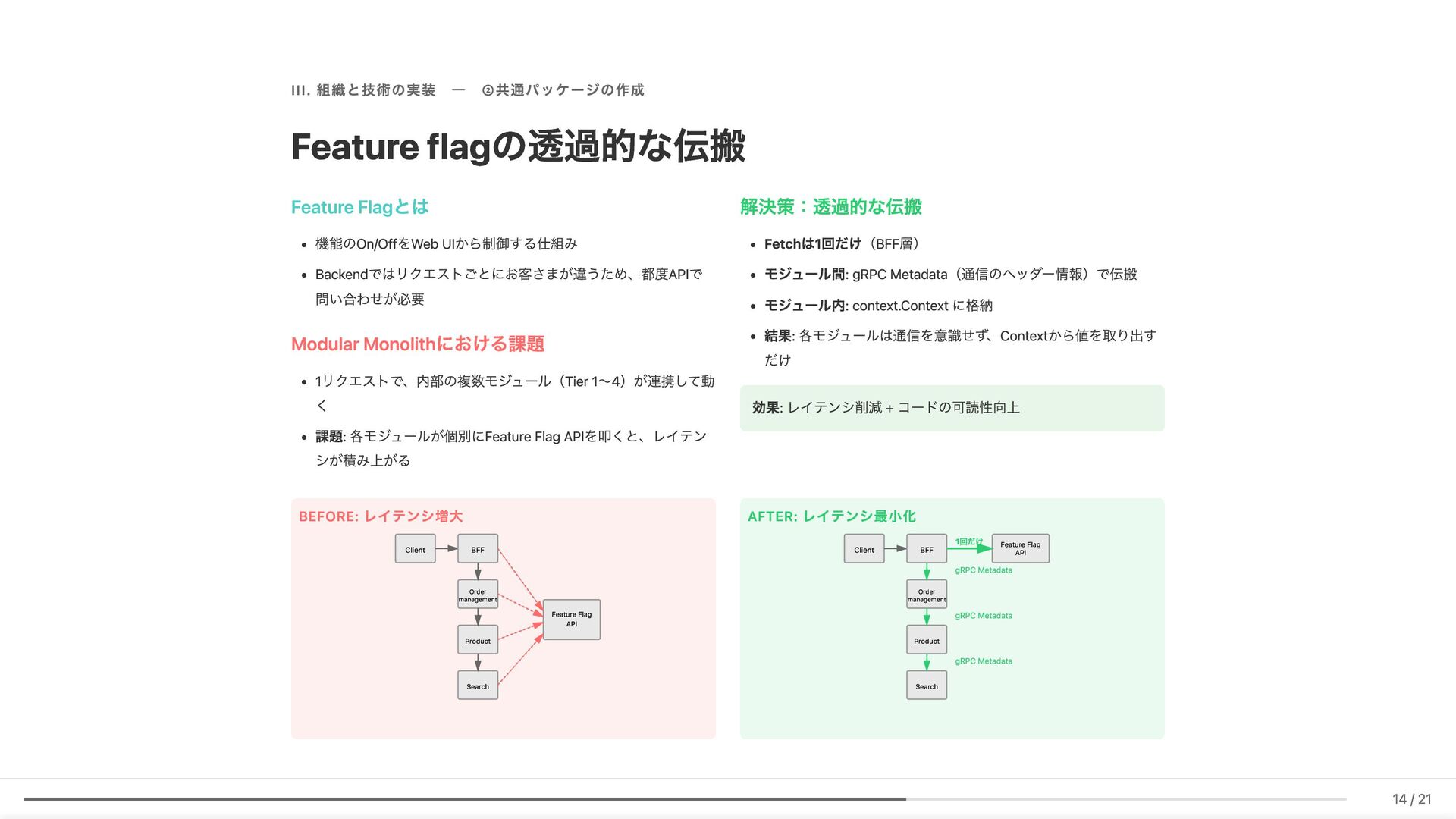 Linter作成が難しい/コストが見合わない場合の対応 具体例: 構造化エラーパッケージの遵守レビュー 古い実装パターンの検知 3. ローカル開発での自己修正ループ コード生成後、Makefileコマンド(lint, test, build等)を自動実行。AI が自らミスを発見し、修正を繰り返す 効果: 人間が介入する前に品質基準を満たしたコードが完成 4. ガイドライン作成にもAI活用 Slackでの議論をもとにAIがDraftを作成。人間は最終調整のみに集中 5. Unit Testの自動生成 Unit testガイドラインを細かくドキュメント化。AIがガイドラインに 従ってテストコードを生成 結果 新人がAIに書かせても、リーダビリティチーム準拠のコードが 出力 スケーラブルな品質管理に近づいてきていると感じています 18 / 21