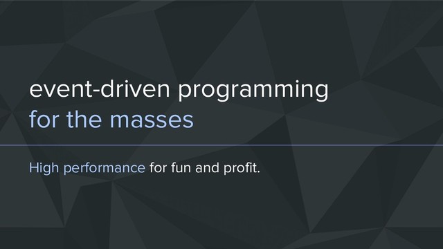 What makes nginx faster than Apache's original design? What makes Node.js applications faster than traditional web applications? How can we achieve the same benefits for our own applications? This talk discusses how event-driven programming can help in building high performance, non-blocking, reactive, concurrent, single-threaded applications (bingo). Don't worry, no need to install Node.js and npm install half the internet. Let's build high-performance applications from scratch with whatever language you're most comfortable with!