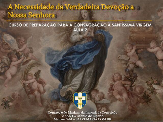 M. ❖ Glórias de Maria – Santo Afonso de Ligório ❖ Tratado da Verdadeira Devoção – São Luís Maria G. de Montfort ❖ Comentário ao Tratado da Verdadeira Devoção – Pe. Armand Plessis, S.M.M ❖ Sermões de São Bernardo para as Festas de Nossa Senhora Referências CONGREGAÇÃO MARIANA DA IMACULADA CONCEIÇÃO E S. AFONSO DE LIGÓRIO – MANAUS/AM salvemaria.com.br Curso de Consagração – Necessidade da Verdadeira Devoção