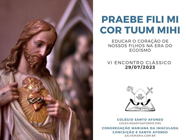 coração se alegrará contigo! Meus rins estremecerão de alegria quando teus lábios proferirem palavras retas. Que teu coração não inveje os pecadores, mas permaneça sempre no Temor do Senhor, porque então haverá certamente um futuro e tua esperança não será frustrada. Ouve, meu filho: sê sabio, dirige teu coração pelo caminho reto, Adquire a verdade e não a vendas, adquire sabedoria, instruções e inteligência. Dá-me, meu filho, o teu coração. Que teus olhos observem meus caminhos, Provérbios 23 PRAEBE FILI MI COR TUUM MIHI. EDUCAR O CORAÇÃO DE NOSSOS FILHOS NA ERA DO EGOÍSMO (29/07/23) COLÉGIO SANTO AFONSO • CONGREGAÇÃO MARIANA DA IMACULADA CONCEIÇÃO E SANTO AFONSO DE LIGÓRIO