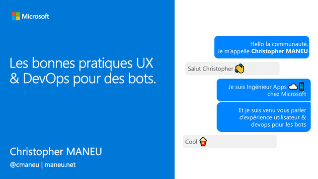 Hello la communauté, Je m’appelle Christopher MANEU Salut Christopher Je suis Ingénieur Apps chez Microsoft Et je suis venu vous parler d’expérience utilisateur & devops pour les bots Mercredi 12/04/2017 Cool