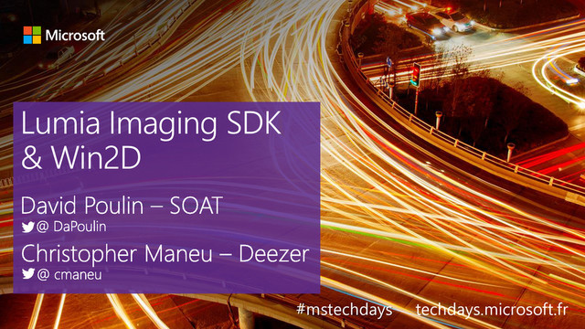Nous vous proposons pendant cette session de découvrir Win2D et la dernière version du SDK Imaging de Nokia, de survoler les différences entre GPU & CPU et voir comment, il est possible de créer une application nécessitant du traitement d'images performant. Puis, Enfin, nous verrons comment créer des interfaces graphiques impossible à réaliser en XAML via Win2D.