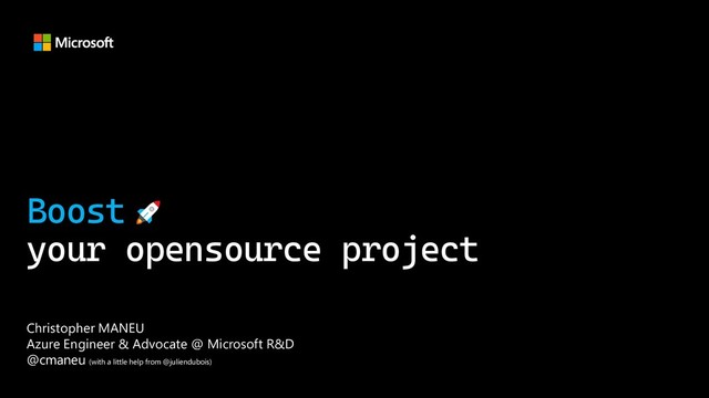 a great readme with clear value proposition ❑ Go where your community is ❑ Encourage to contribute in ALL areas (documentation, design, events, …) ❑ Get the right documentation ❑ Automate build & test to help merge pull requests quicker ❑ Automate dependency updates & security checks ❑ Automate communication & release management ❑ Create a project appealing for the future users