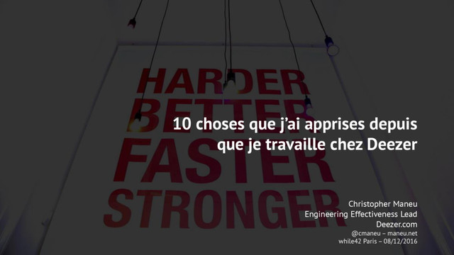 Android (Java, NDK) iOS (Objective-C, Swift) Windows (C#) Kafka Hadoop Elasticsearch And a few others (Python, Django, Erlang, C/C++, etc.) Tech Stack 3 50 100 +180 700 6 M. +43 M. 100 M. 3.5 Peta Sheep Deezer Editors Fruits per Week (Kg) Countries Dedicated Servers Paying Subscribers Titles Playlists Bytes