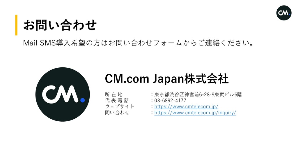 お問い合わせ CM.com Japan株式会社 所 在 地 :東京都渋⾕区神宮前6-28-9東武ビル6階 代 表 電