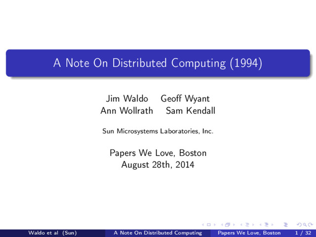 . .. . . . . .. . . . .. . . . .. . . . .. . . . . .. . . . .. . . . .. . . . .. . . . . .. . . . .. . . . .. . . . .. . . . . .. . . . .. . . . . .. . . . .. . . . .. . References II B. Charron-Bost. Concerning the size of logical clocks in distributed systems. Inf. Process. Lett., 39(1):11–16, July 1991. N. Conway, W. R. Marczak, P. Alvaro, J. M. Hellerstein, and D. Maier. Logic and lattices for distributed programming. In Proceedings of the Third ACM Symposium on Cloud Computing, SoCC ’12, pages 1:1–1:14, New York, NY, USA, 2012. ACM. S. C. Kendall, J. Waldo, A. Wollrath, and G. Wyant. A note on distributed computing. Technical report, Mountain View, CA, USA, 1994. L. Lamport. Time, clocks, and the ordering of events in a distributed system. Commun. ACM, 21(7):558–565, July 1978. Waldo et al (Sun) A Note On Distributed Computing Papers We Love, Boston 30 / 32