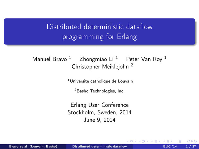 Li 1 Peter Van Roy 1 Christopher Meiklejohn 2 1Université catholique de Louvain 2Basho Technologies, Inc. Erlang User Conference Stockholm, Sweden, 2014 June 9, 2014 Bravo et al (Louvain; Basho) Distributed deterministic dataflow EUC ’14 1 / 37
