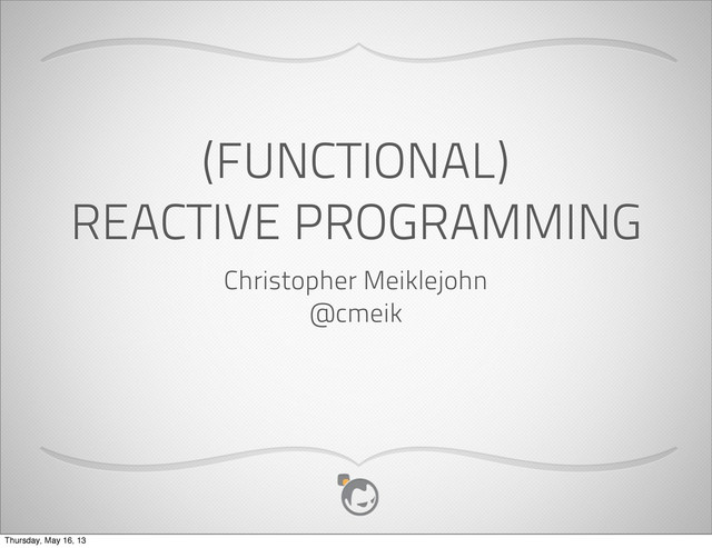 11 12 13 14 15 16 17 18 var clicks = $("h1").asEventStream("click"); clicks.onValue(function() { alert("you clicked the h1 element") }); var plus = $("#plus").asEventStream("click").map(1); var minus = $("#minus").asEventStream("click").map(-1); var both = plus.merge(minus); function add(x, y) { return x + y }; var counter = both.scan(0, add); counter.onValue(function(sum) { $("#sum").text(sum) }); function f(a, b) { console.log(a + b) } Bacon.onValues(Bacon.constant(1), Bacon.constant(2), f) Thursday, May 16, 13