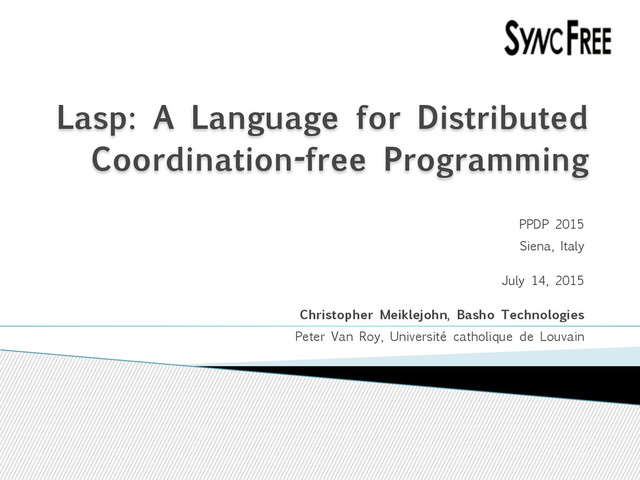 gains can be made by using synchronization only when needed; this is the goal of SyncFree (syncfree.lip6.fr) ! The Lasp programming model lets us write fault-tolerant distributed applications without synchronization in a functional style ◦ Lasp programs compose CRDTs (conflict-free replicated data types), which provide strong eventual consistency using only eventual replica-to-replica communication ! Future work ◦ Add synchronization where needed: causal consistency and transactions ◦ Add higher-order operations and abstractions for long-lived applications (deployment, reconfiguration, and software rejuvenation) ◦ Do realistic evaluations, generalize execution model (e.g., edge computing) Conclusions and future work 30