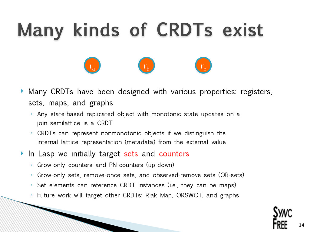 strong eventual consistency ◦ Correct replicas that deliver the same operations have equivalent state ! For the OR-set illustrated here: if (v,a,r) with a-r≠{} then v is in the set ◦ All operations cause monotonic increases in a and r; when all updates are delivered then a and r are the same at all replicas, so all agree on membership of v Conflict-free replicated set r a r b r c add(1) add(1) (1,{α},{}) (1,{β},{}) remove(1) (1,{β},{β}) (1,{α,β},{β}) (1,{α,β},{β}) (1,{α,β},{β}) (1,{β},{}) « 1 is in the set » « 1 is in the set » « 1 is in the set » 13 merge merge merge merge