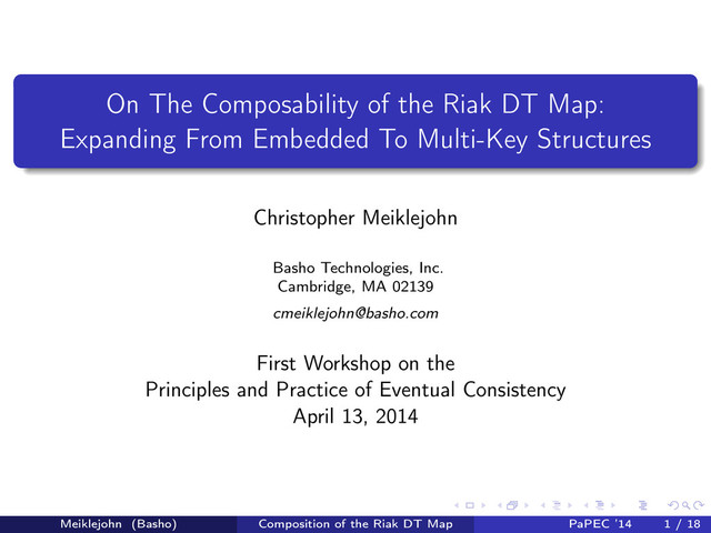H. Katz. Understanding tcp incast and its implications for big data workloads. Technical Report UCB/EECS-2012-40, EECS Department, University of California, Berkeley, Apr 2012. C. Hale and R. Kennedy. Riak and Scala at Yammer. http://vimeo.com/21598799 . W. Moss and T. Douglas. Building A Transaction Logs-based Protocol On Riak. http://vimeo.com/53550624 . Meiklejohn (Basho) Composition of the Riak DT Map PaPEC ’14 18 / 18
