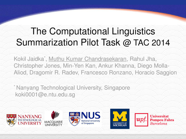 This was a team work that I presented at the Text Analysis Conference (TAC) 2014 held in the National Institute of Standards and Technology (NIST), Maryland, USA.