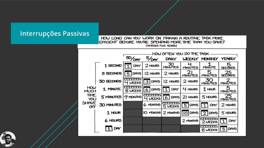 No dia-a-dia de um projeto de desenvolvimento de software, temos além da escrita regular de código, muitas outras tarefas como se conectar a uma VPN; atualizar e integrar código; se conectar e fazer consultas em DBs; configurar ambiente de desenvolvimento ou teste; além de investigar problemas. Quando somado, o tempo gasto nessas tarefas é considerável.