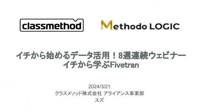 2024年03月21日開催のクラスメソッド株式会社と株式会社メソドロジックの共催イベント『【毎週開催】メソドロジック社共催!イチから始めるデータ活用!8週連続ウェビナー』の第5回開催回である「イチから学ぶFivetran」の発表資料です。