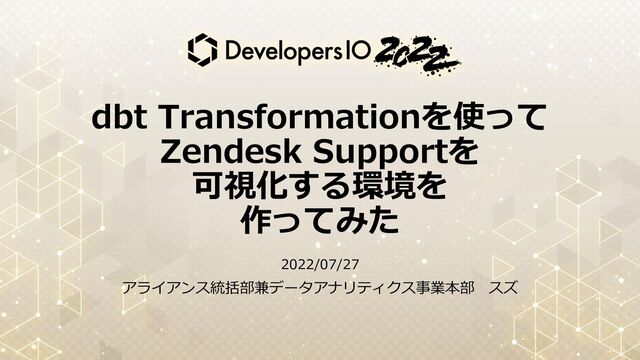 dbt Transformationを使って Zendesk Supportを 可視化する環境を 作ってみた 2022/07/27 アライアンス統括部兼データアナリティクス事業本部 スズ