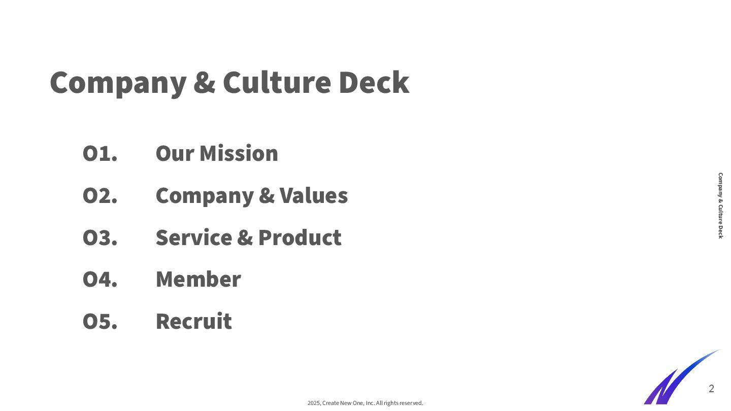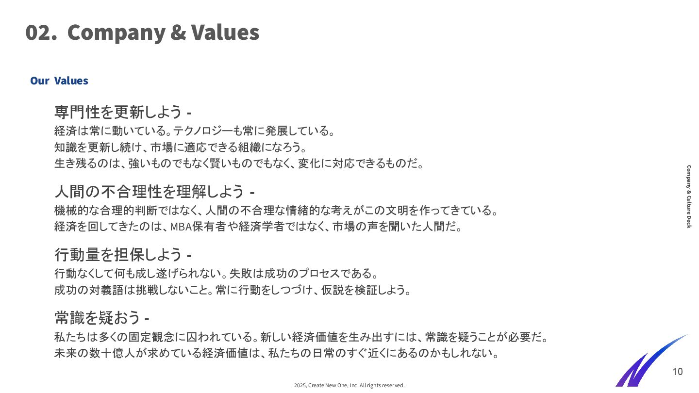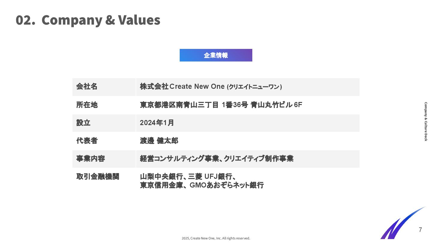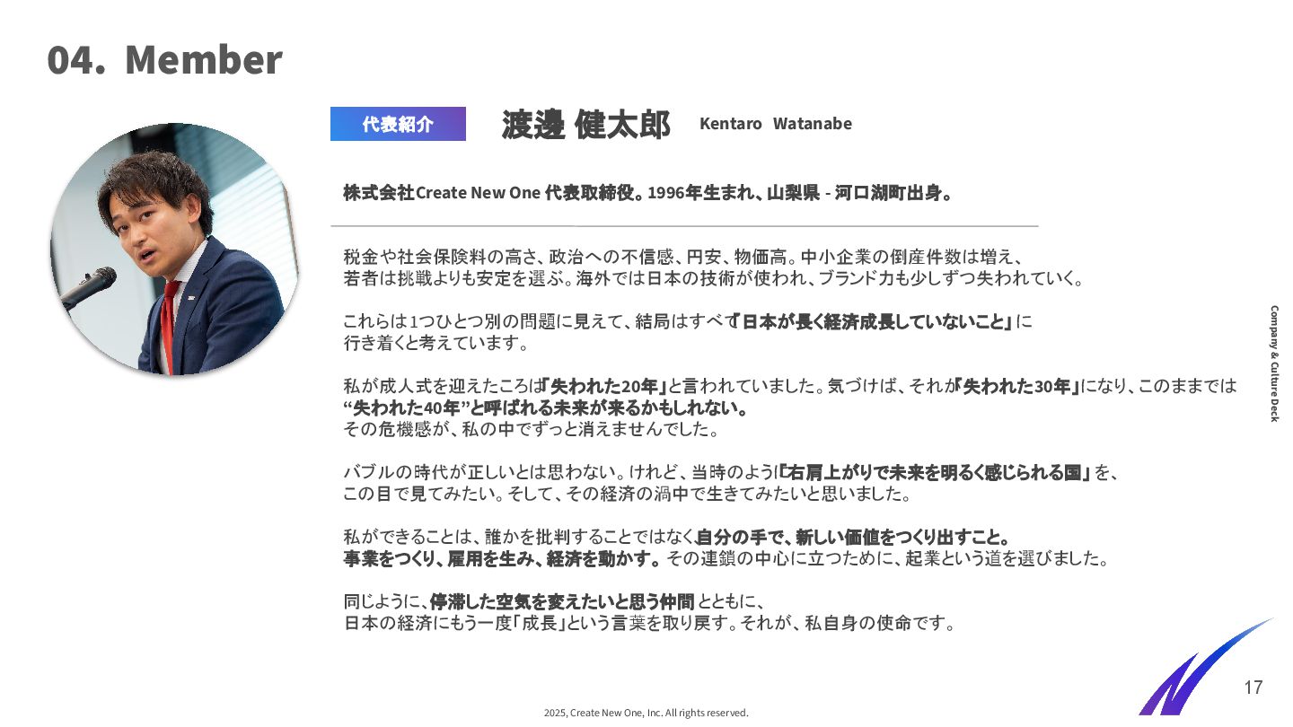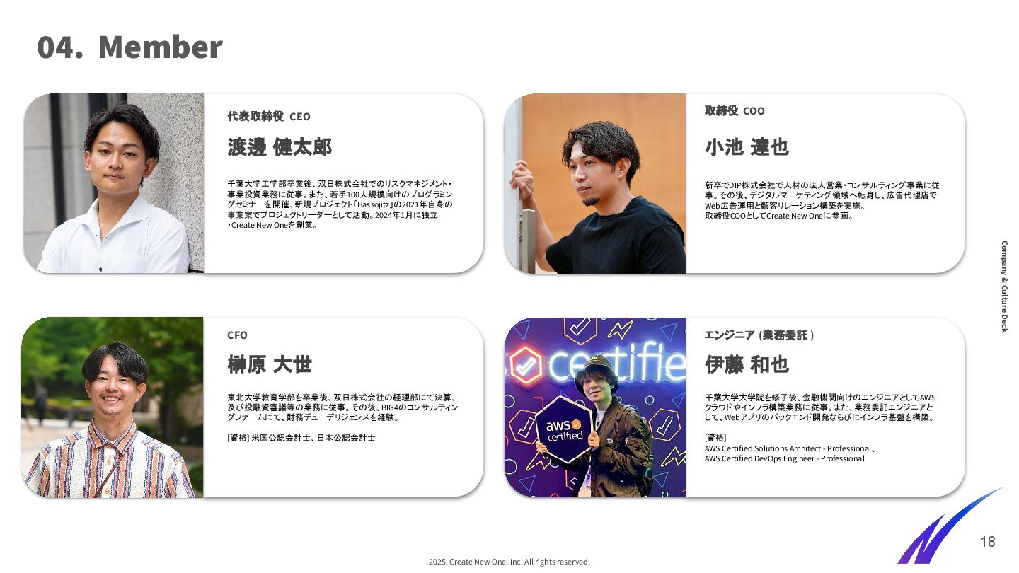 & Culture Deck 04. Member 渡邊 健太郎 代表取締役 CEO 小池 達也 取締役 COO 榊原 大世 CFO 伊藤 和也 エンジニア (業務委託 ) 東北大学教育学部を卒業後、双日株式会社の経理部にて決算、 及び投融資審議等の業務に従事。その後、BIG4のコンサルティン グファームにて、財務デューデリジェンスを経験。 [資格] 米国公認会計士、日本公認会計士 千葉大学大学院を修了後、金融機関向けのエンジニアとしてAWS クラウドやインフラ構築業務に従事。また、業務委託エンジニアと して、Webアプリのバックエンド開発ならびにインフラ基盤を構築。 [資格] AWS Certified Solutions Architect - Professional、 AWS Certified DevOps Engineer - Professional 千葉大学工学部卒業後、双日株式会社でのリスクマネジメント・ 事業投資業務に従事。また、若手100人規模向けのプログラミン グセミナーを開催、新規プロジェクト「Hassojitz」の2021年自身の 事業案でプロジェクトリーダーとして活動。2024年1月に独立 ・Create New Oneを創業。 新卒でDIP株式会社で人材の法人営業・コンサルティング事業に従 事。その後、デジタルマーケティング領域へ転身し、広告代理店で Web広告運用と顧客リレーション構築を実施。 取締役COOとしてCreate New Oneに参画。