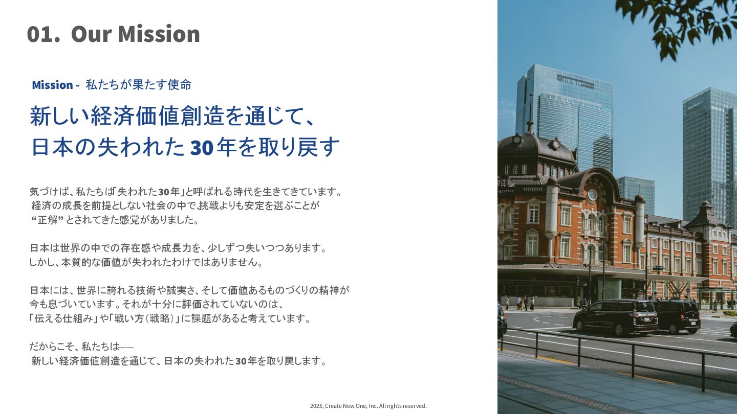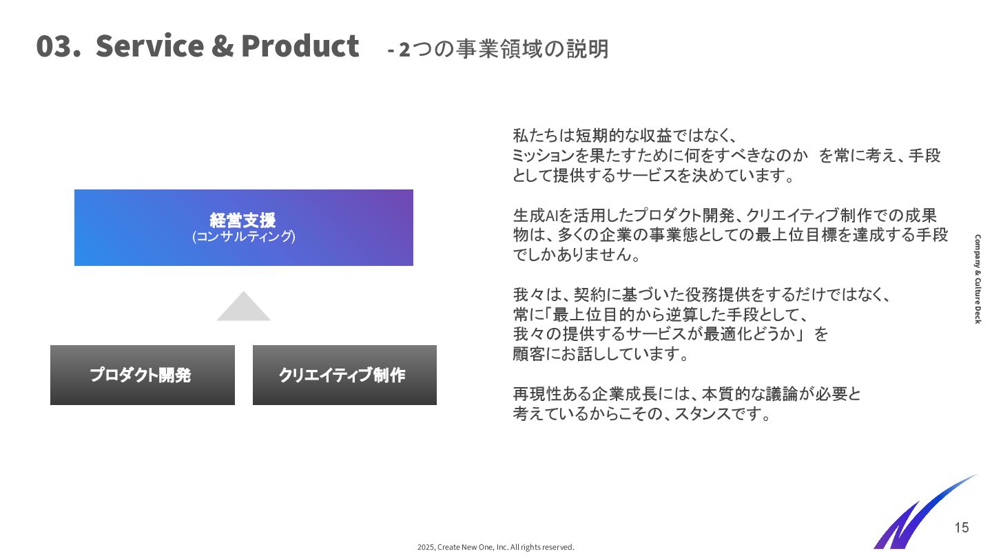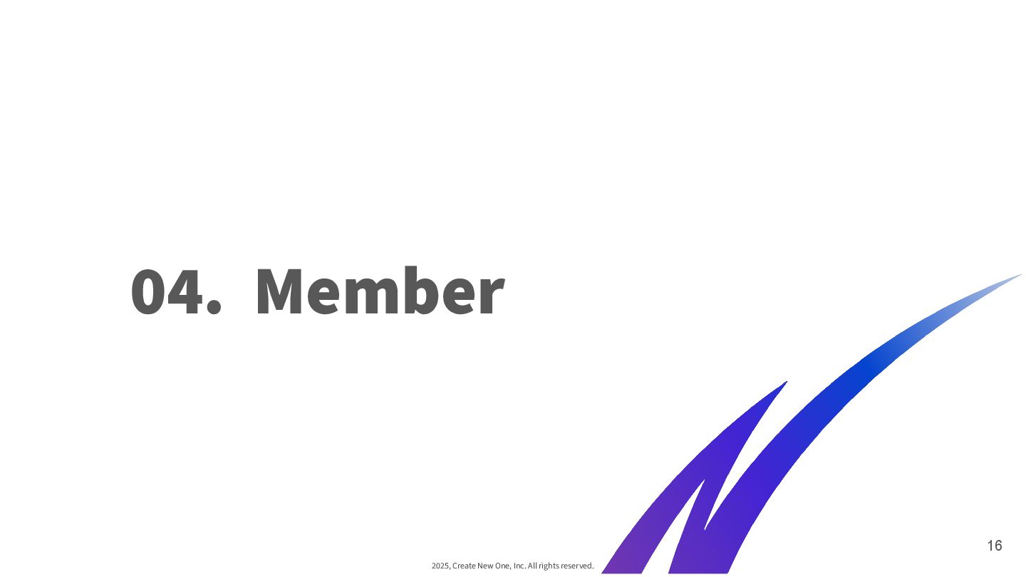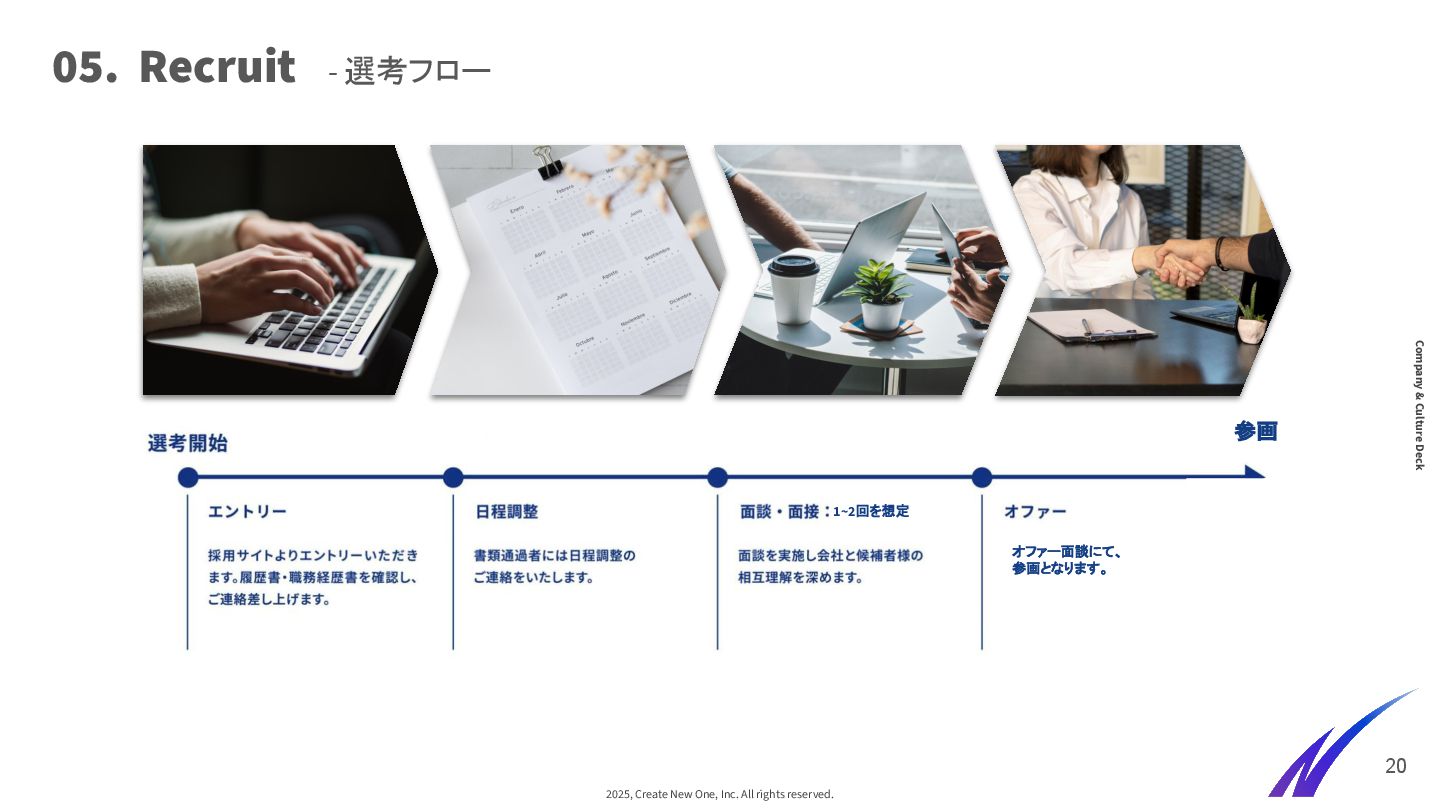 & Culture Deck 04. Member 渡邊 健太郎 代表取締役 CEO 小池 達也 取締役 COO 榊原 大世 CFO 伊藤 和也 エンジニア (業務委託 ) 東北大学教育学部を卒業後、双日株式会社の経理部にて決算、 及び投融資審議等の業務に従事。その後、BIG4のコンサルティン グファームにて、財務デューデリジェンスを経験。 [資格] 米国公認会計士、日本公認会計士 千葉大学大学院を修了後、金融機関向けのエンジニアとしてAWS クラウドやインフラ構築業務に従事。また、業務委託エンジニアと して、Webアプリのバックエンド開発ならびにインフラ基盤を構築。 [資格] AWS Certified Solutions Architect - Professional、 AWS Certified DevOps Engineer - Professional 千葉大学工学部卒業後、双日株式会社でのリスクマネジメント・ 事業投資業務に従事。また、若手100人規模向けのプログラミン グセミナーを開催、新規プロジェクト「Hassojitz」の2021年自身の 事業案でプロジェクトリーダーとして活動。2024年1月に独立 ・Create New Oneを創業。 新卒でDIP株式会社で人材の法人営業・コンサルティング事業に従 事。その後、デジタルマーケティング領域へ転身し、広告代理店で Web広告運用と顧客リレーション構築を実施。 取締役COOとしてCreate New Oneに参画。