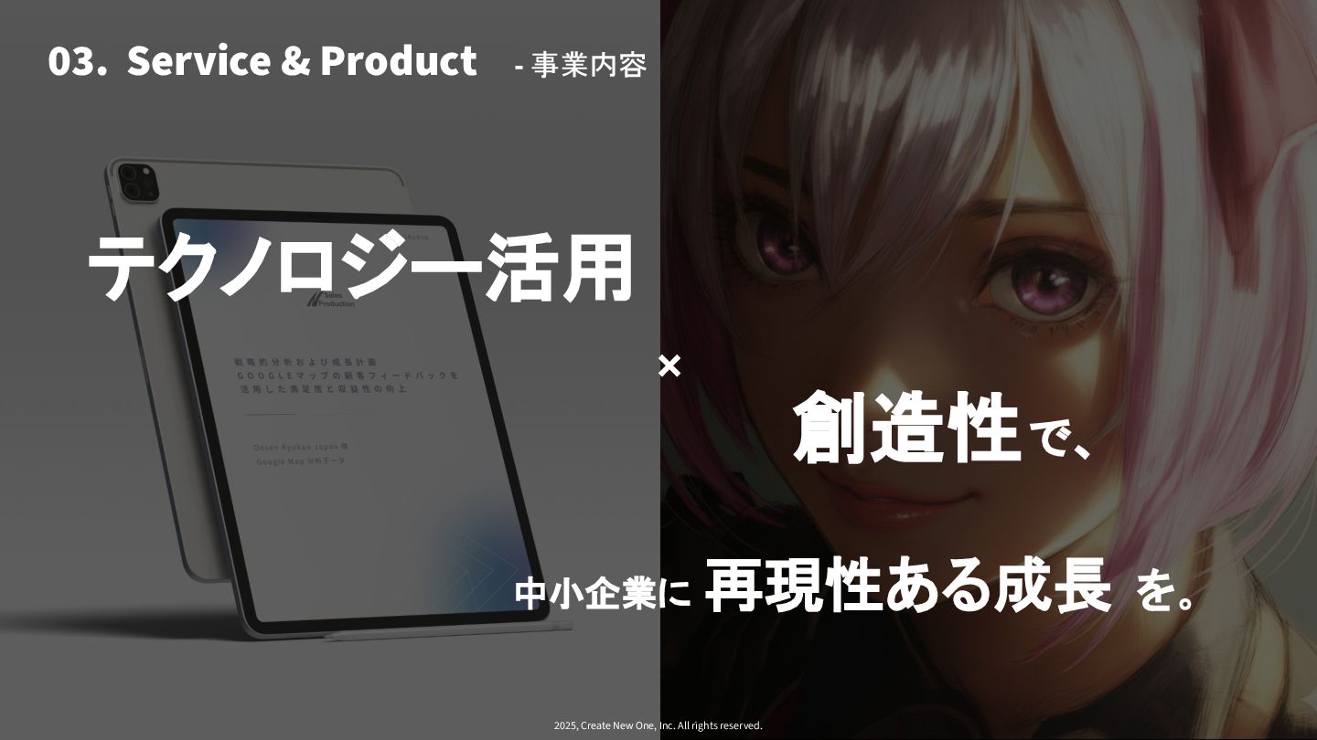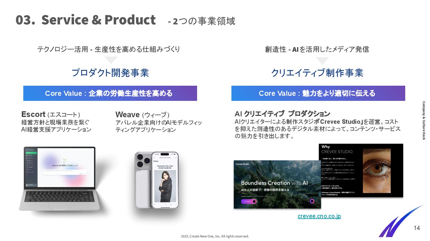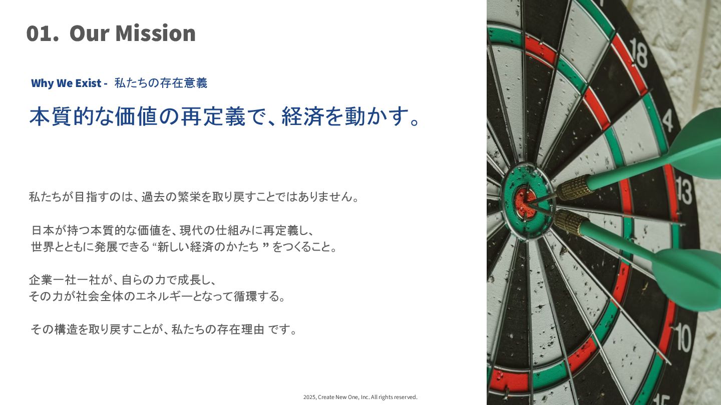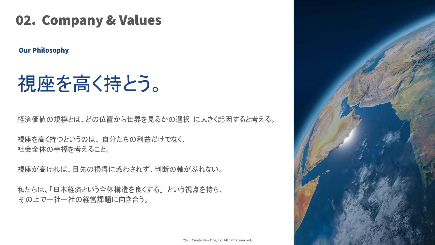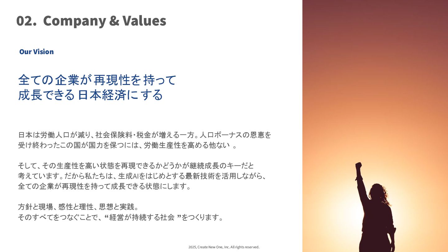 & Culture Deck 04. Member 渡邊 健太郎 代表取締役 CEO 小池 達也 取締役 COO 榊原 大世 CFO 伊藤 和也 エンジニア (業務委託 ) 東北大学教育学部を卒業後、双日株式会社の経理部にて決算、 及び投融資審議等の業務に従事。その後、BIG4のコンサルティン グファームにて、財務デューデリジェンスを経験。 [資格] 米国公認会計士、日本公認会計士 千葉大学大学院を修了後、金融機関向けのエンジニアとしてAWS クラウドやインフラ構築業務に従事。また、業務委託エンジニアと して、Webアプリのバックエンド開発ならびにインフラ基盤を構築。 [資格] AWS Certified Solutions Architect - Professional、 AWS Certified DevOps Engineer - Professional 千葉大学工学部卒業後、双日株式会社でのリスクマネジメント・ 事業投資業務に従事。また、若手100人規模向けのプログラミン グセミナーを開催、新規プロジェクト「Hassojitz」の2021年自身の 事業案でプロジェクトリーダーとして活動。2024年1月に独立 ・Create New Oneを創業。 新卒でDIP株式会社で人材の法人営業・コンサルティング事業に従 事。その後、デジタルマーケティング領域へ転身し、広告代理店で Web広告運用と顧客リレーション構築を実施。 取締役COOとしてCreate New Oneに参画。