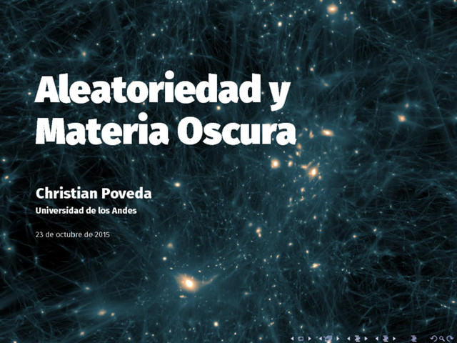 . . . . . . . . . . . . . . . . . . . . . . . . . . . . . . ¿Por qué materia oscura? Forma de la materia oscura Midiendo la concentración Nuestro trabajo Conclusiones | En Física y Economía Aquellos que minimizan χ2(p1, ..., pn ) = ∑ i ( f(xi ; p1, ..., pn ) − yi σi ) 2 Definamos L(p1, ..., pn ) ∝ exp ( − χ2(p1, ..., pn ) 2 ) Hagamos una caminata aleatoria sobre p1, ..., pn cuyo histograma tienda a L(p1, ..., pn ) con MCMC Aleatoriedad y Materia Oscura 31/37