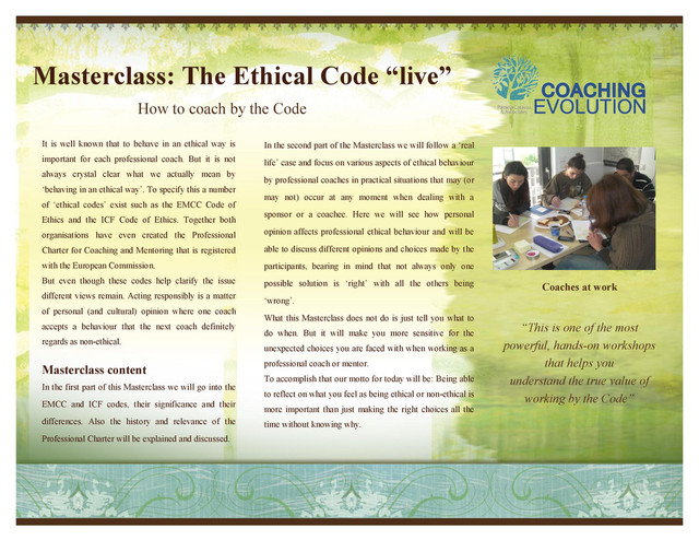 Code It is well known that to behave in an ethical way is important for each professional coach. But it is not always crystal clear what we actually mean by ‘behaving in an ethical way’. To specify this a number of ‘ethical codes’ exist such as the EMCC Code of Ethics and the ICF Code of Ethics. Together both organisations have even created the Professional Charter for Coaching and Mentoring that is registered with the European Commission. But even though these codes help clarify the issue different views remain. Acting responsibly is a matter of personal (and cultural) opinion where one coach accepts a behaviour that the next coach definitely regards as non-ethical. Masterclass content In the first part of this Masterclass we will go into the EMCC and ICF codes, their significance and their differences. Also the history and relevance of the Professional Charter will be explained and discussed. In the second part of the Masterclass we will follow a ‘real life’ case and focus on various aspects of ethical behaviour by professional coaches in practical situations that may (or may not) occur at any moment when dealing with a sponsor or a coachee. Here we will see how personal opinion affects professional ethical behaviour and will be able to discuss different opinions and choices made by the participants, bearing in mind that not always only one possible solution is ‘right’ with all the others being ‘wrong’. What this Masterclass does not do is just tell you what to do when. But it will make you more sensitive for the unexpected choices you are faced with when working as a professional coach or mentor. To accomplish that our motto for today will be: Being able to reflect on what you feel as being ethical or non-ethical is more important than just making the right choices all the time without knowing why. “This is one of the most powerful, hands-on workshops that helps you understand the true value of working by the Code” Coaches at work