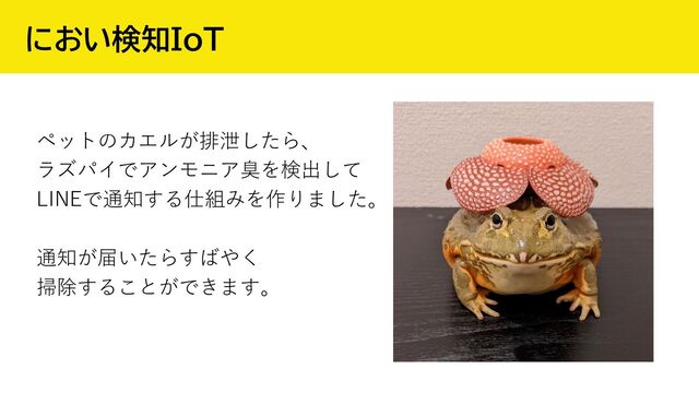 におい検知IoT ペットのカエルが排泄したら、 ラズパイでアンモニア臭を検出して LINEで通知する仕組みを作りました。 通知が届いたらすばやく 掃除することができます。