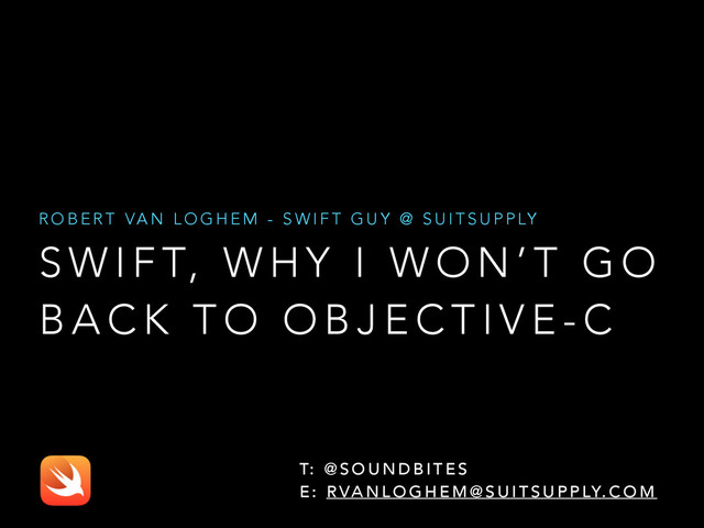 Robert van Loghem has been programming since he was 13 years old in Turbo Pascal, after doing over a decade of backend development in Java, and some Scala, he started developing Objective-C iOS apps in 2010 for NS and a little bit of ProRail. Now in 2015 he’s doing 100% Swift at Suitsupply.